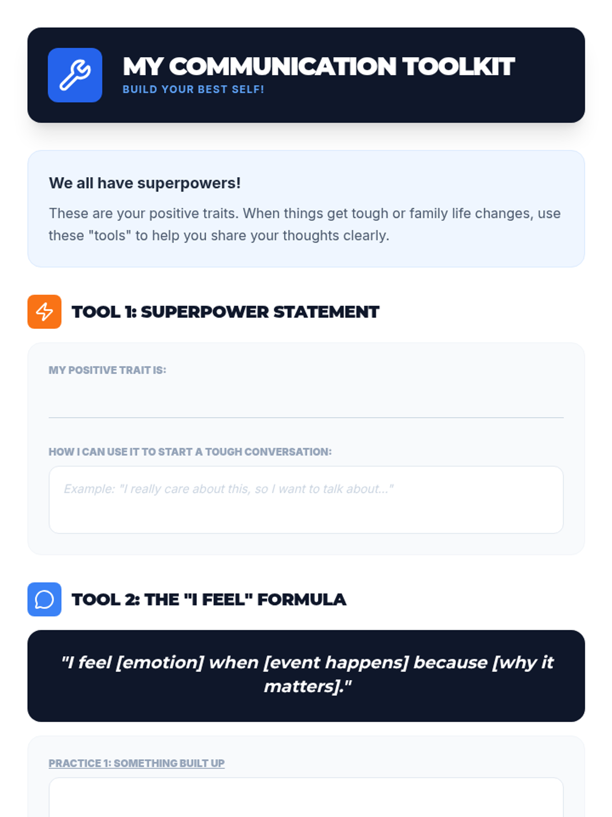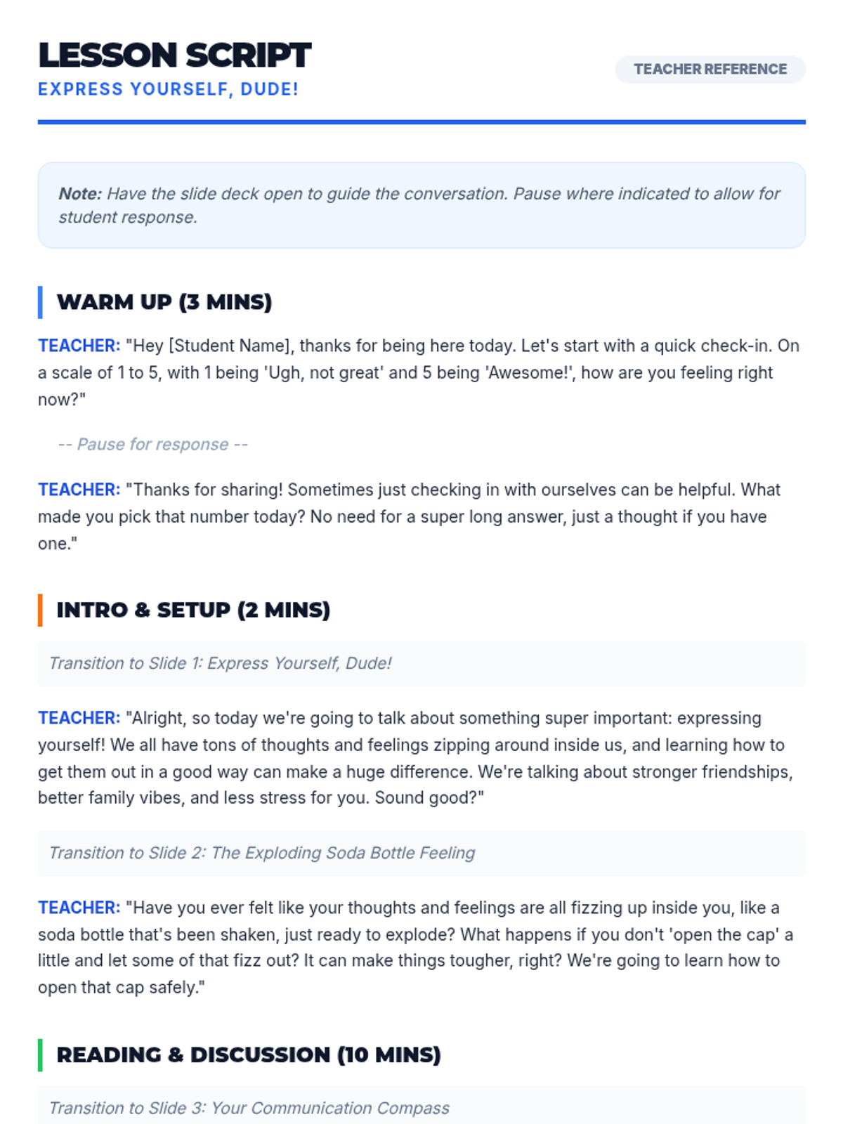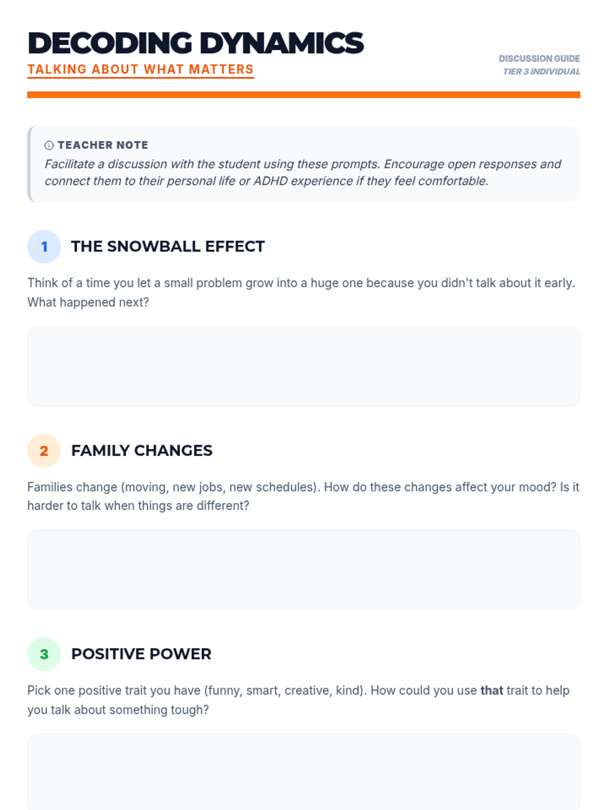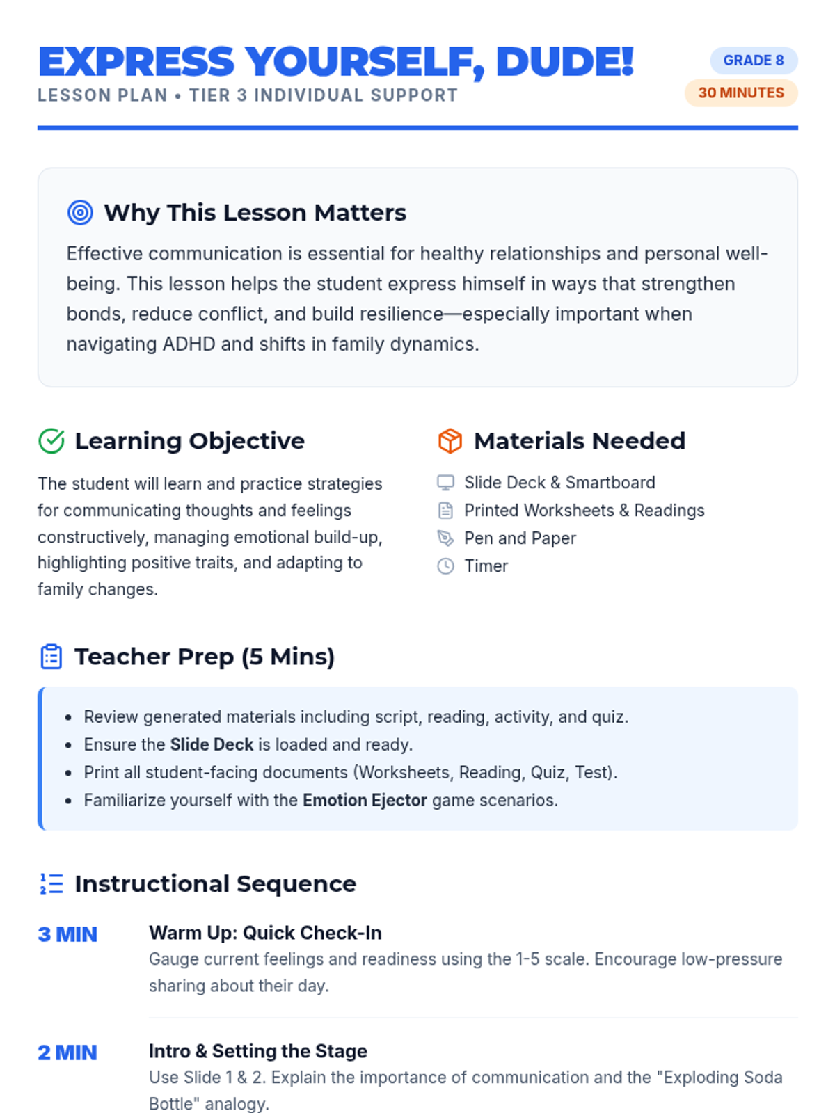 This 30-minute Tier 3 individual lesson for an 8th-grade male with ADHD focuses on developing healthy communication skills, managing emotional build-up, and adapting to changing family dynamics. It uses interactive discussions, role-playing, and reflective activities to foster stronger relationships and personal well-being.
