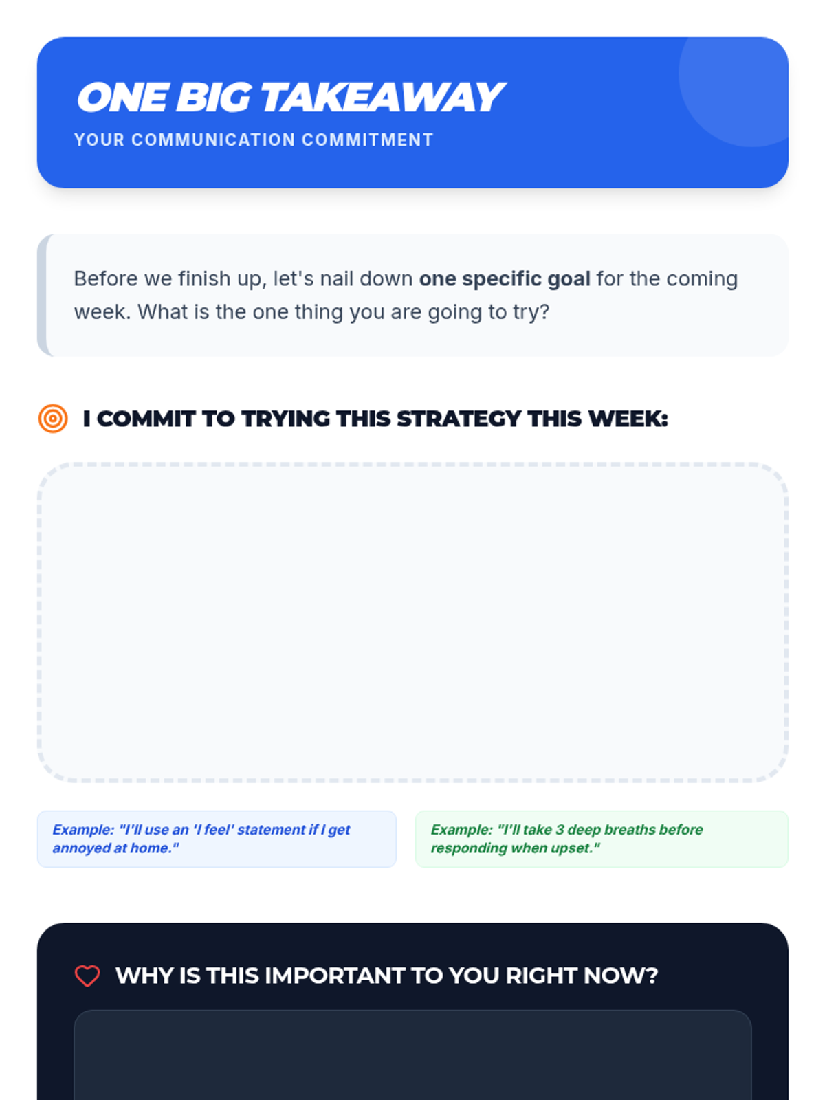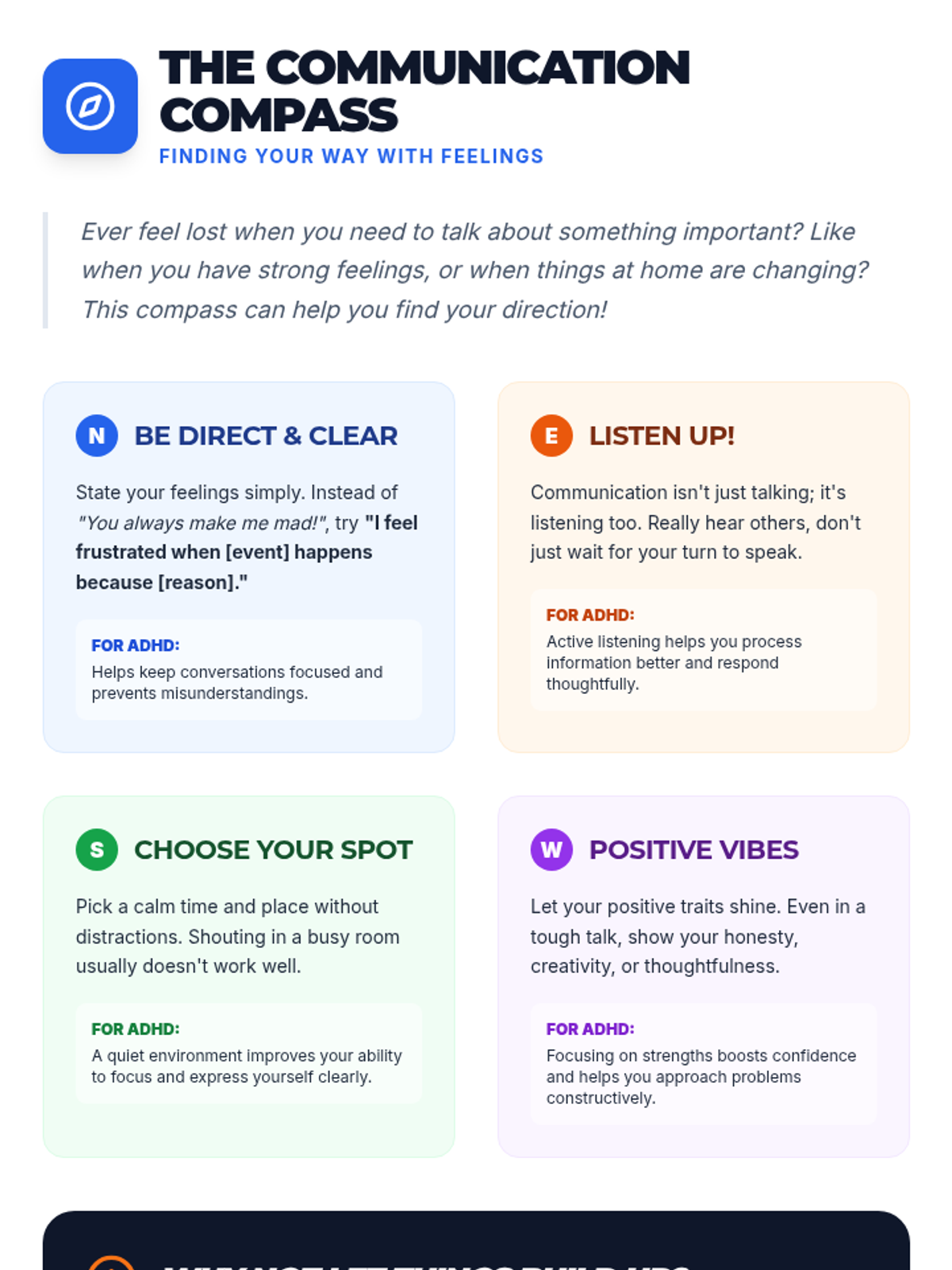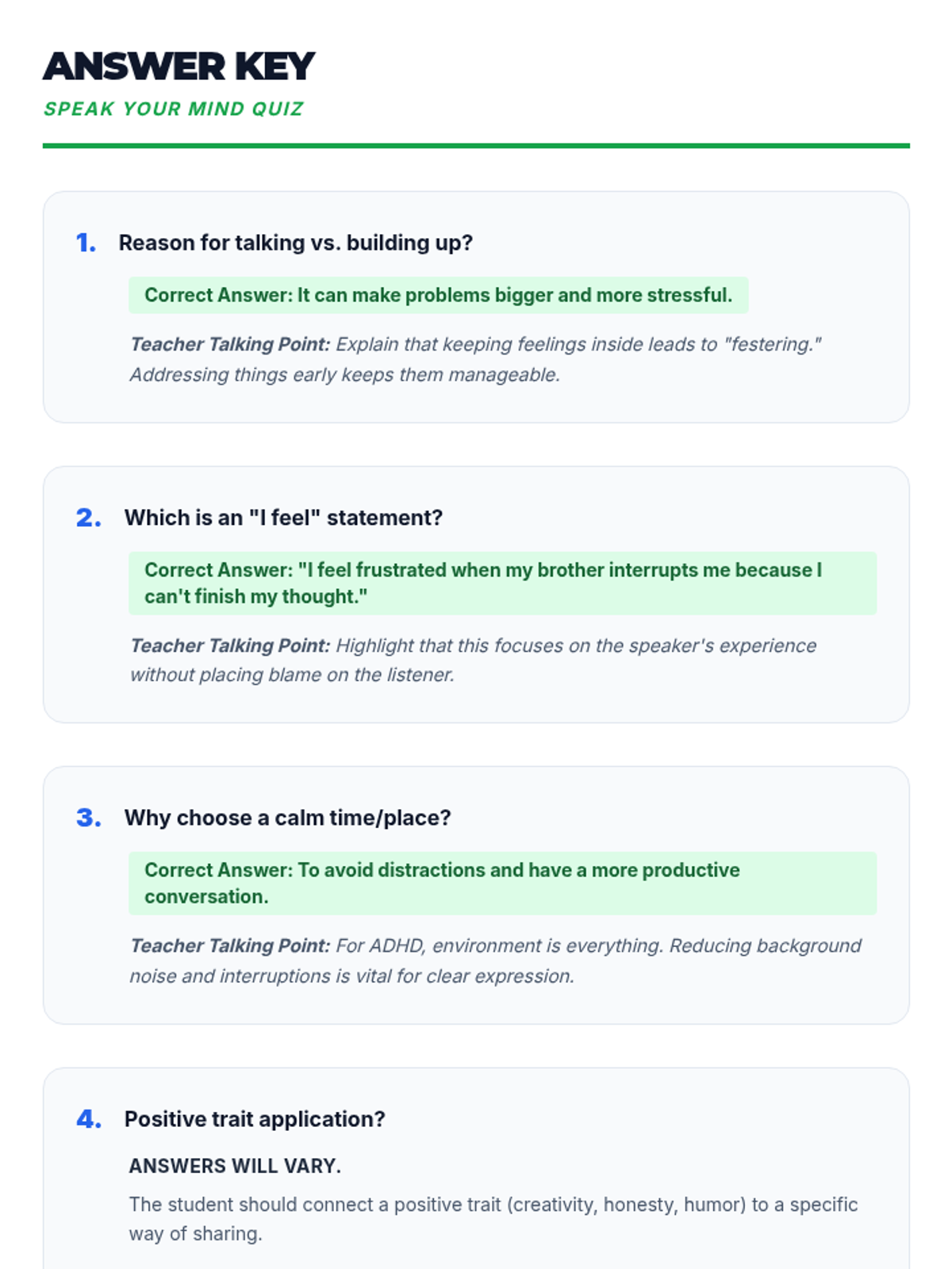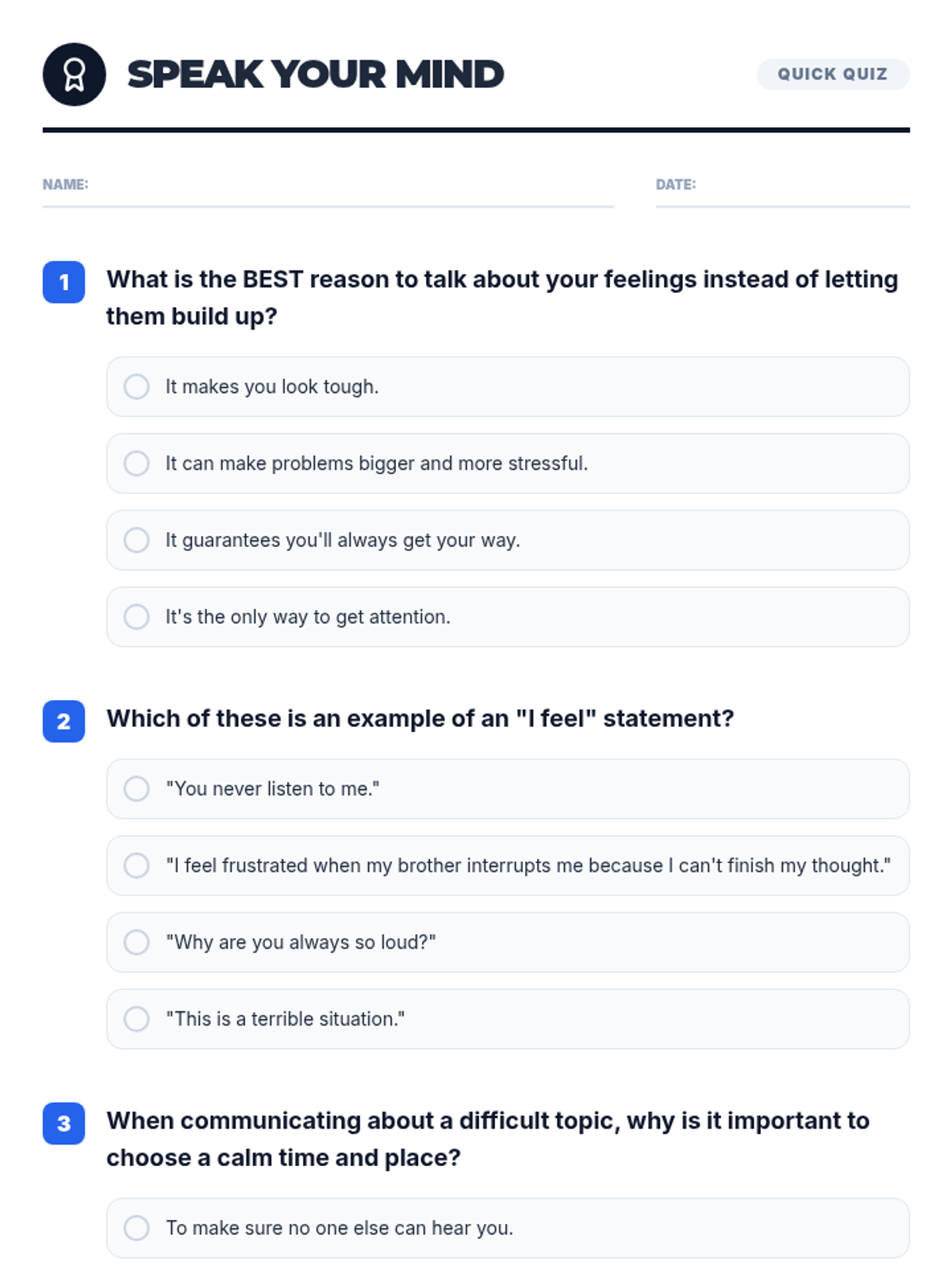 This 30-minute Tier 3 individual lesson for an 8th-grade male with ADHD focuses on developing healthy communication skills, managing emotional build-up, and adapting to changing family dynamics. It uses interactive discussions, role-playing, and reflective activities to foster stronger relationships and personal well-being.