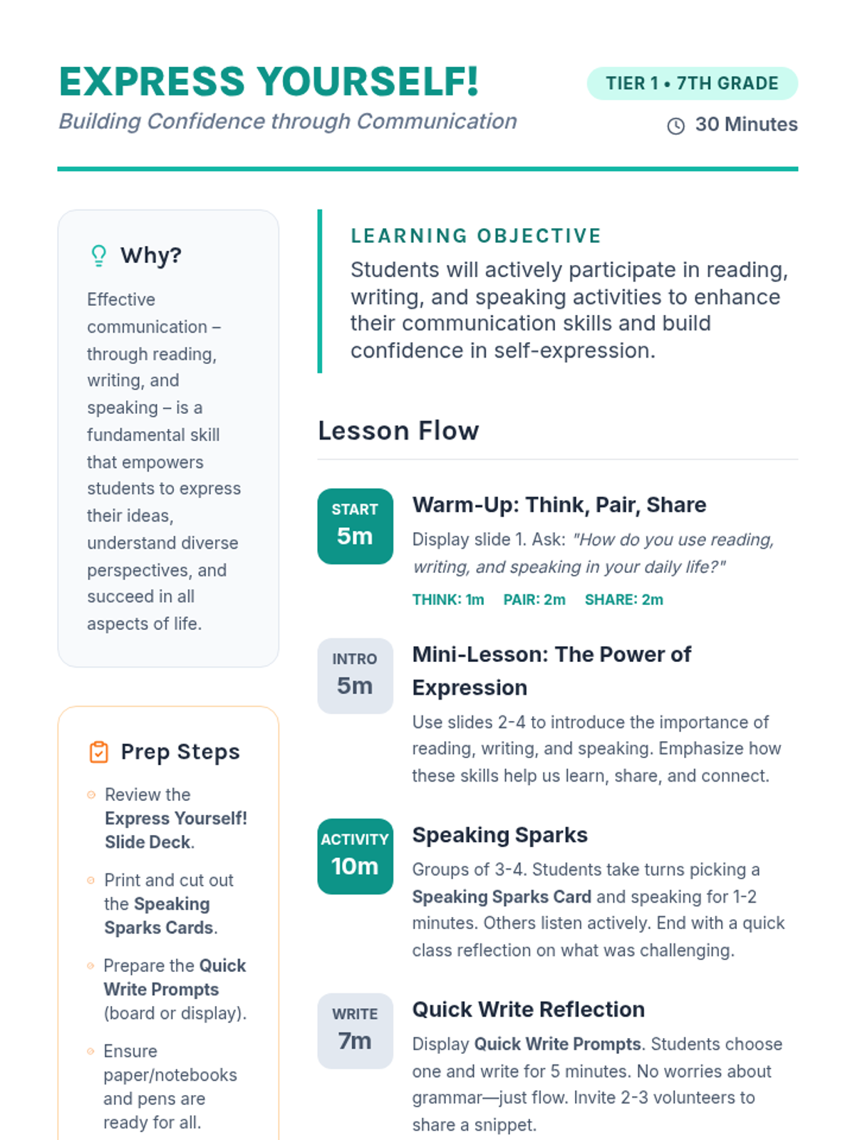 This engaging 30-minute lesson for 7th-grade students encourages active participation in reading, writing, and speaking to build confidence and communication skills.