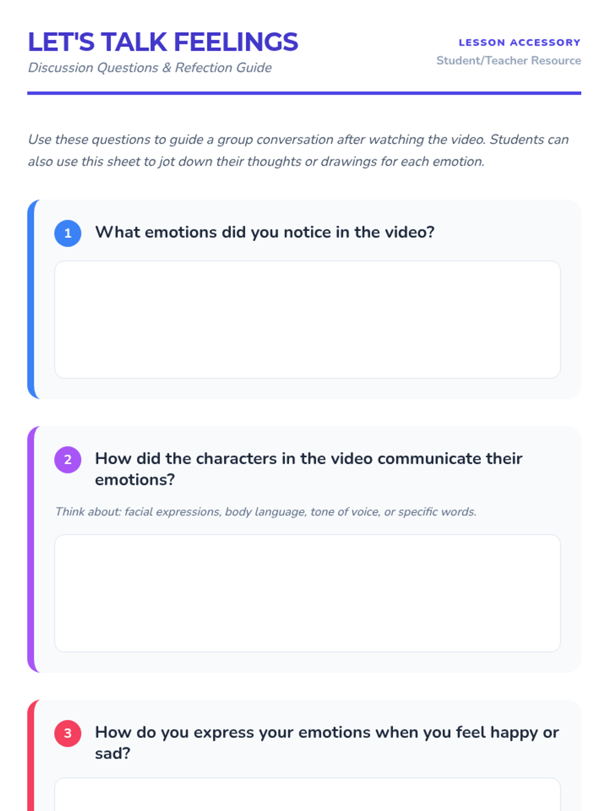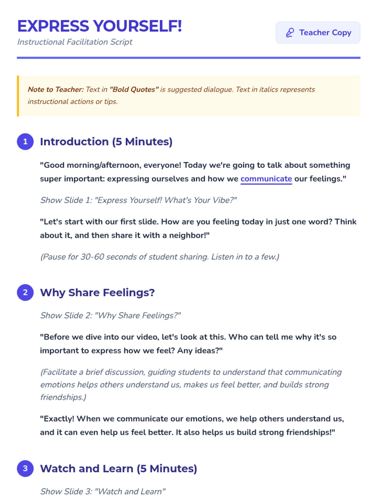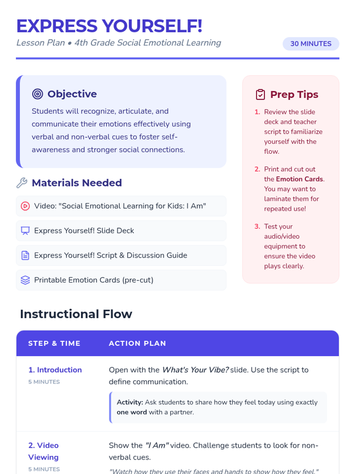 A 30-minute interactive lesson for 4th graders focused on recognizing and communicating emotions through video, discussion, and a charades-style game. Students learn why expressing feelings is vital for healthy relationships and self-awareness.