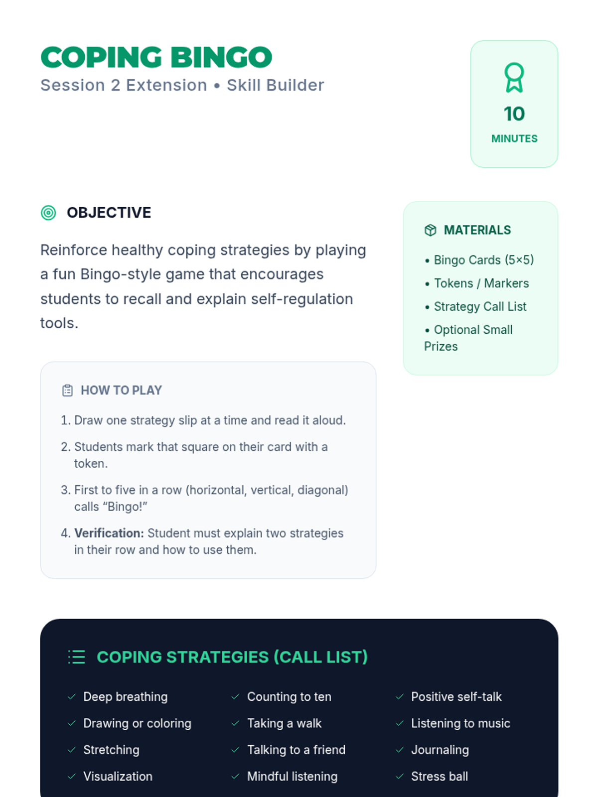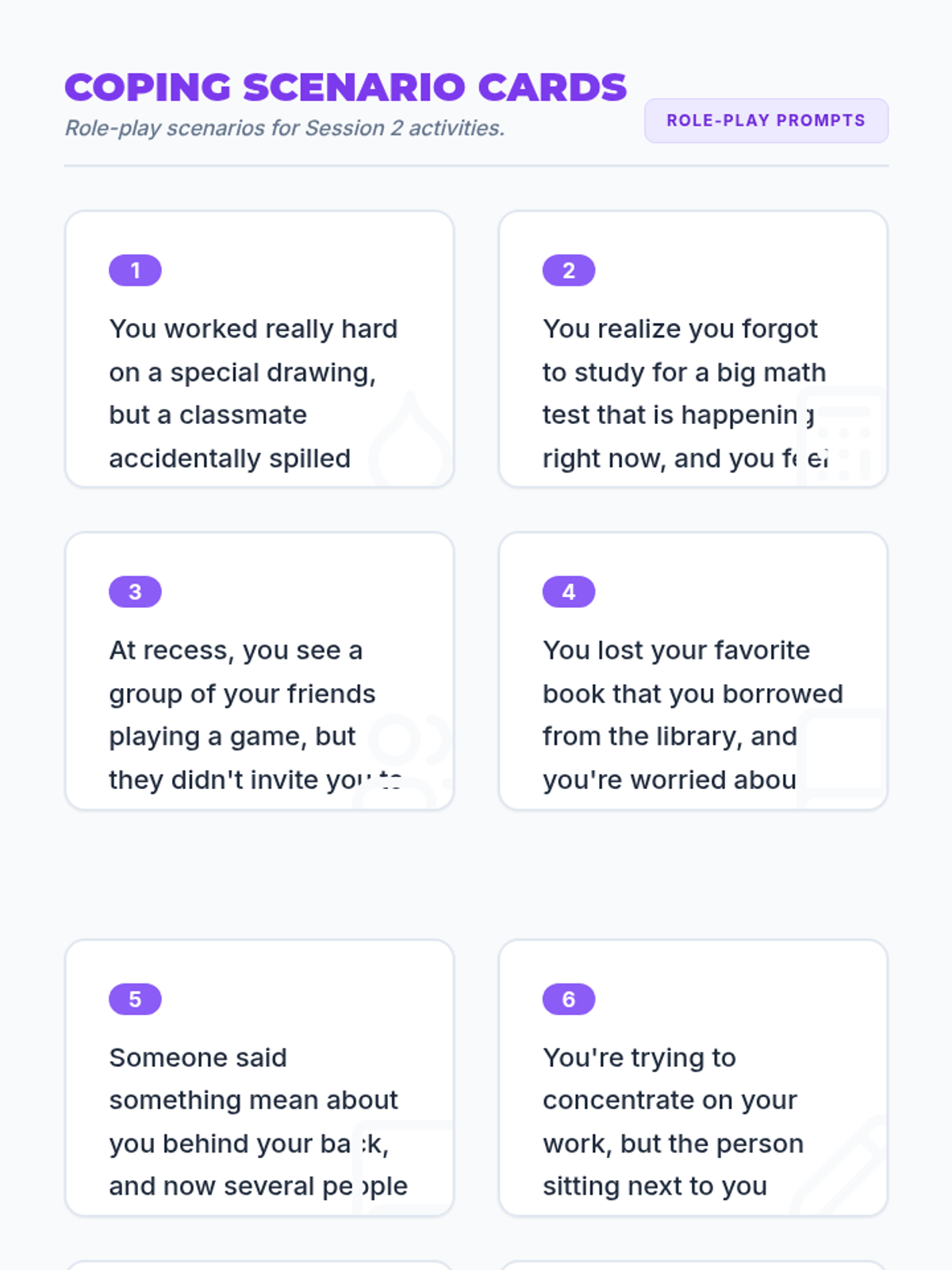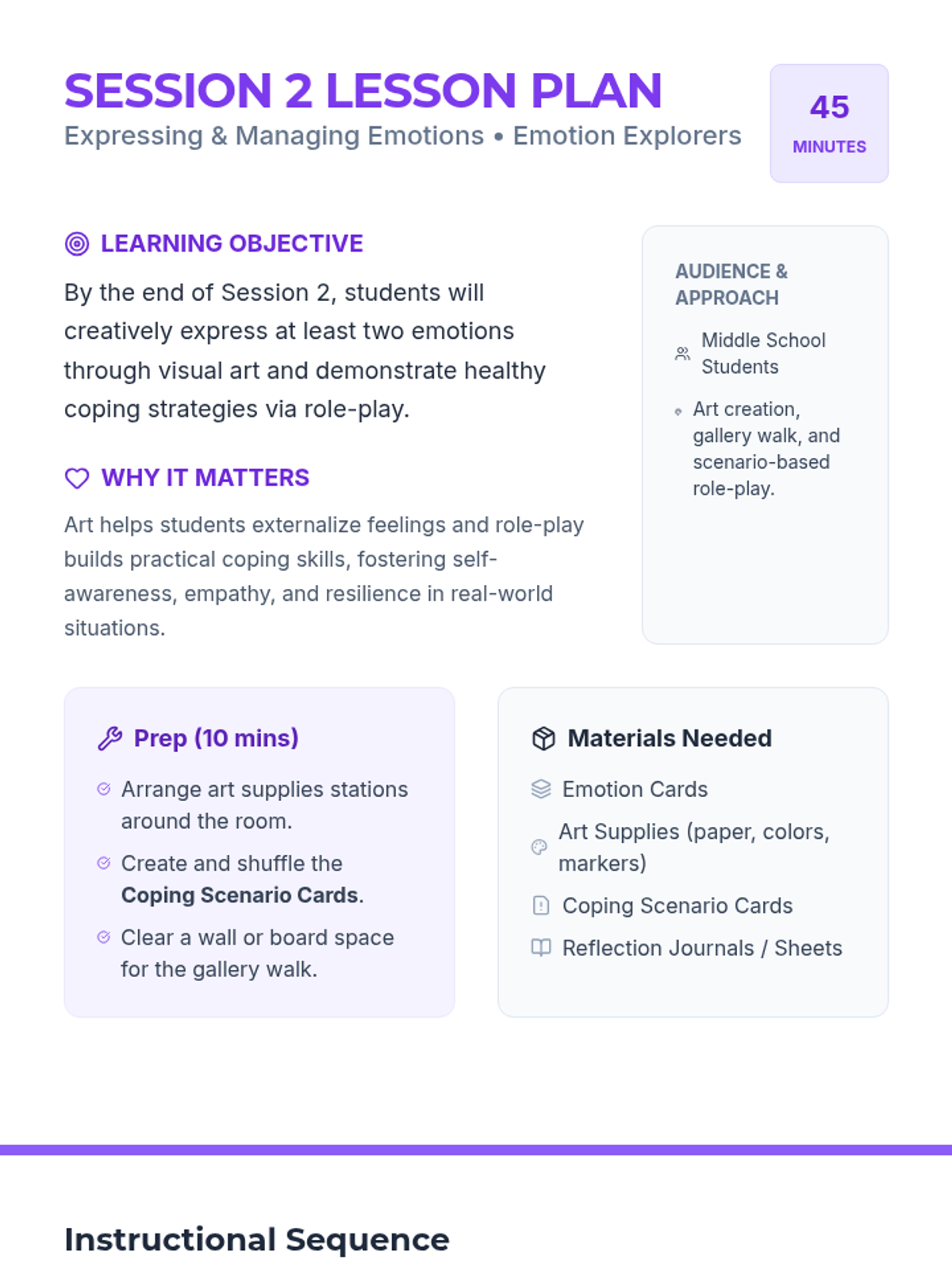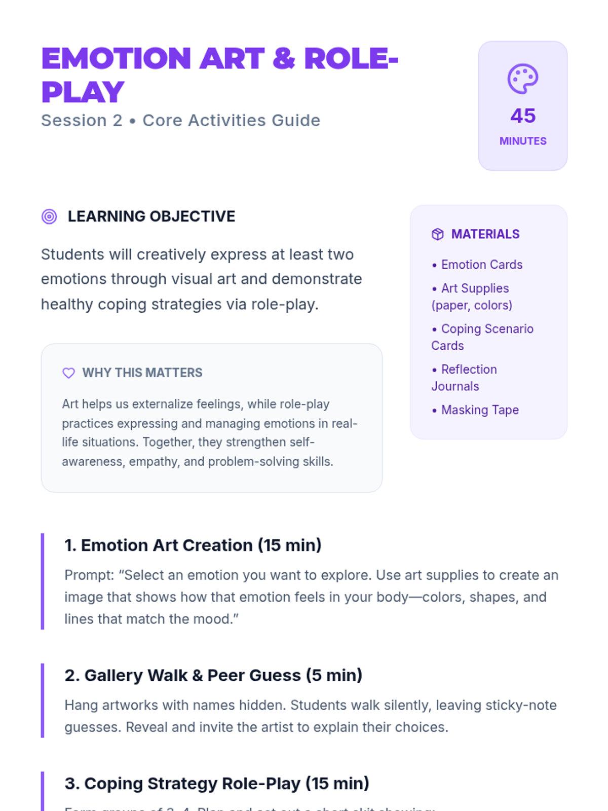Explores creative expression through art and practices healthy coping mechanisms through scenario-based role-play activities.