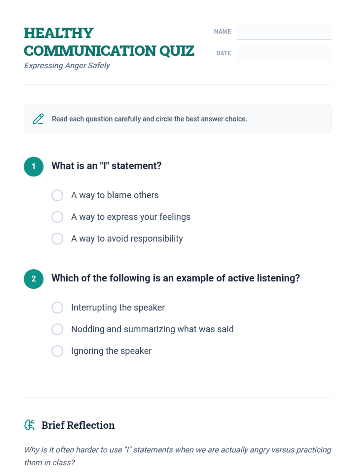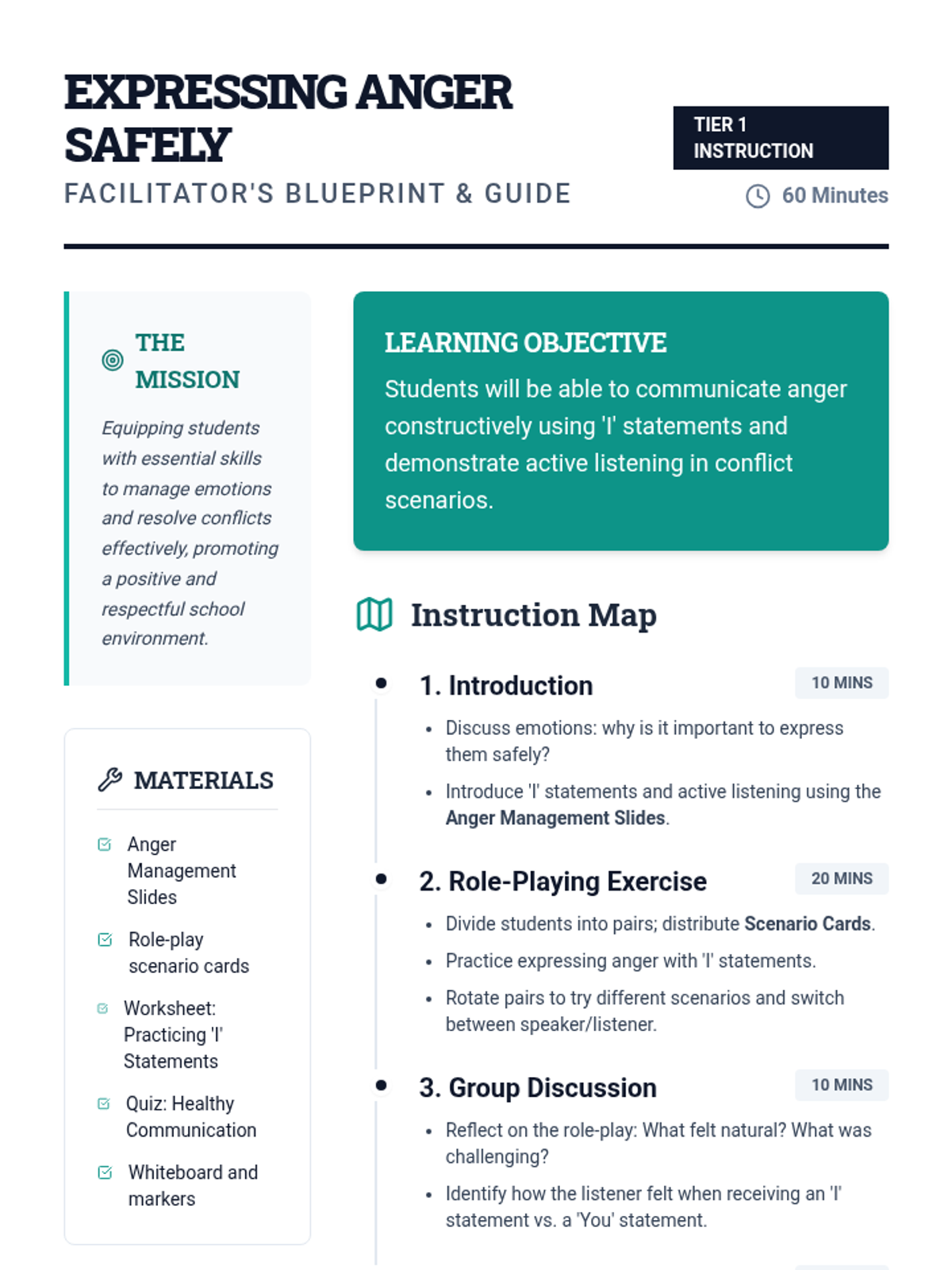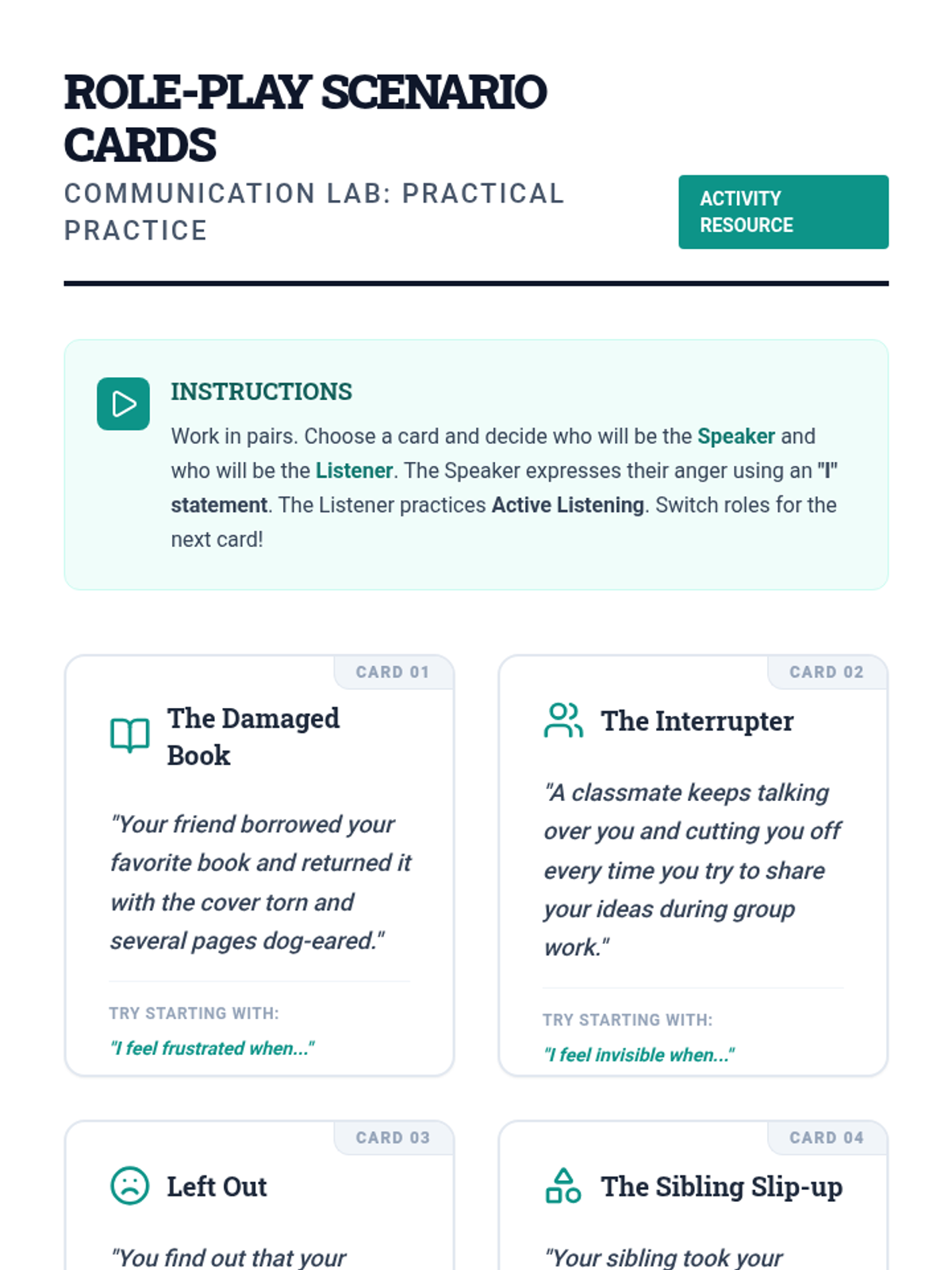 This lesson teaches middle school students how to express anger constructively using 'I' statements and active listening through role-play and reflective activities.