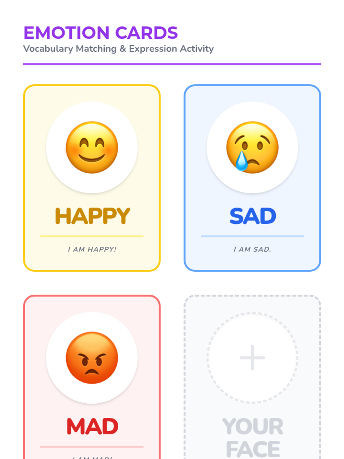 Students identify and name basic feelings (happy, sad, mad) using emoji cards and mirrors to practice facial expressions.