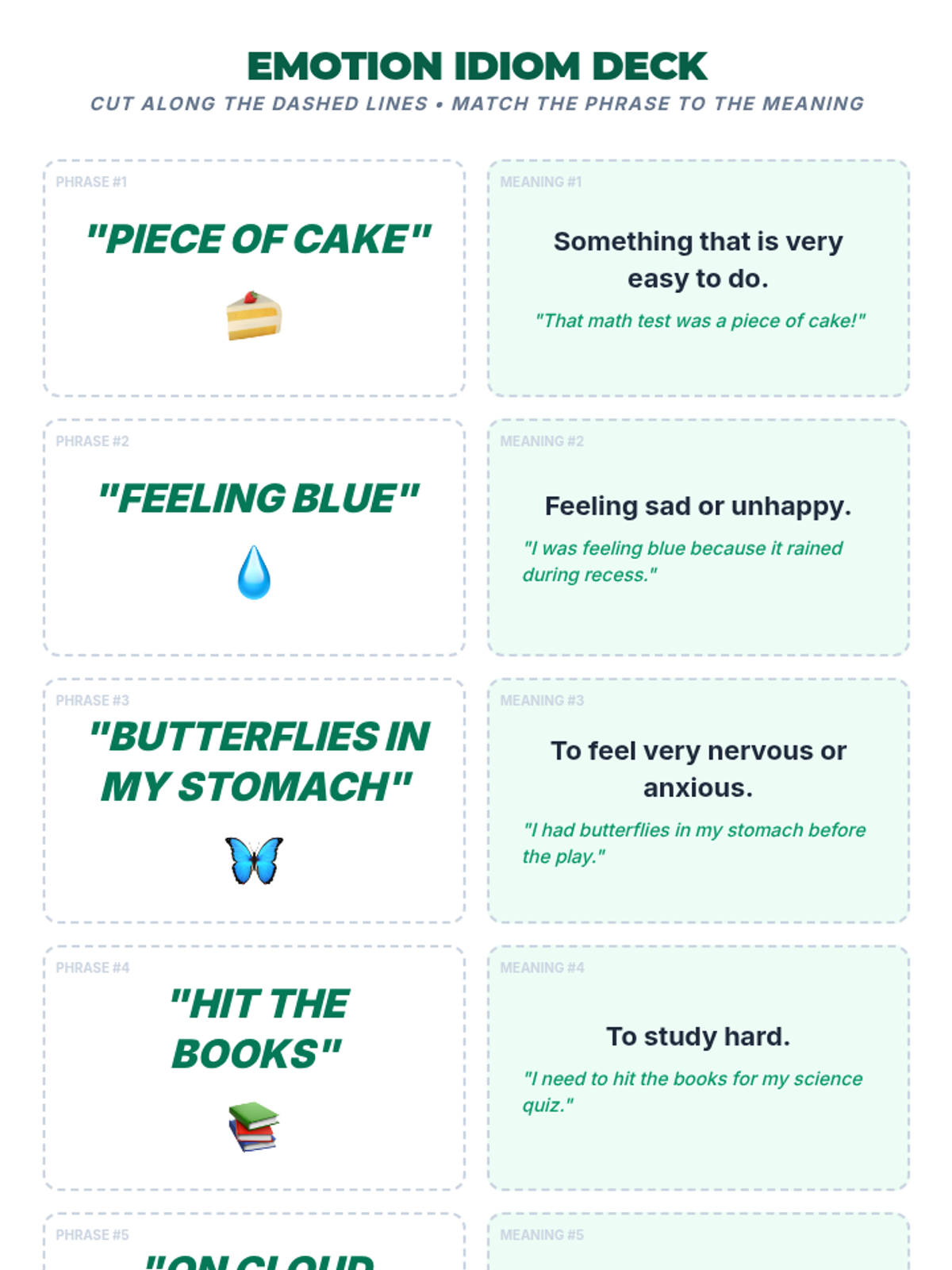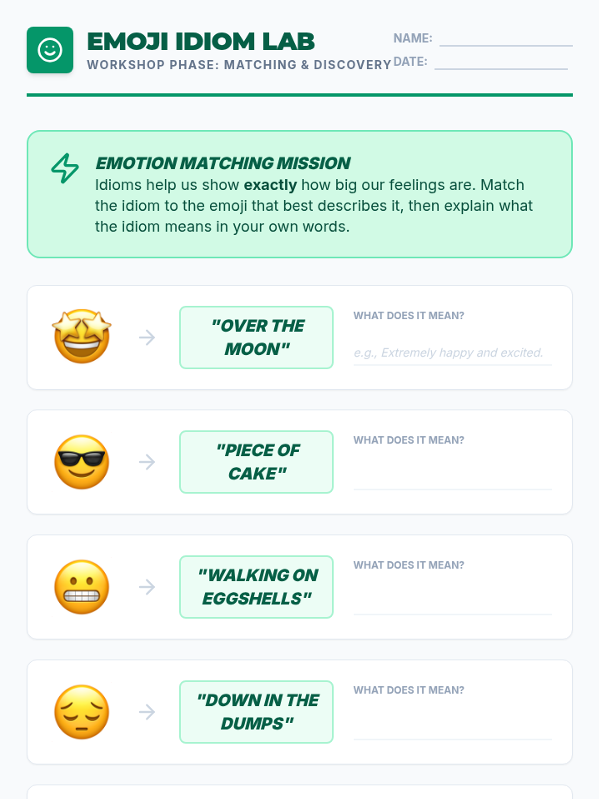 Focuses on using idioms to express complex emotions. Students match idioms to facial expressions and personal experiences to expand their emotional vocabulary.