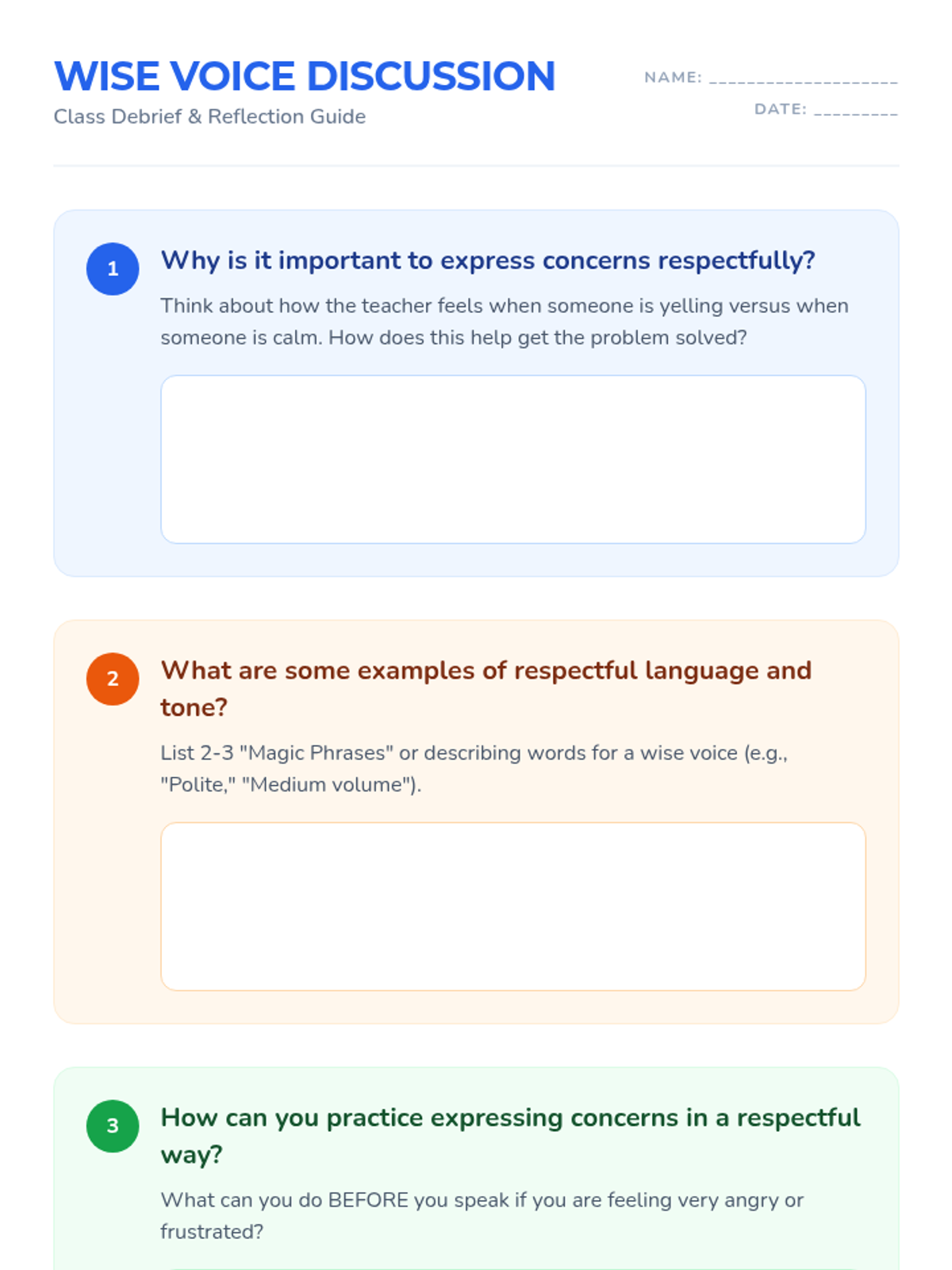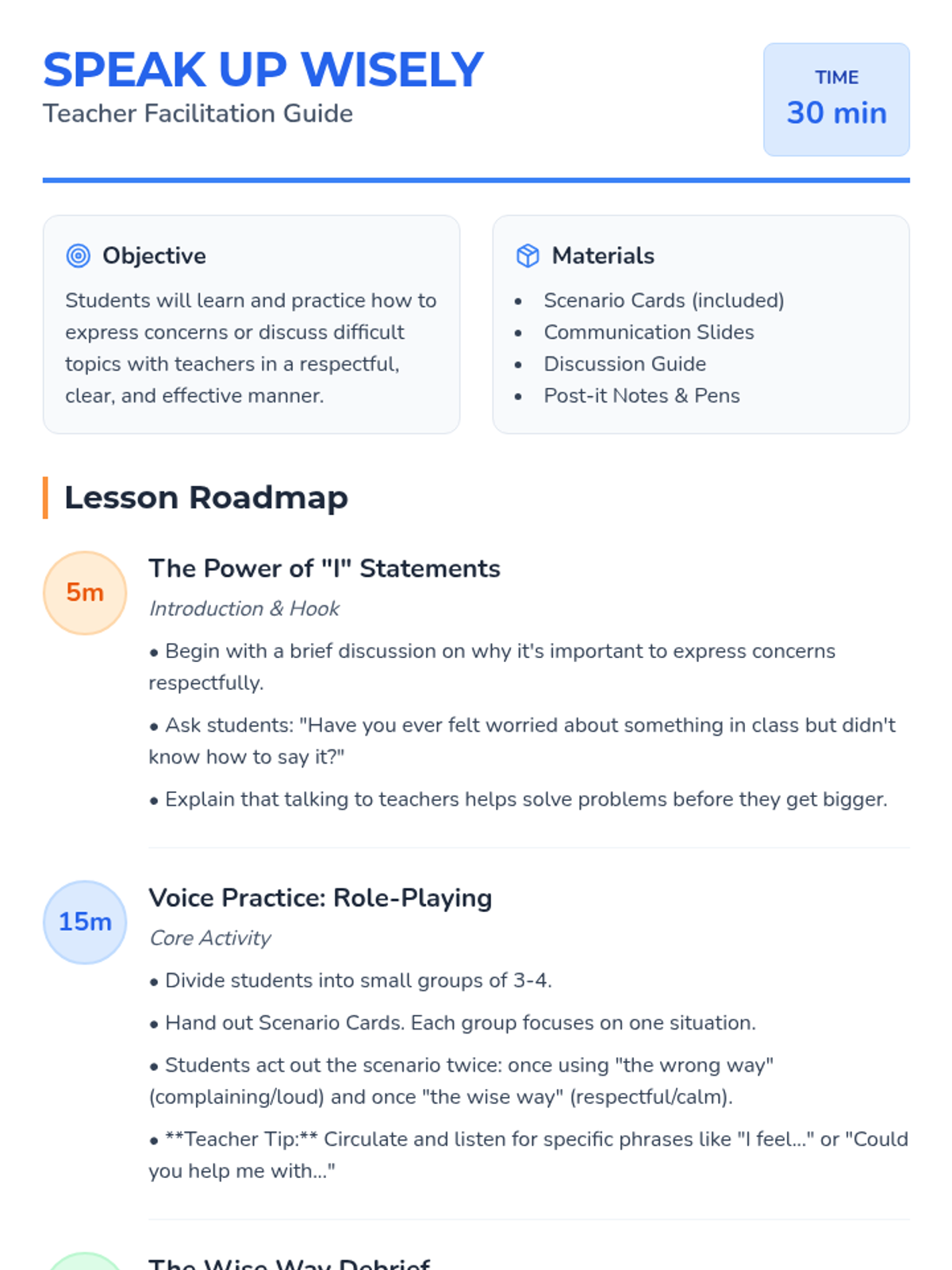 A 30-minute lesson for 3rd graders on how to communicate concerns and difficult topics to teachers using respectful language and a calm tone.