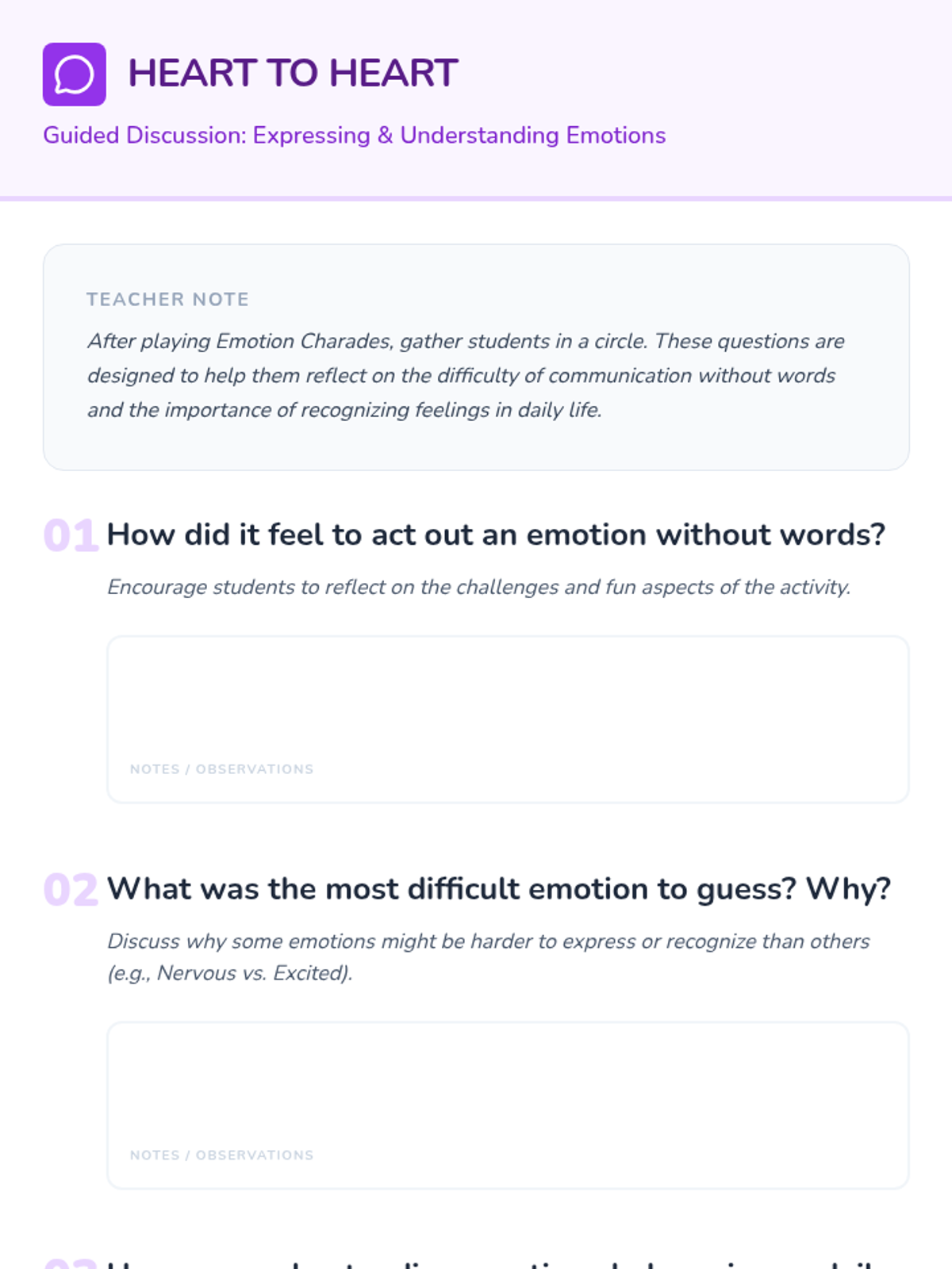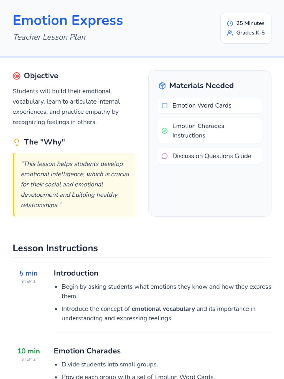 An introductory lesson on emotional vocabulary and empathy. Students learn to identify, articulate, and recognize various feelings through interactive charades and guided discussion.