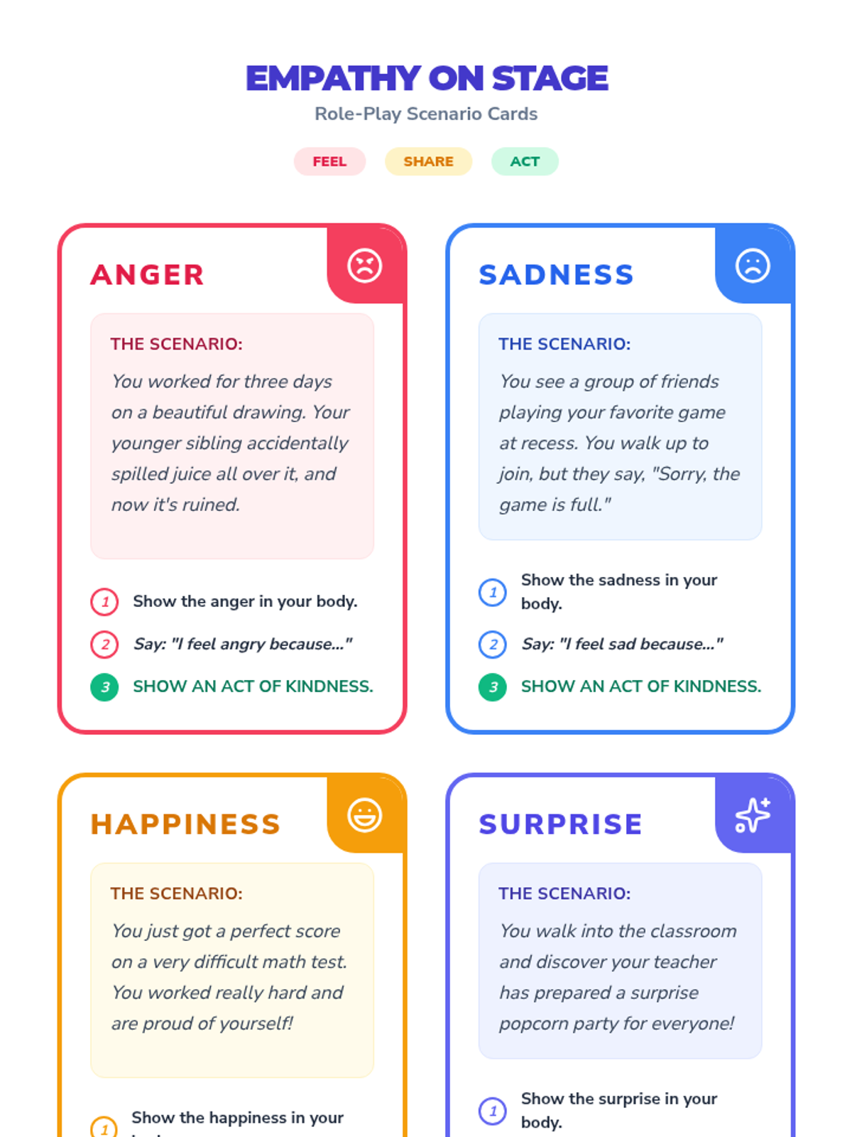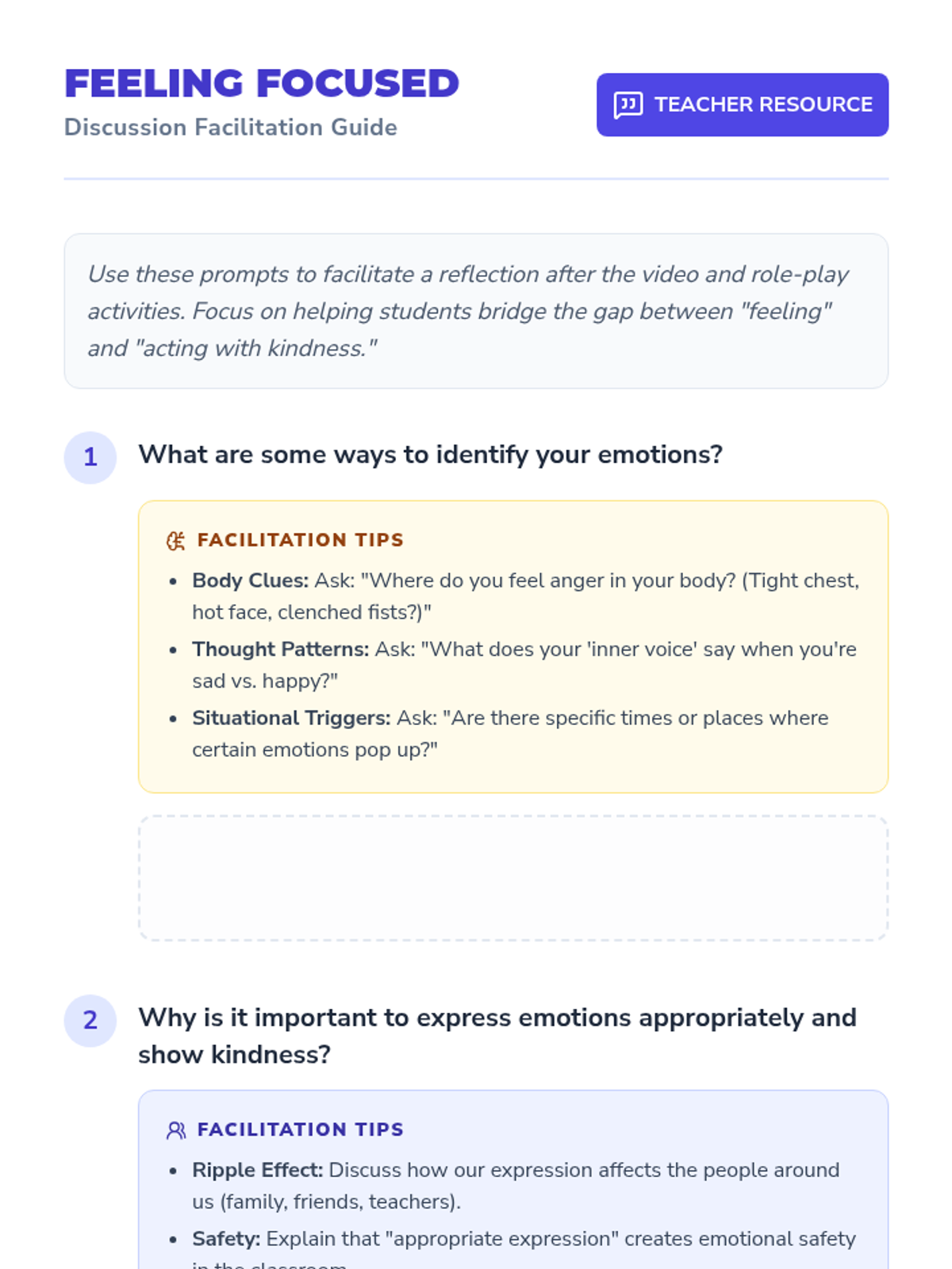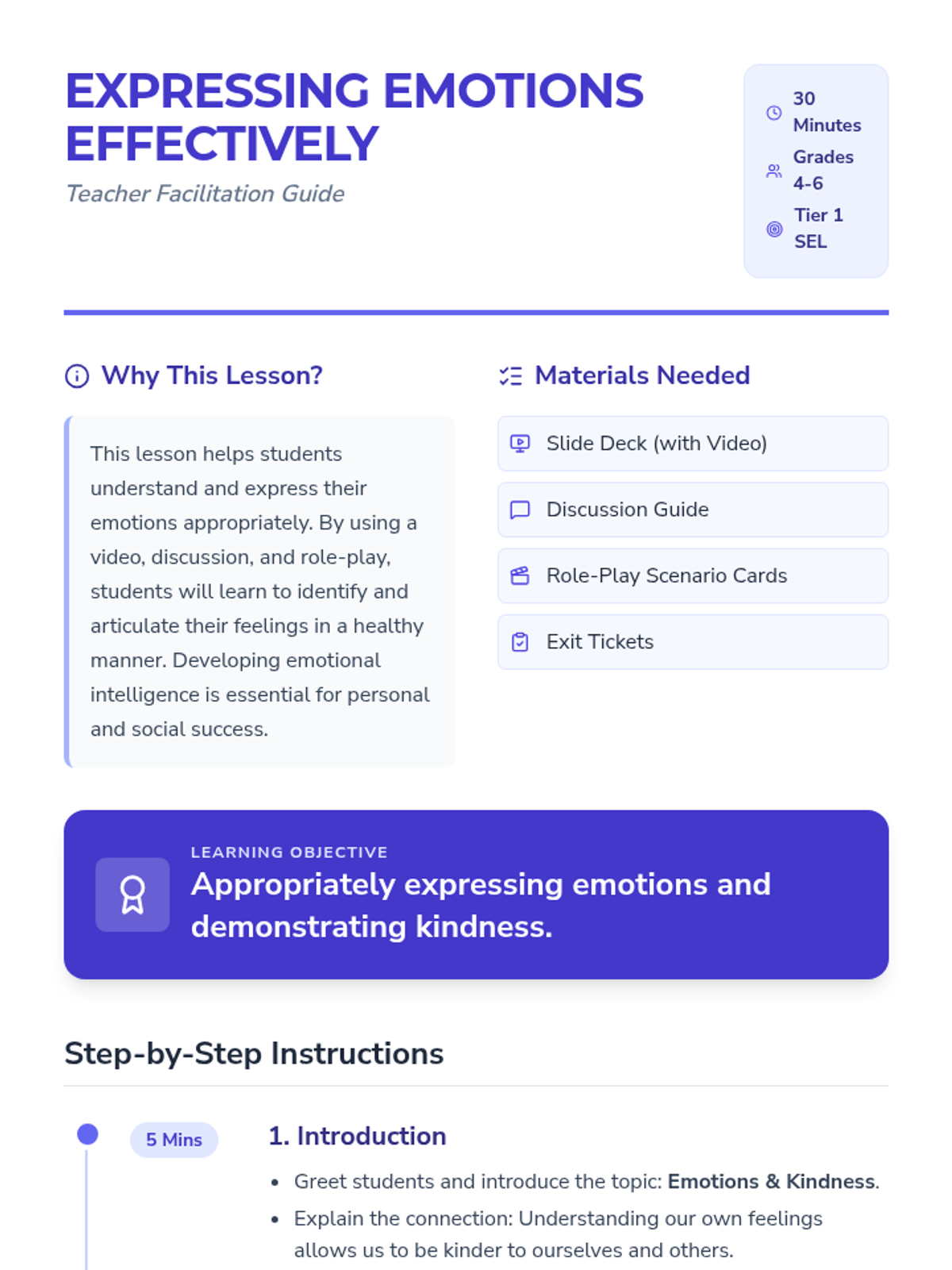 A 30-minute lesson for 4th-6th graders on identifying and expressing emotions healthily through video, role-play, and discussion. Students will learn the connection between emotional regulation and kindness.