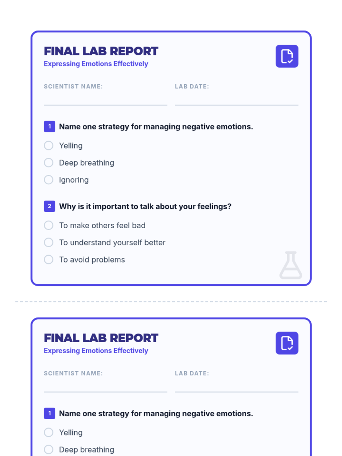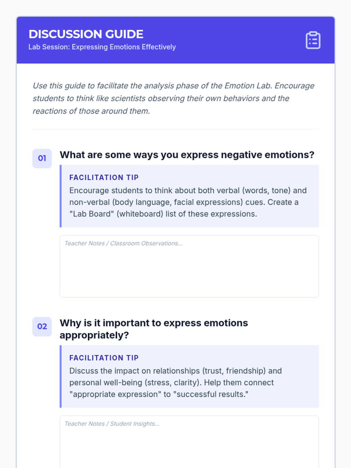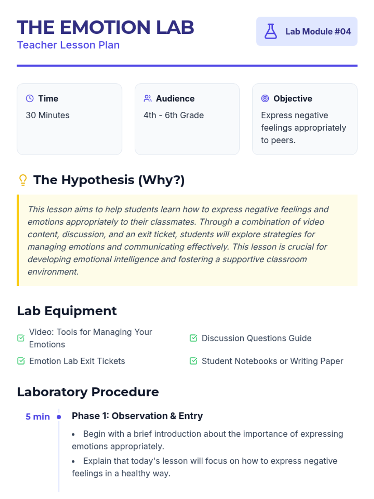 A social-emotional learning lesson for 4th-6th graders focused on identifying, managing, and communicating negative emotions in healthy, constructive ways. Students will explore strategies for self-regulation and practice effective communication through discussion and role-play.