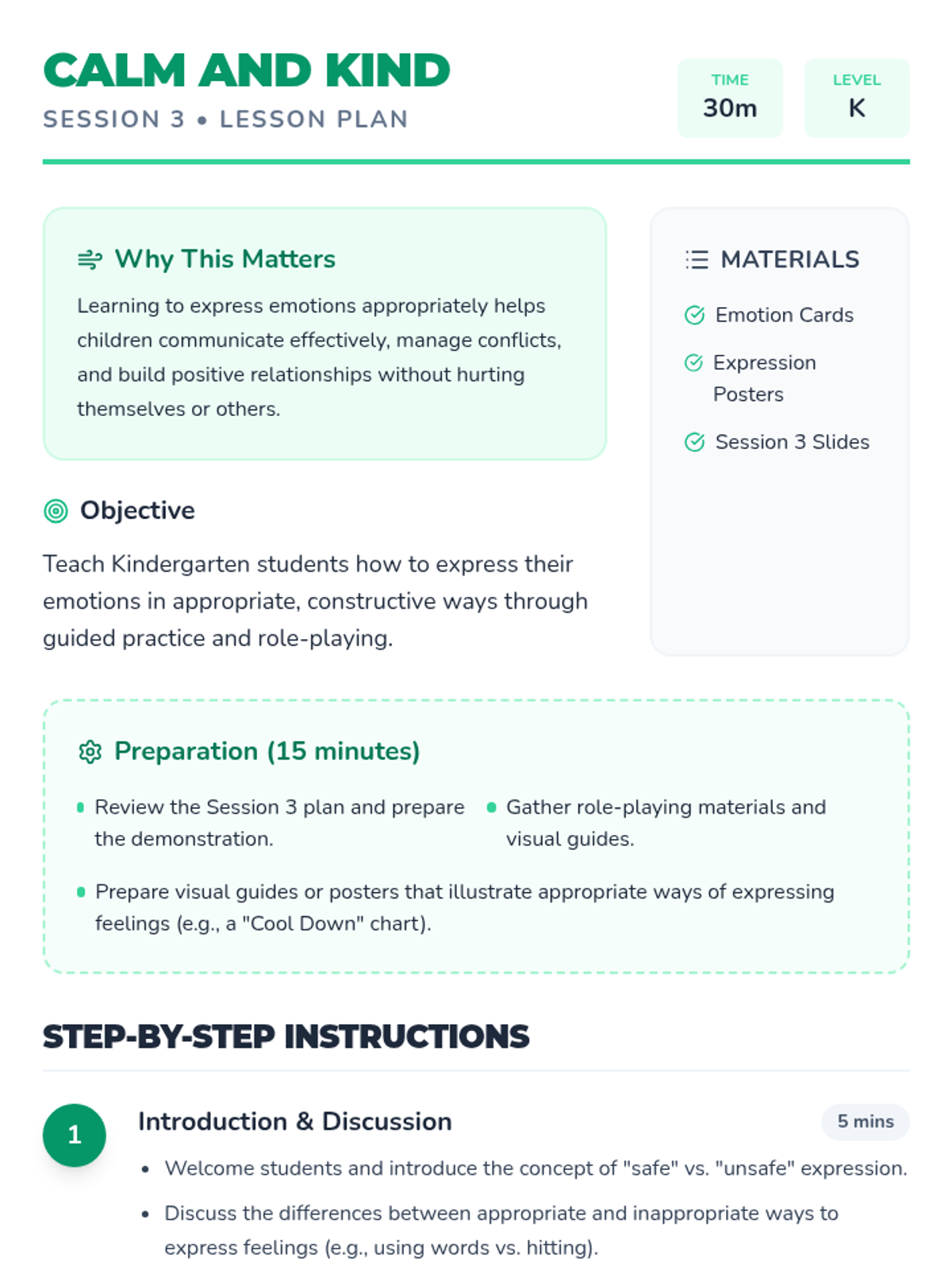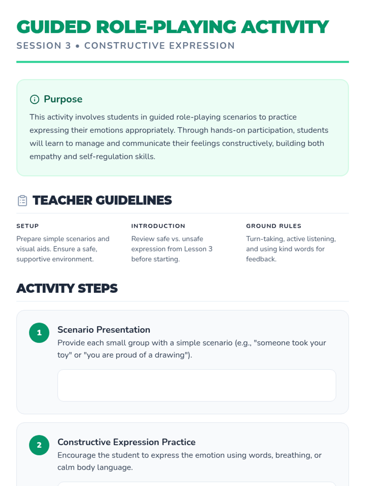 Focuses on constructive ways to express strong emotions, such as using words, deep breathing, or creative outlets.