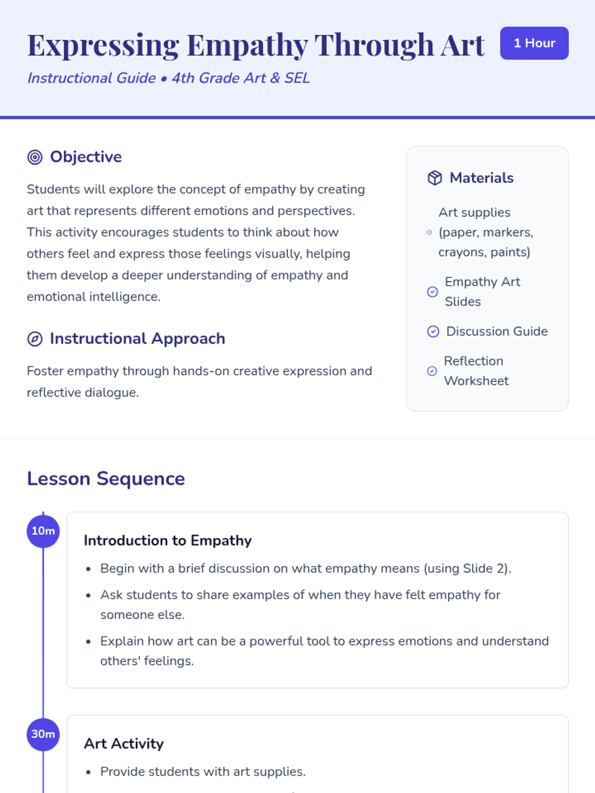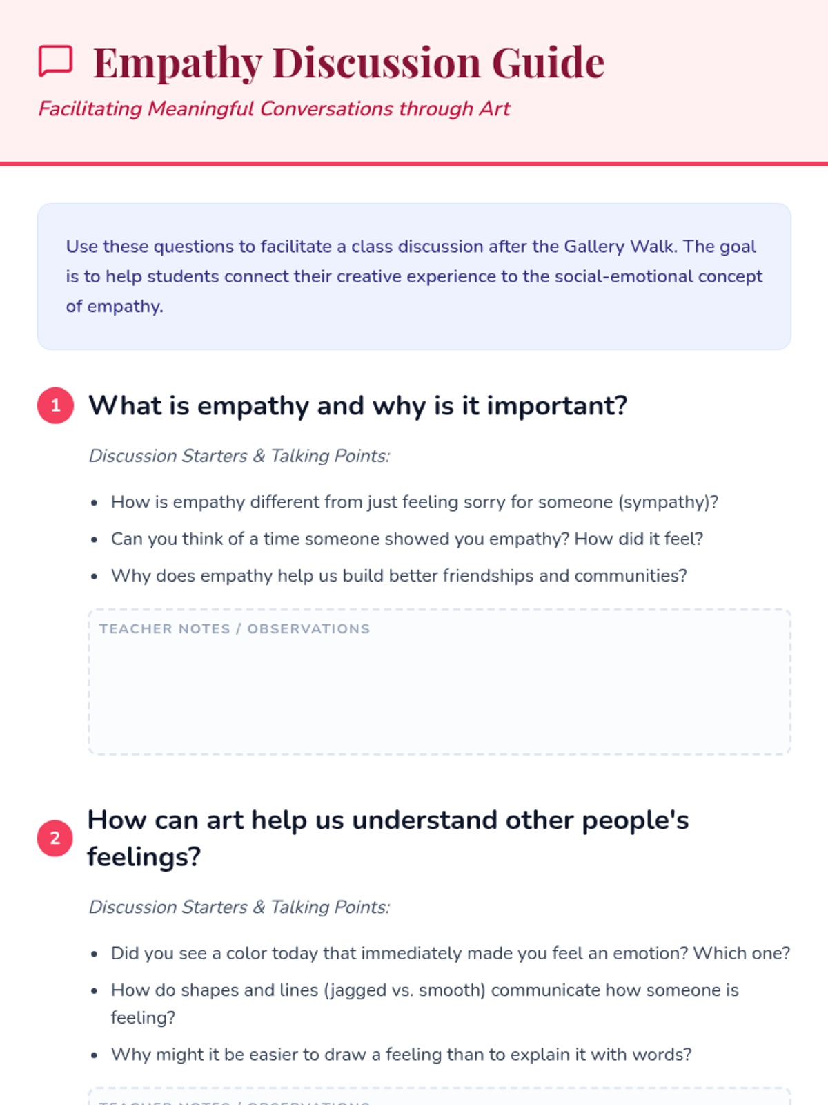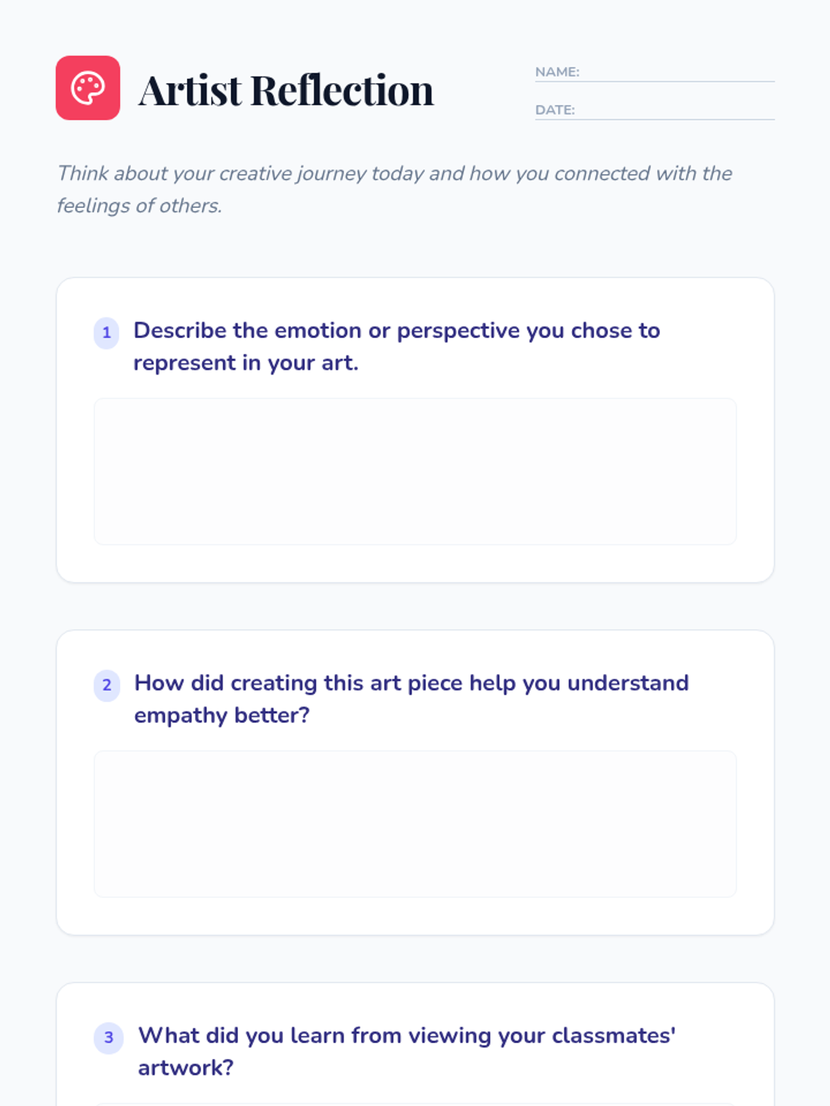 Students explore empathy by creating art that represents different emotions and perspectives, fostering emotional intelligence through visual expression and reflection.