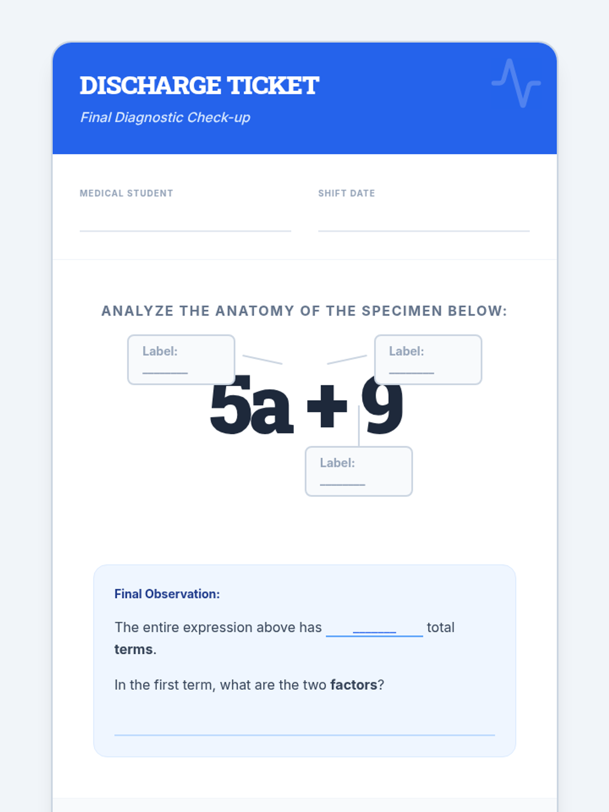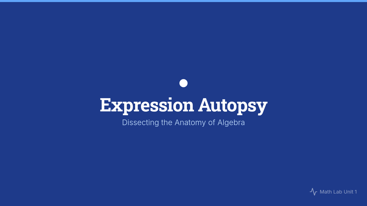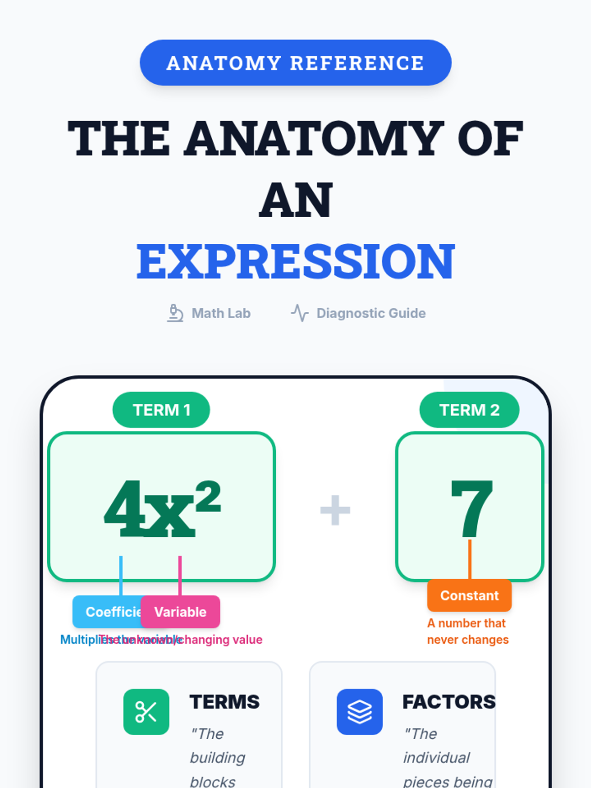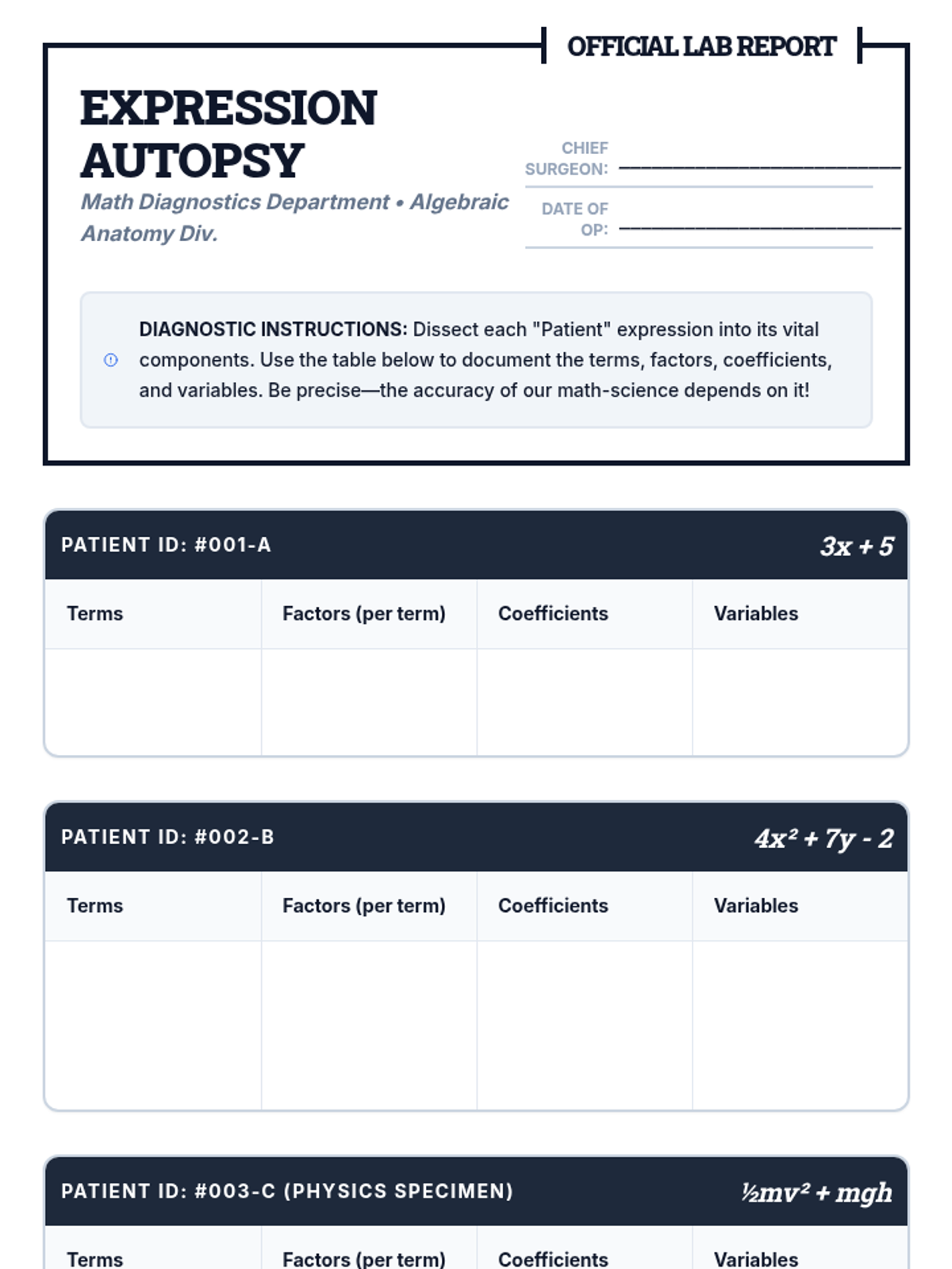 Students will learn to identify and define the key components of algebraic expressions: terms, factors, coefficients, variables, and constants. Through a medical-themed 'autopsy' analogy and a physics-connected video, students will practice dissecting complex expressions into their individual parts.