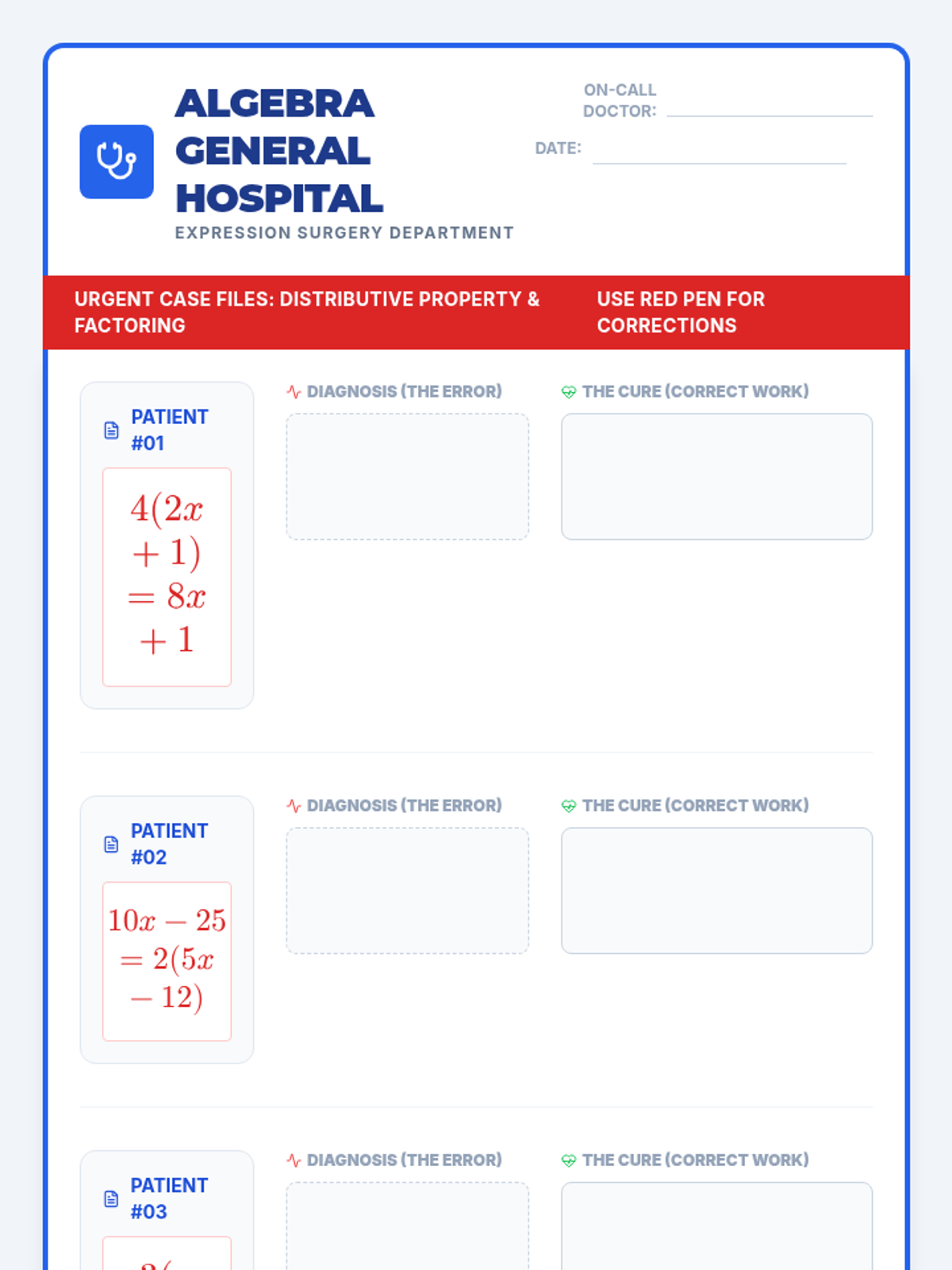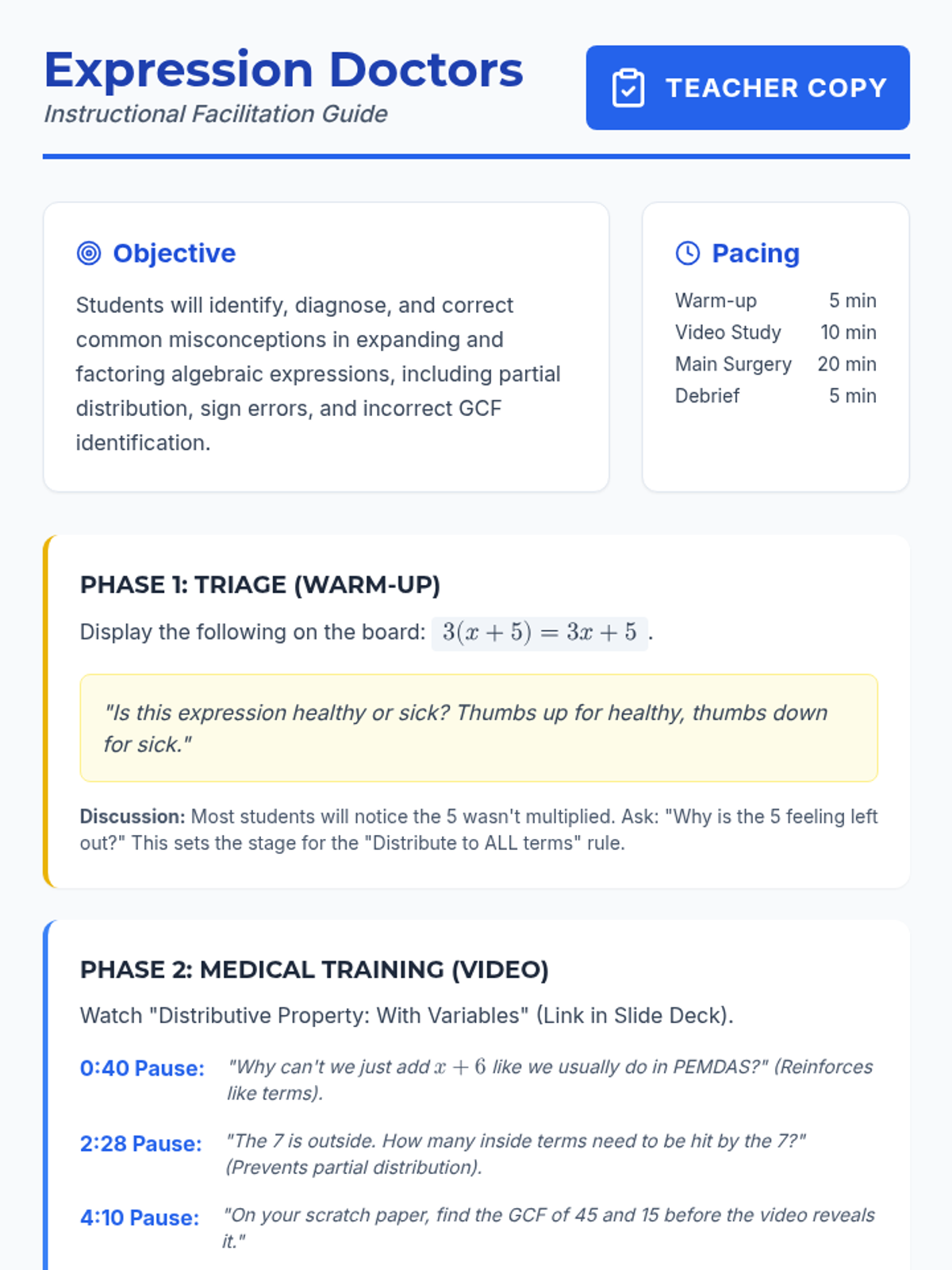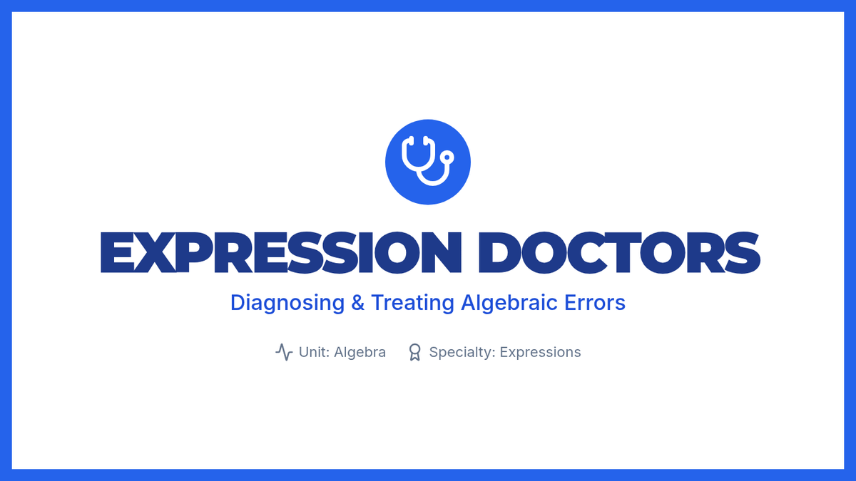 Students act as 'Expression Doctors' to diagnose and treat common errors in expanding and factoring algebraic expressions. This lesson uses a whiteboard animation video to introduce the distributive property and GCF factoring, followed by a hands-on correction activity.