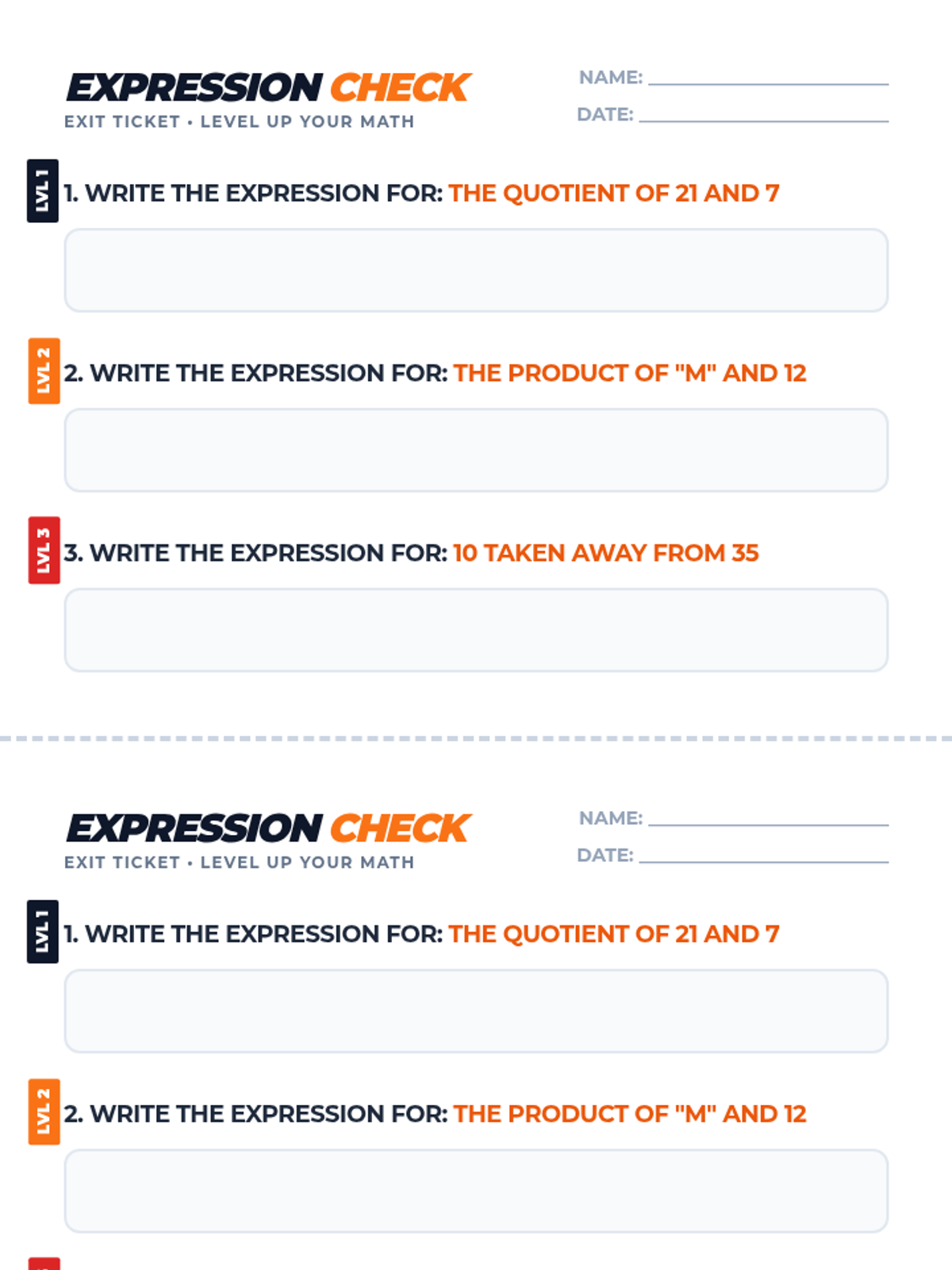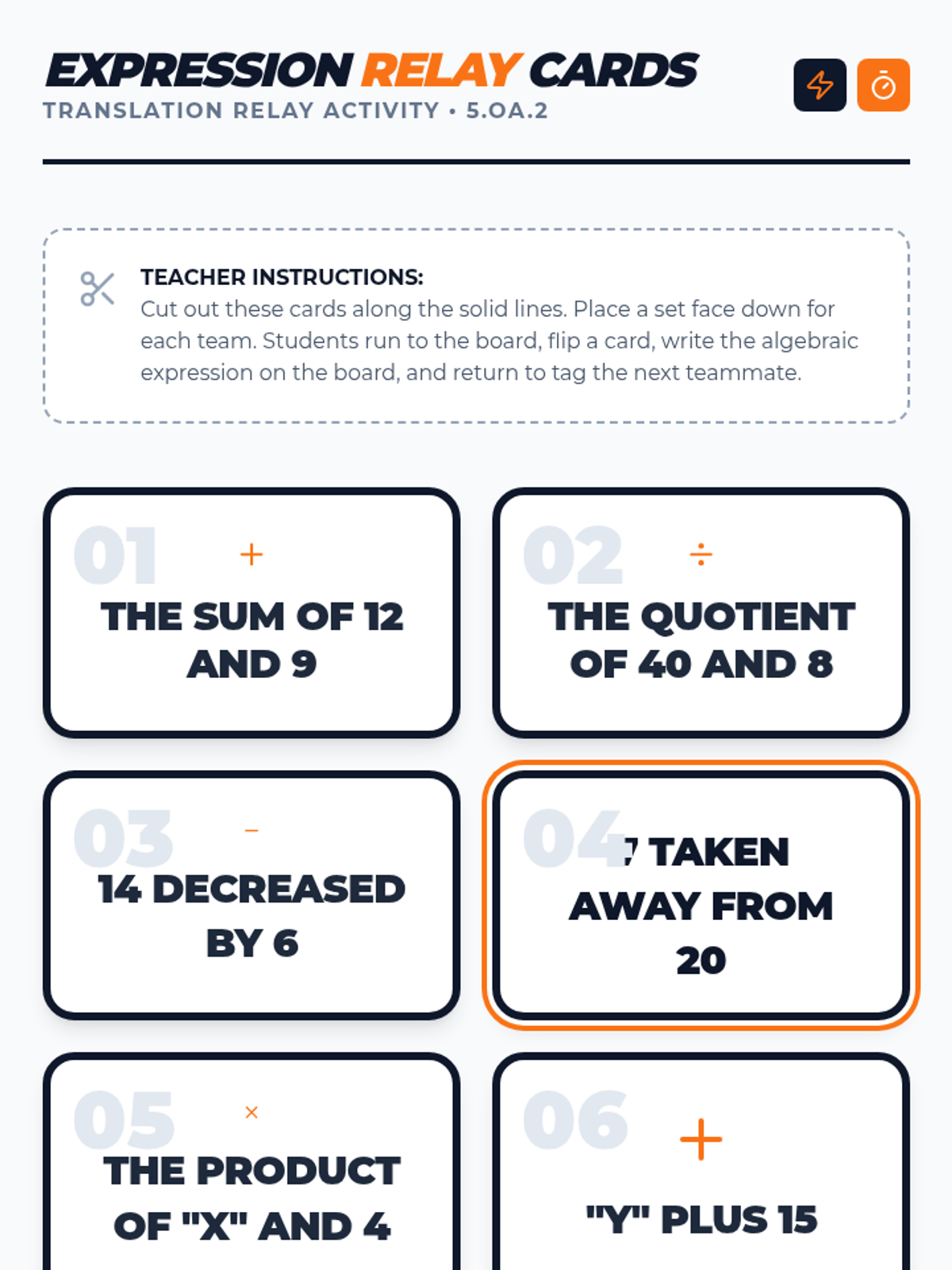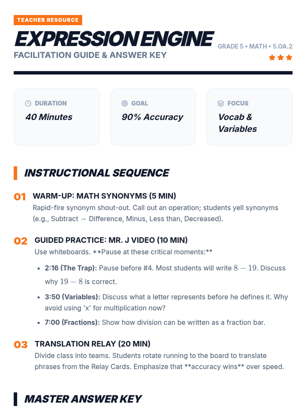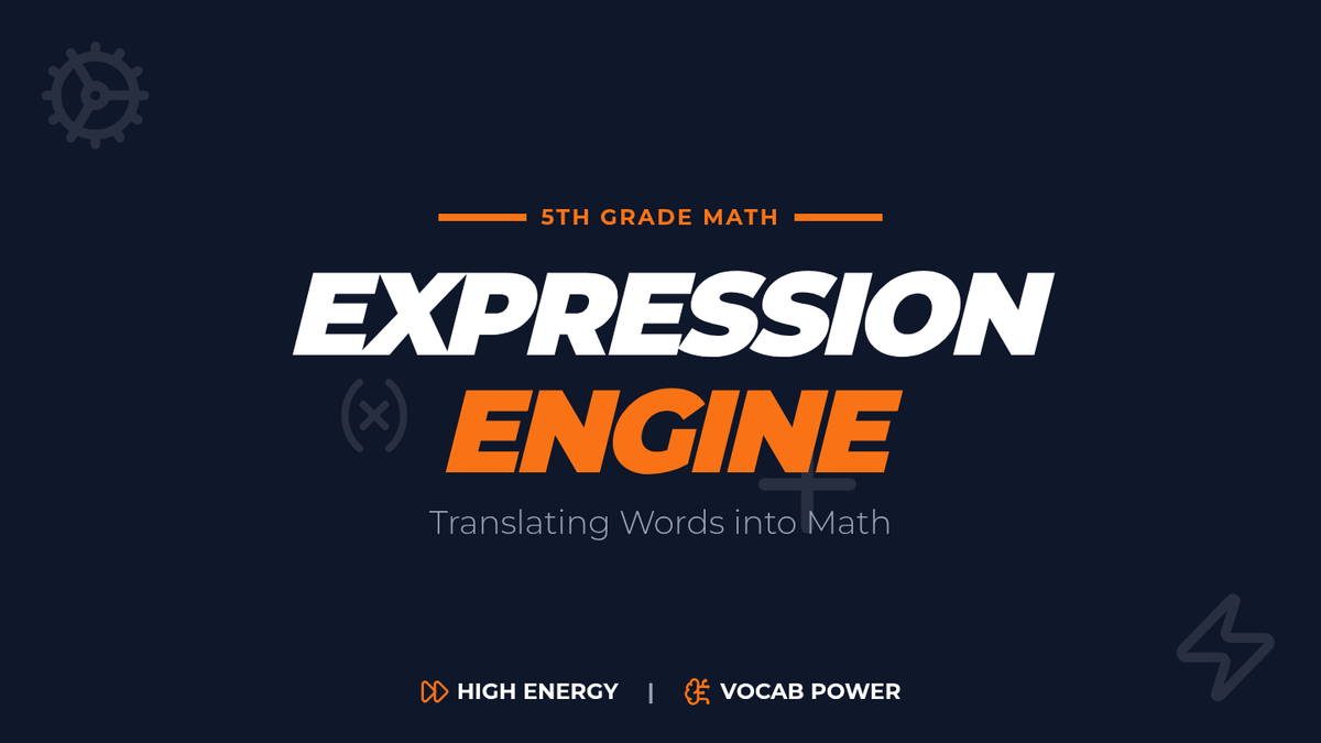A high-energy lesson where students translate verbal phrases into mathematical expressions using a 'relay race' format and video-guided practice. Students focus on key vocabulary like sum, quotient, and the tricky 'taken away from' phrasing.