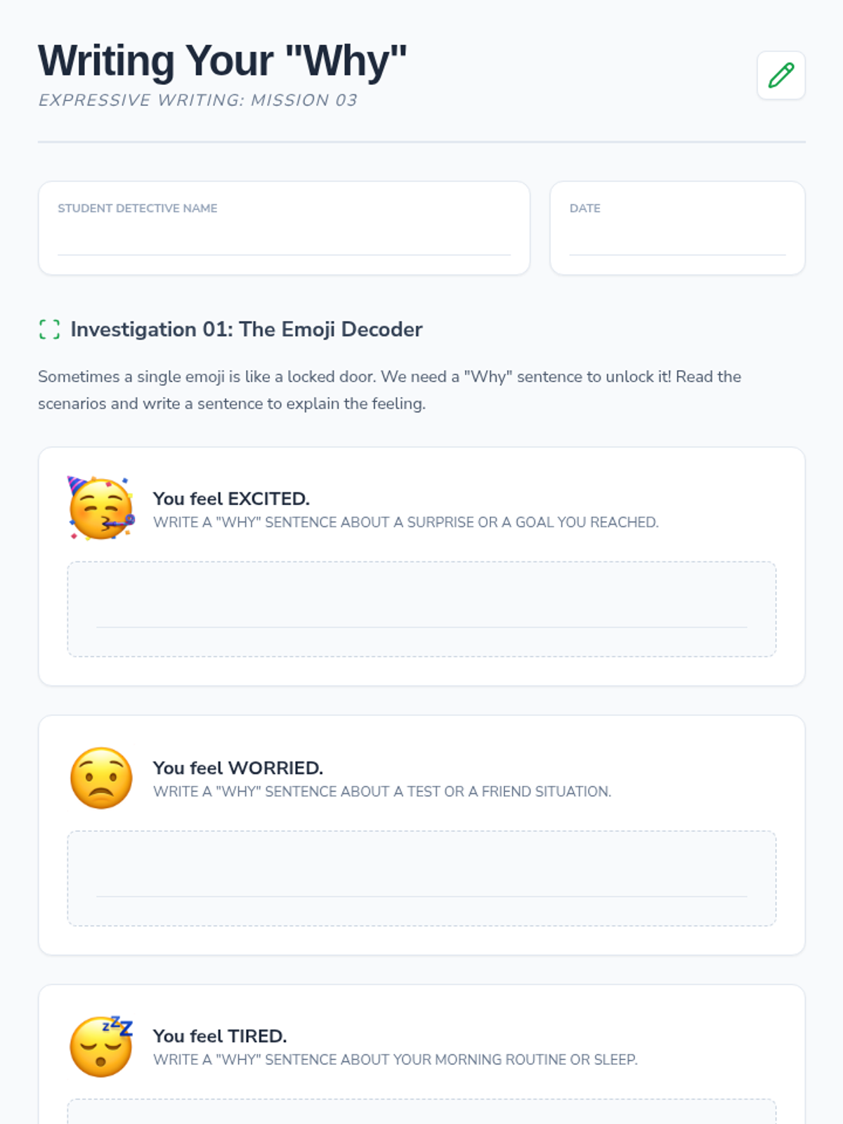 Students practice adding depth to their check-ins by writing descriptive sentences that explain the 'why' behind their emotional choices.