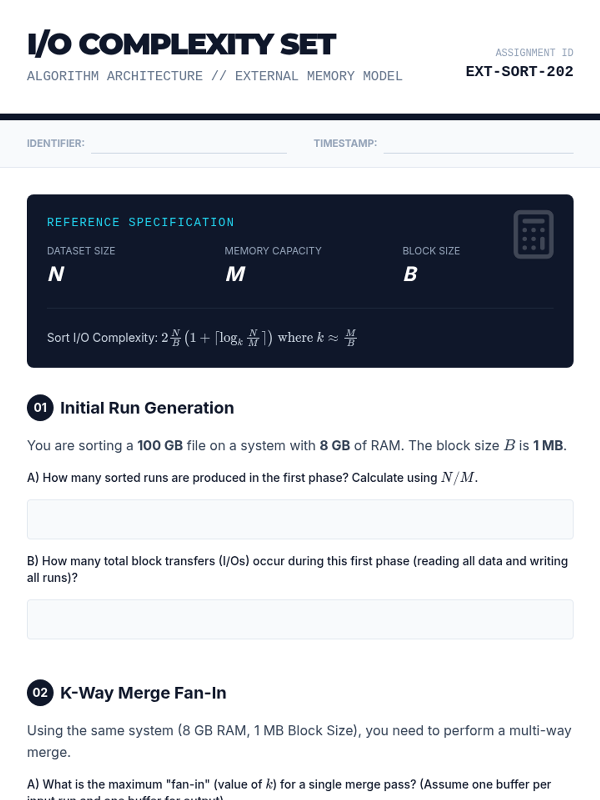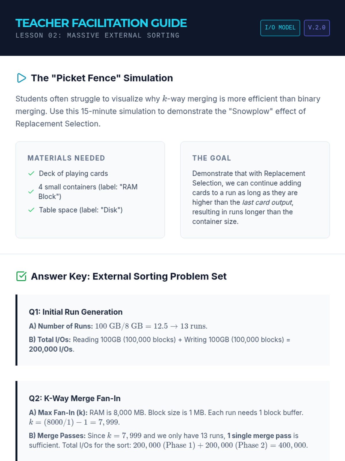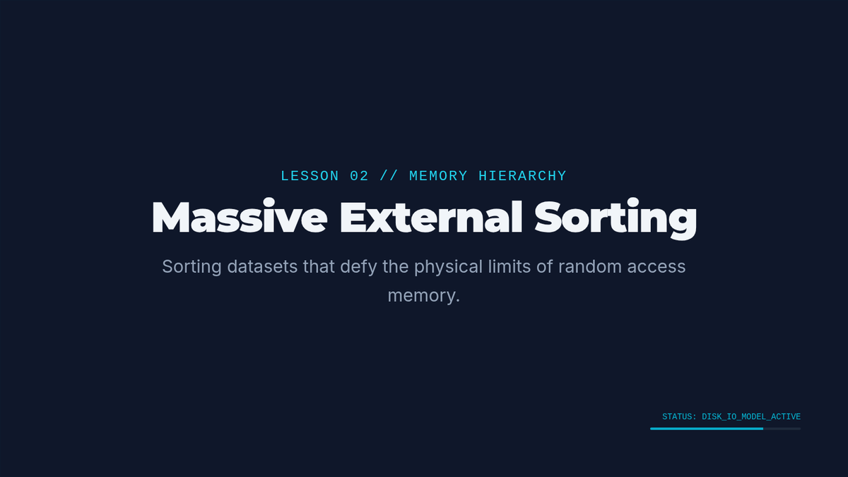 Addressing datasets that exceed RAM capacity, this lesson introduces the External Memory Model (I/O Model) and K-Way Merge Sort. Students learn to optimize for block-based access and minimize expensive disk I/O operations.