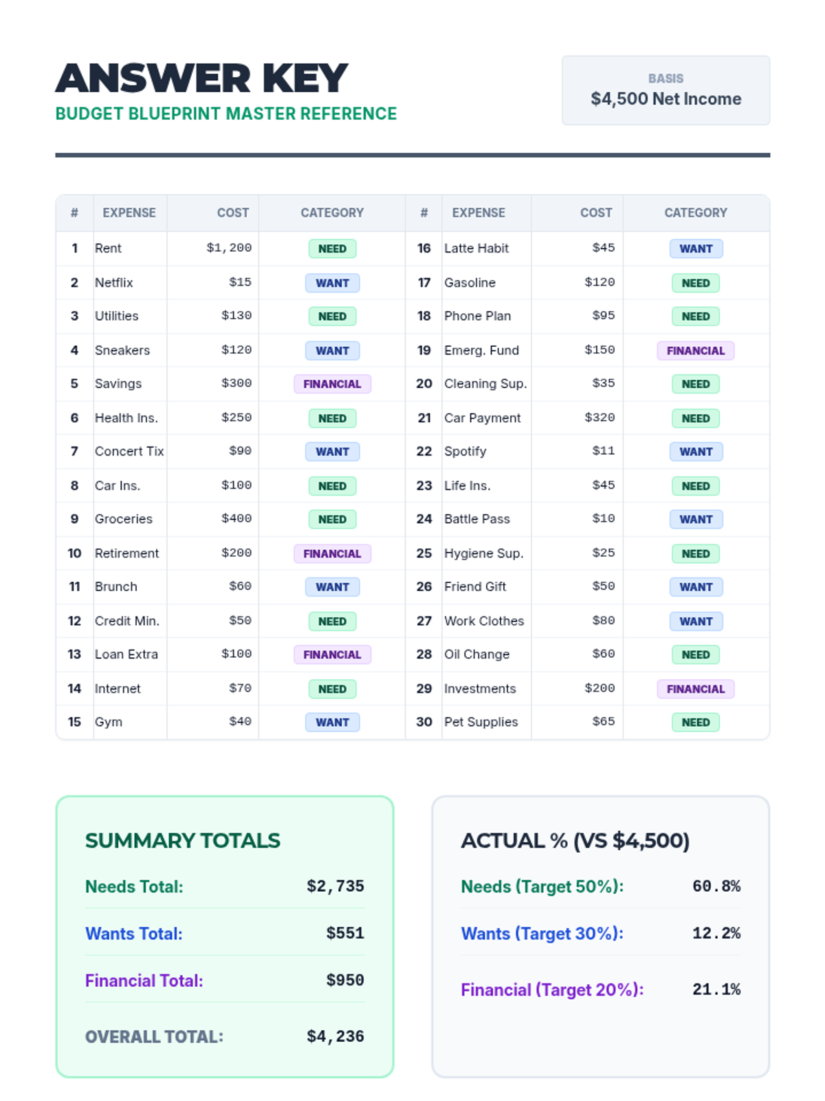 A high school financial literacy lesson introducing the 50/30/20 budgeting rule through a hands-on expense categorization activity and reflection.