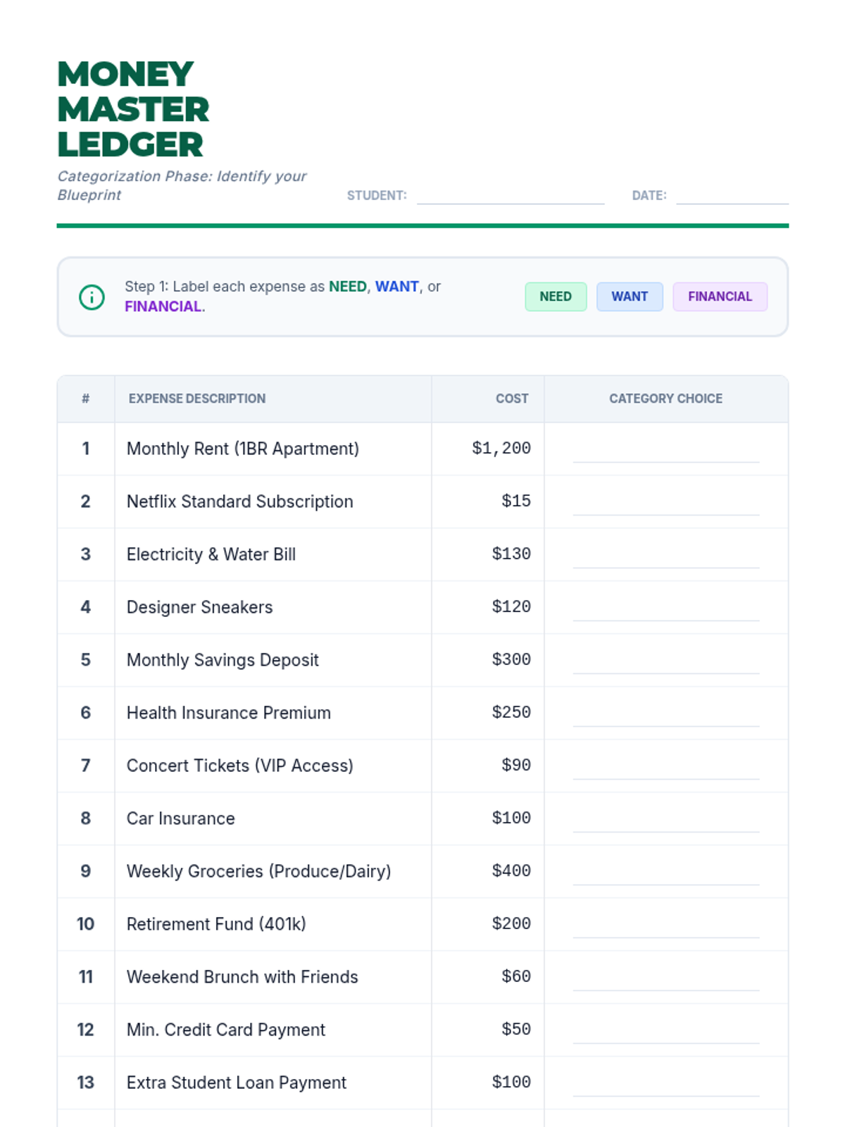 A hands-on financial literacy simulation where students manage a month of income and expenses, navigating real-world trade-offs and unexpected financial hurdles.