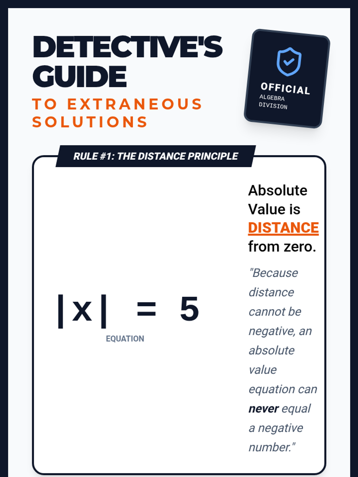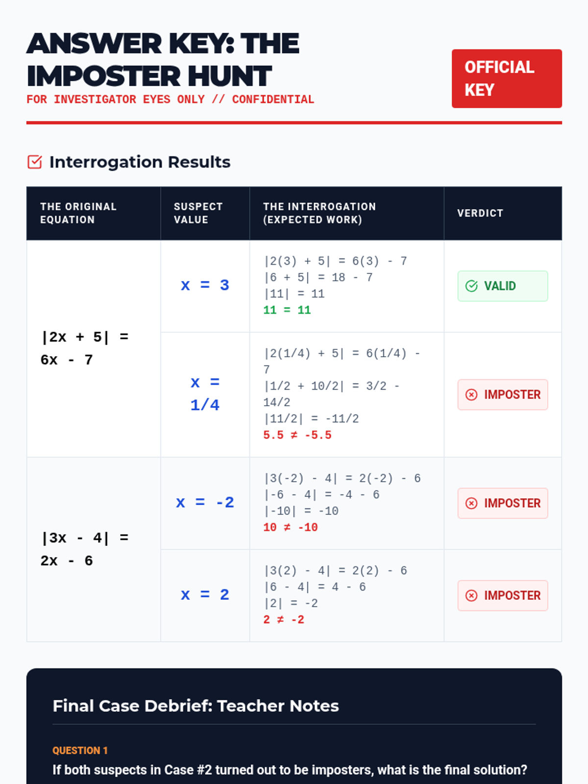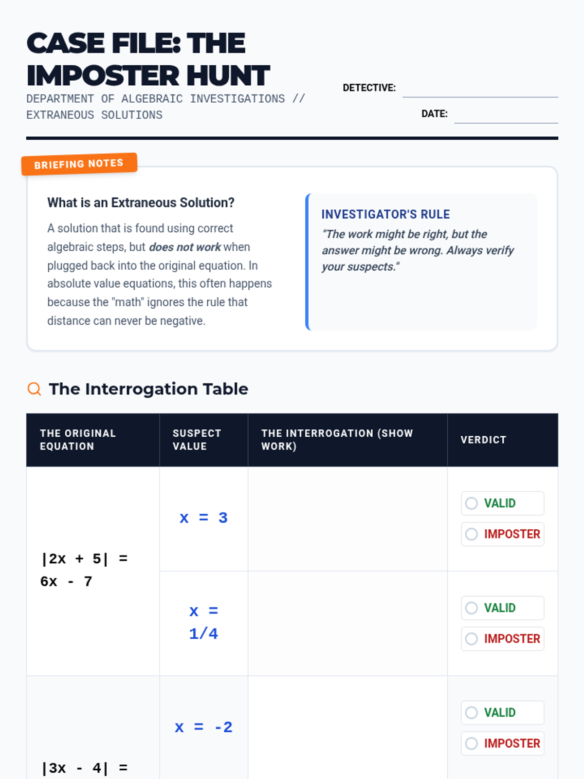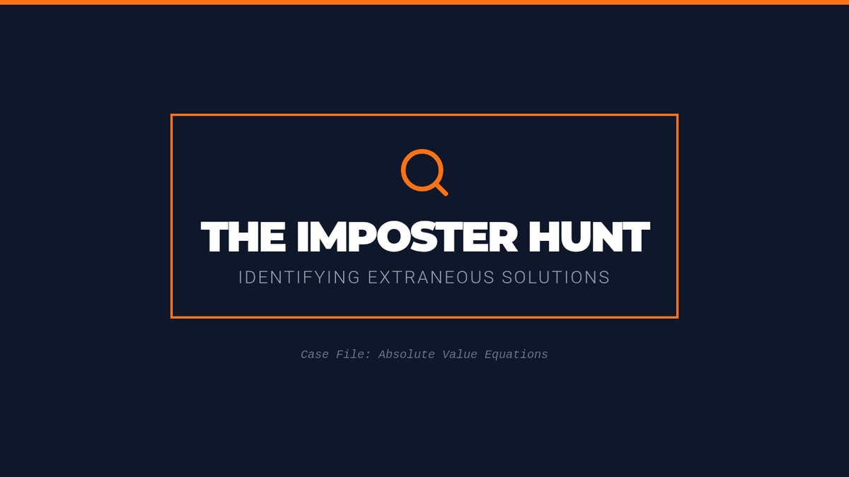 A lesson focused on identifying extraneous solutions in absolute value equations through a detective-themed 'Valid or Imposter' investigation. students will learn to verify algebraic results by substituting them back into the original equation.