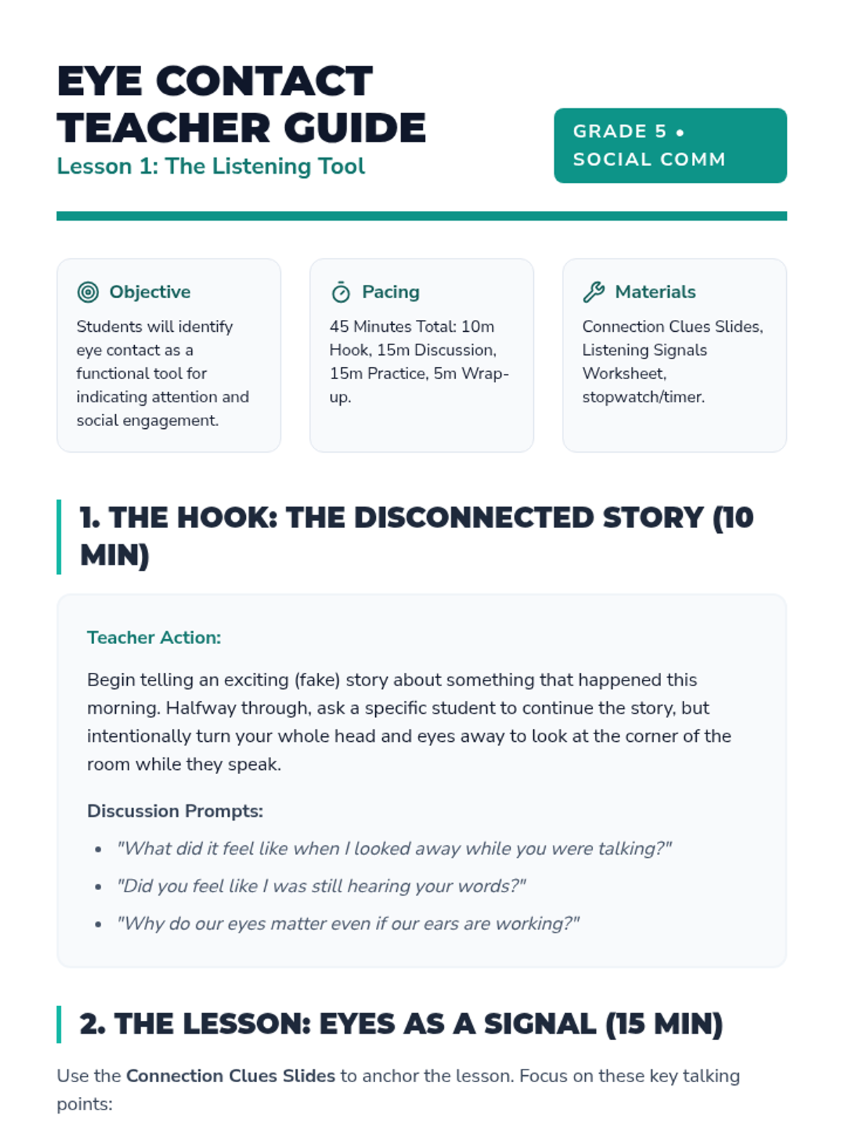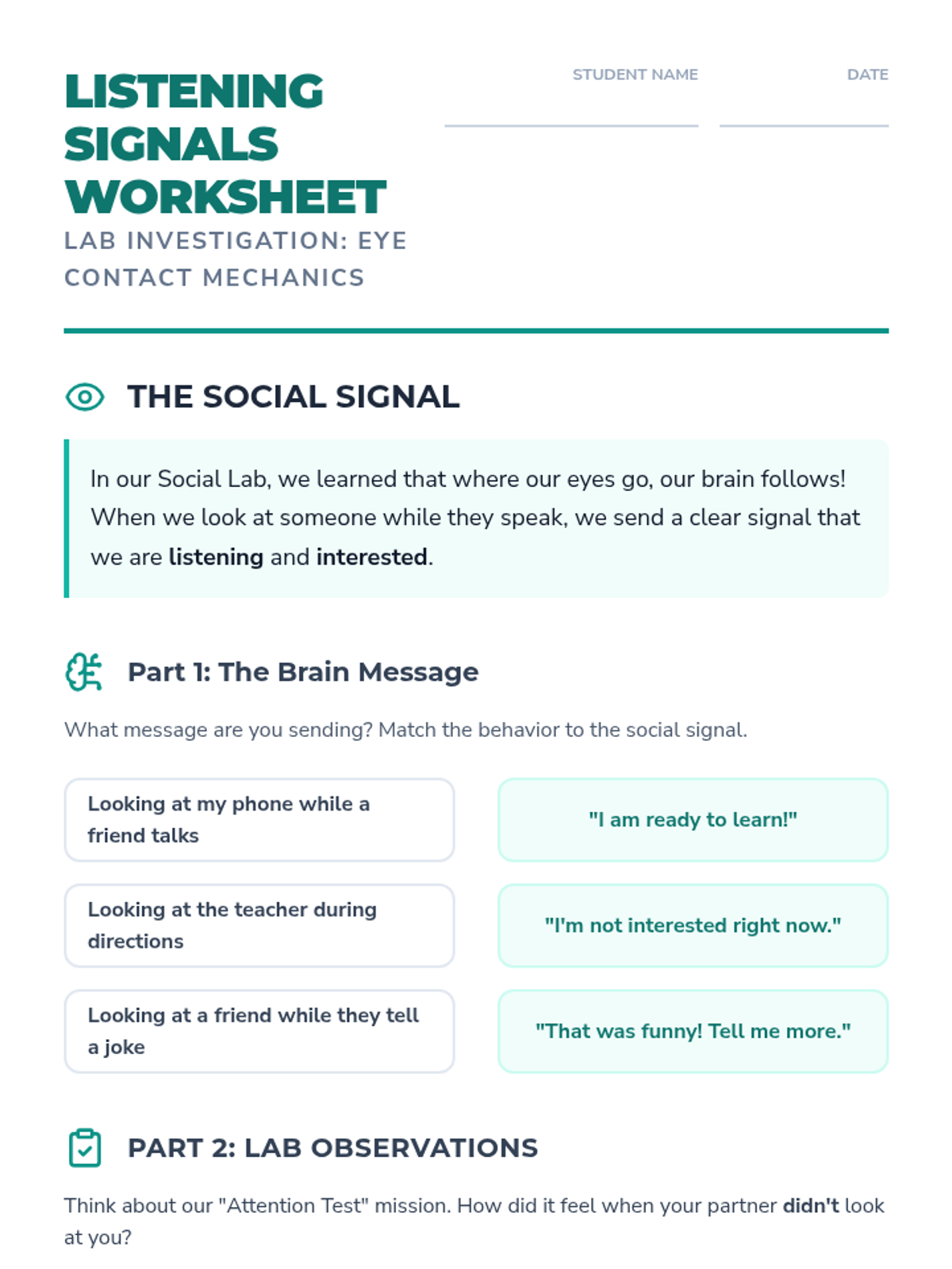 Students explore the social purpose of eye contact as a tool for active listening and showing interest. They investigate the 'why' behind looking at others during conversation.