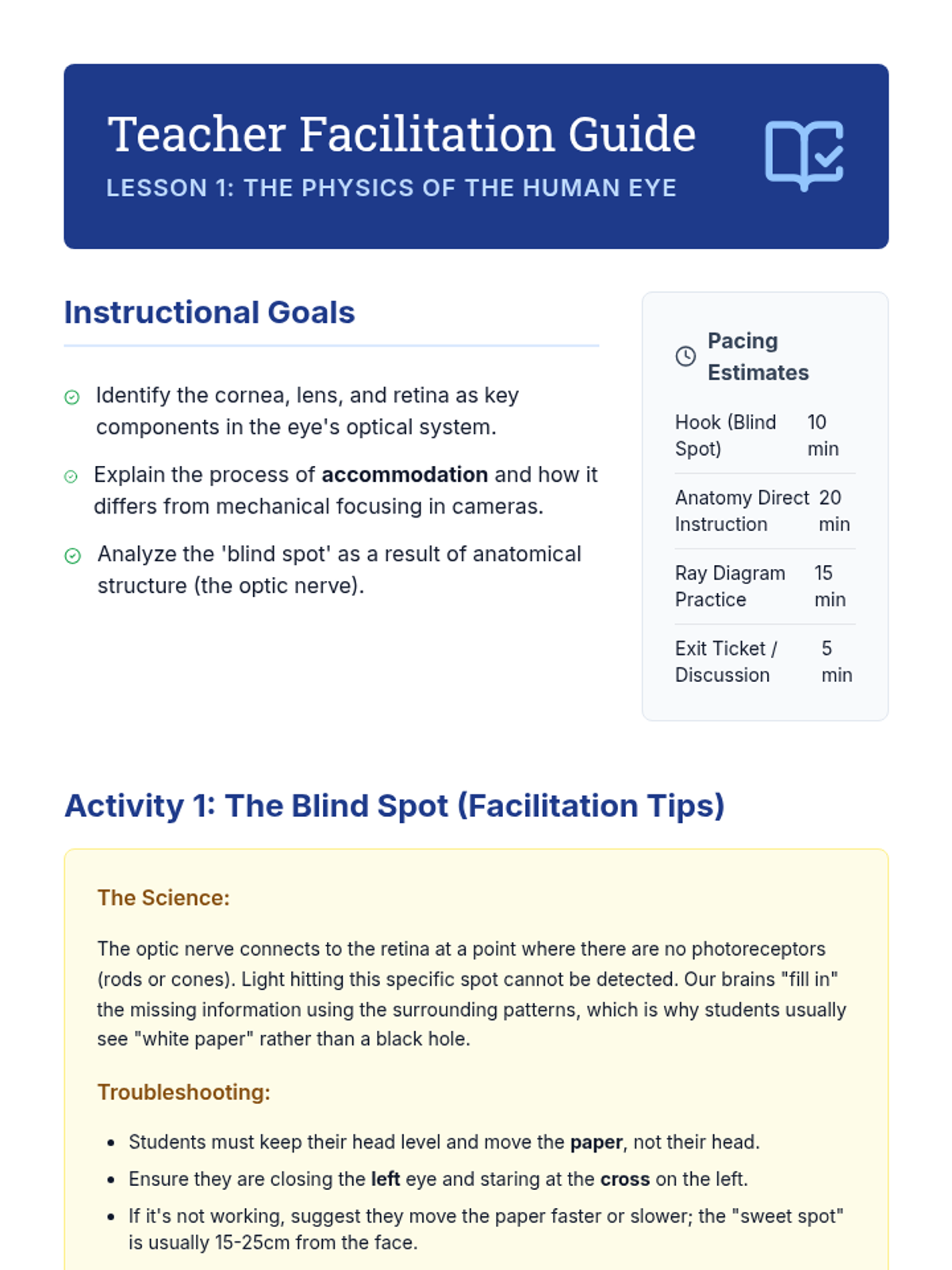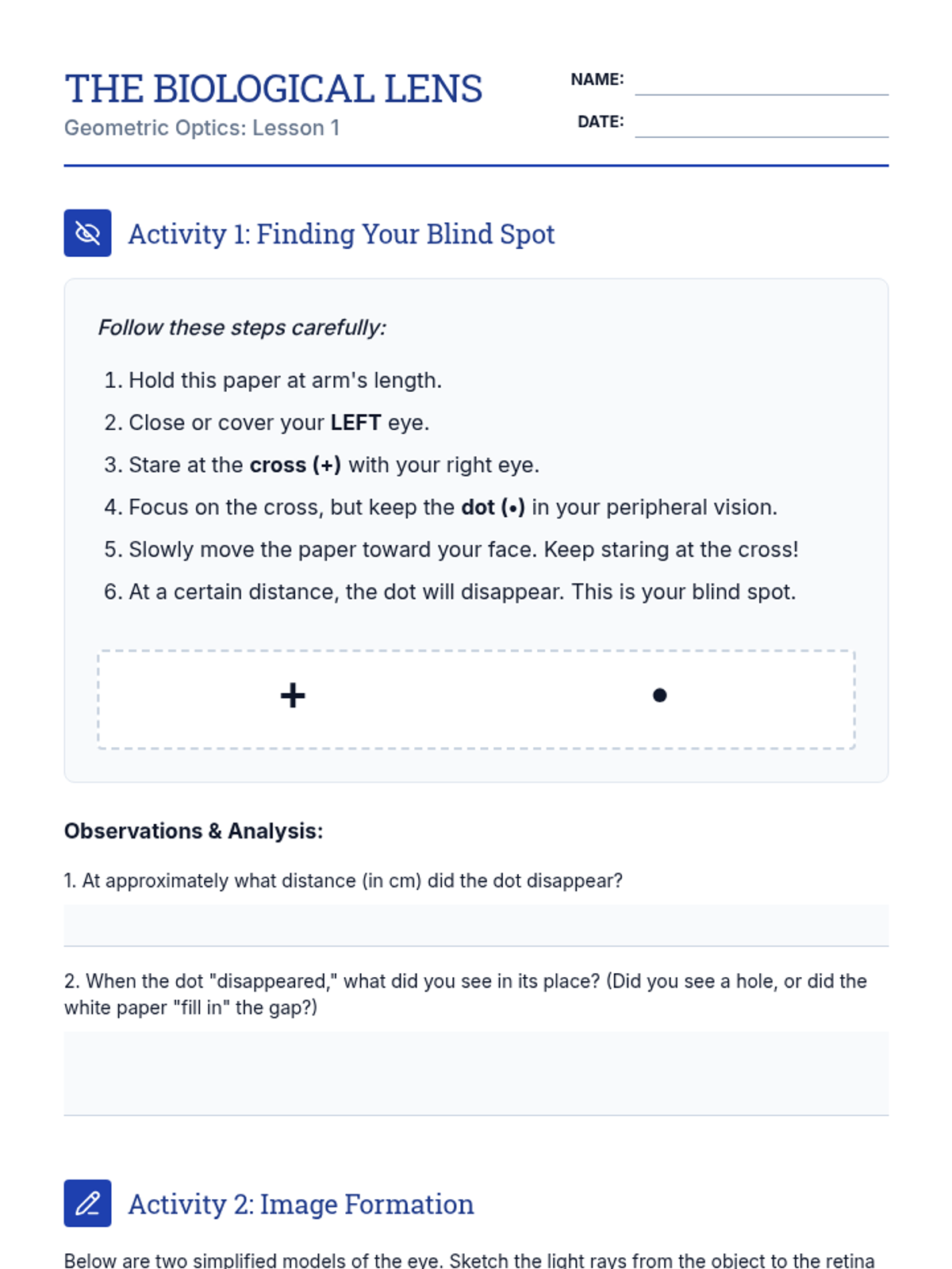 Students explore the eye as a biological optical instrument, focusing on how the cornea and lens refract light to form images on the retina and investigating the 'blind spot' phenomenon.