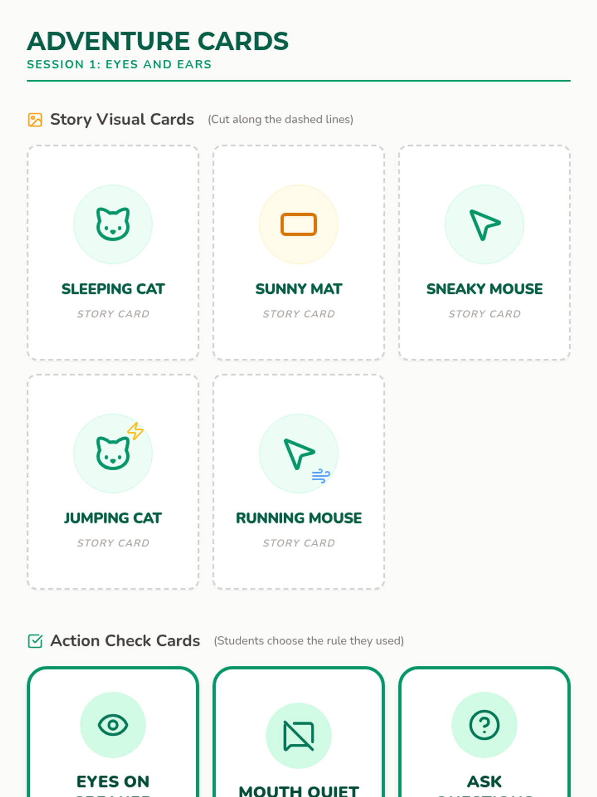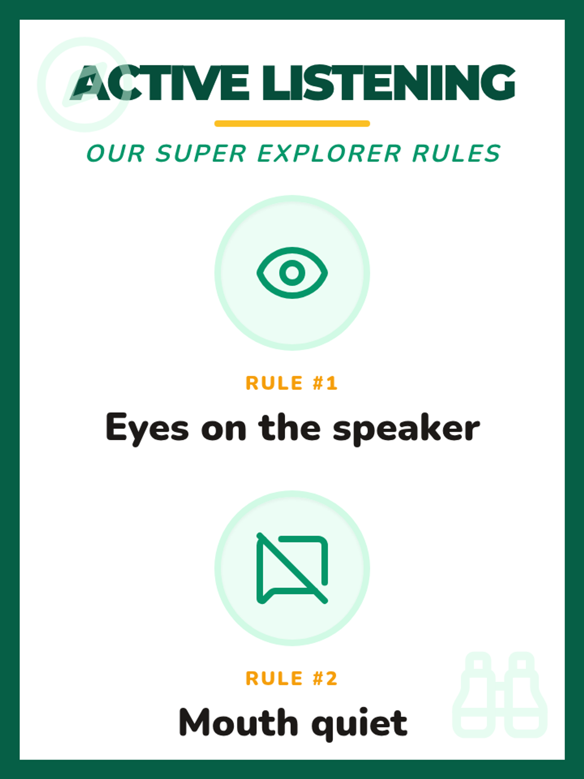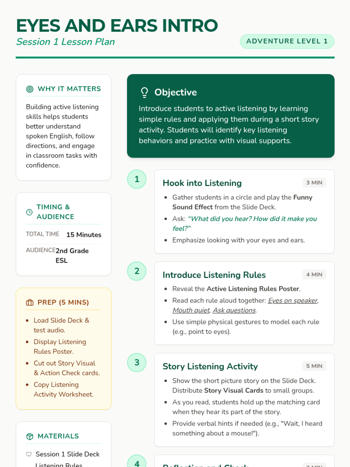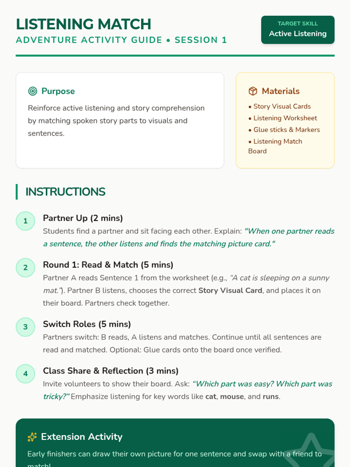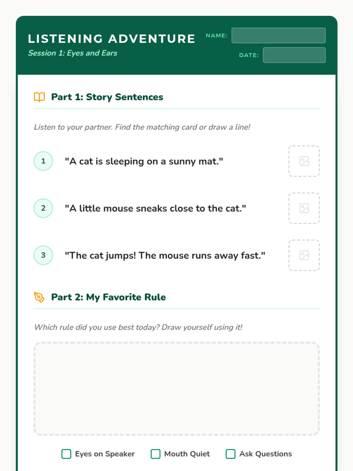 Introduction to active listening rules and basic story comprehension using visual supports.