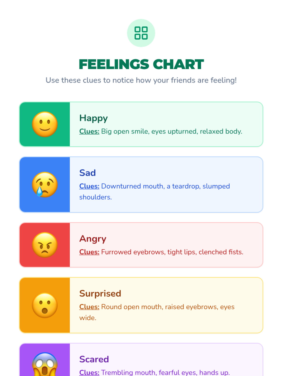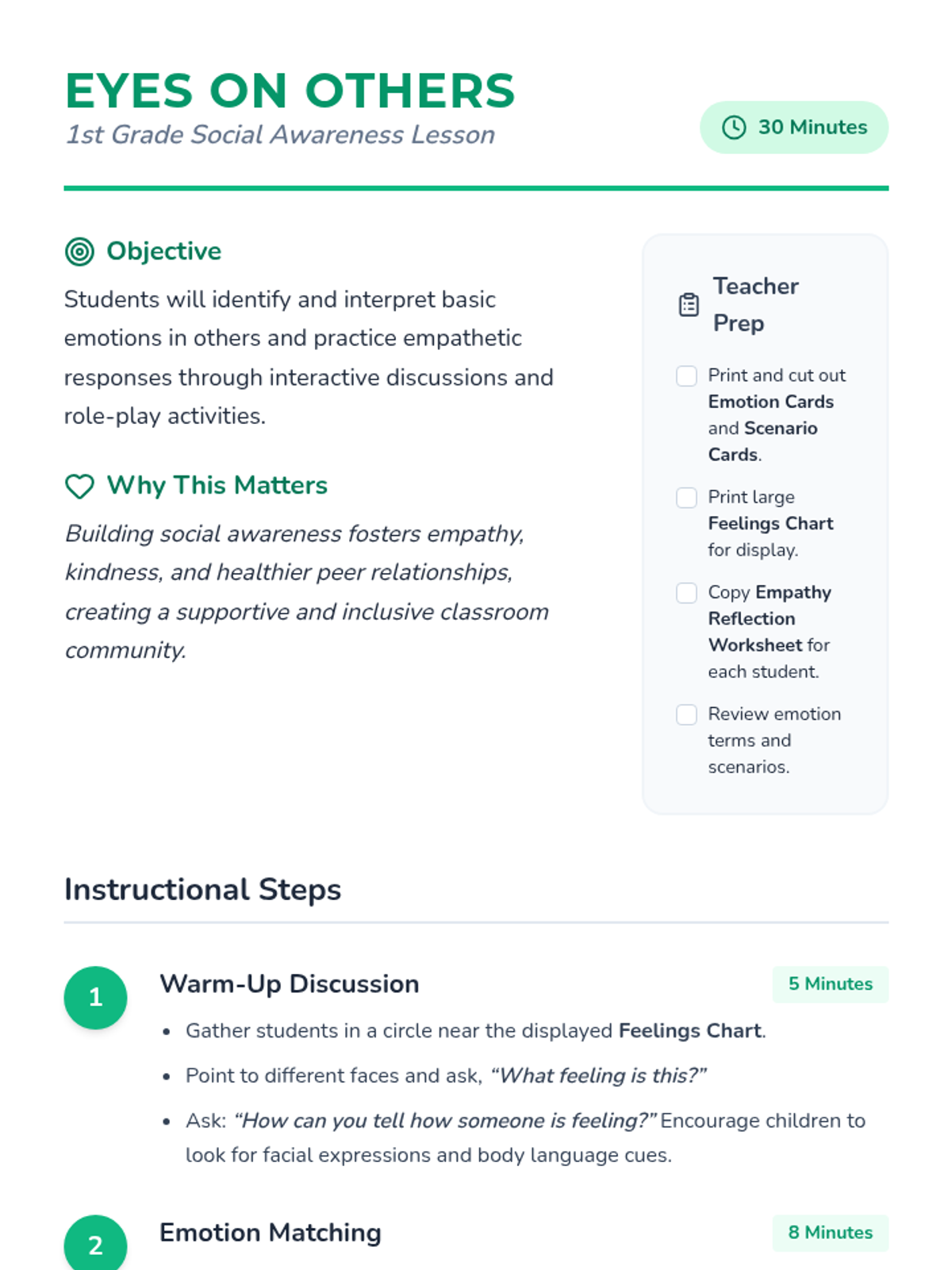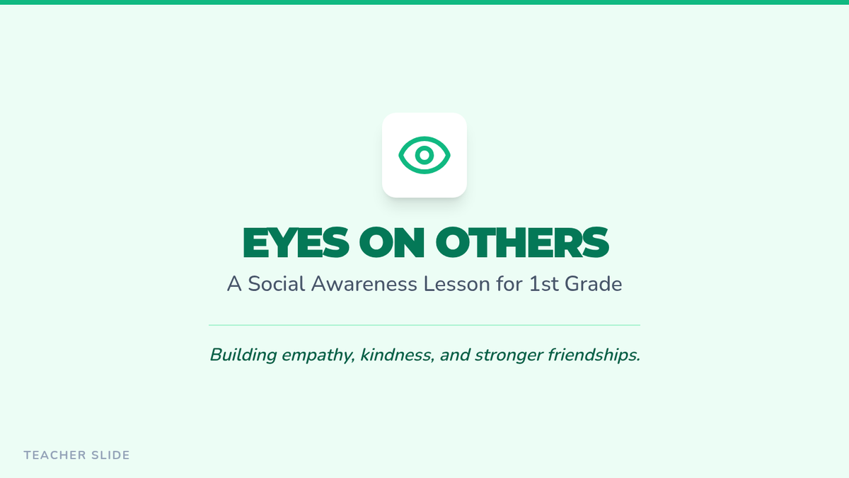 A 30-minute 1st-grade lesson on social awareness, helping students recognize others' feelings and perspectives through interactive matching, role-play, and creative reflection.