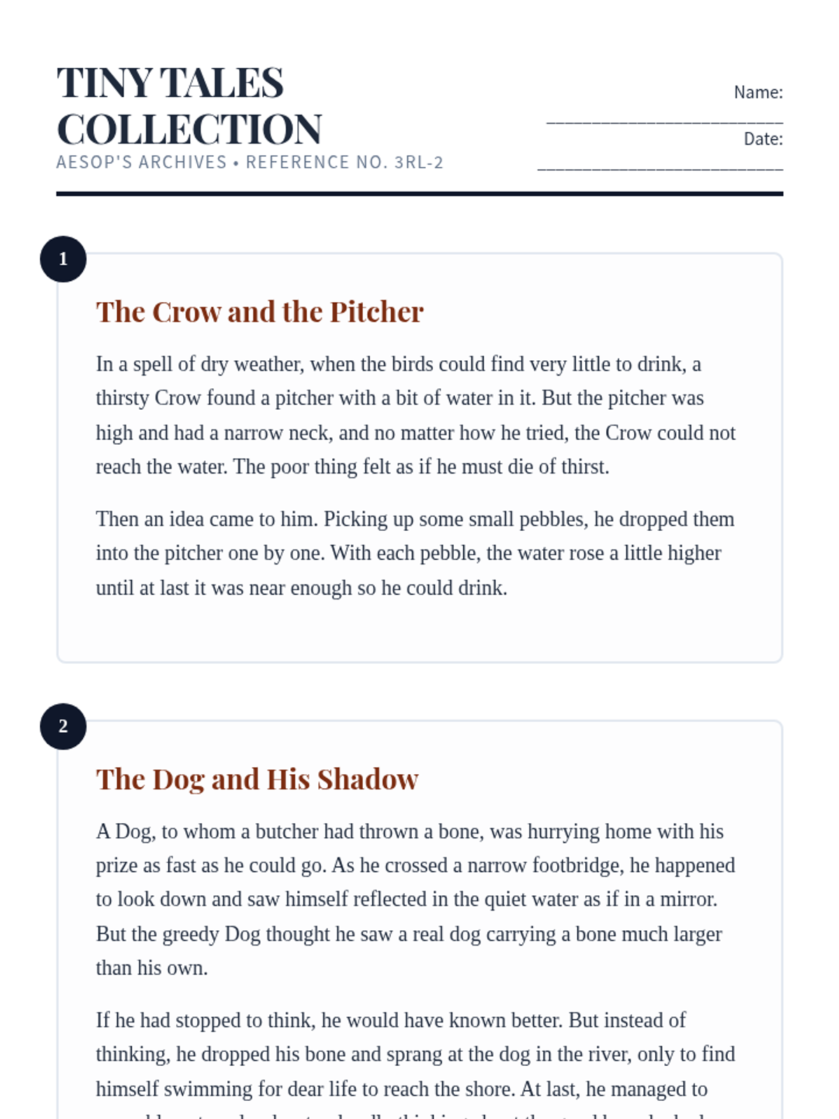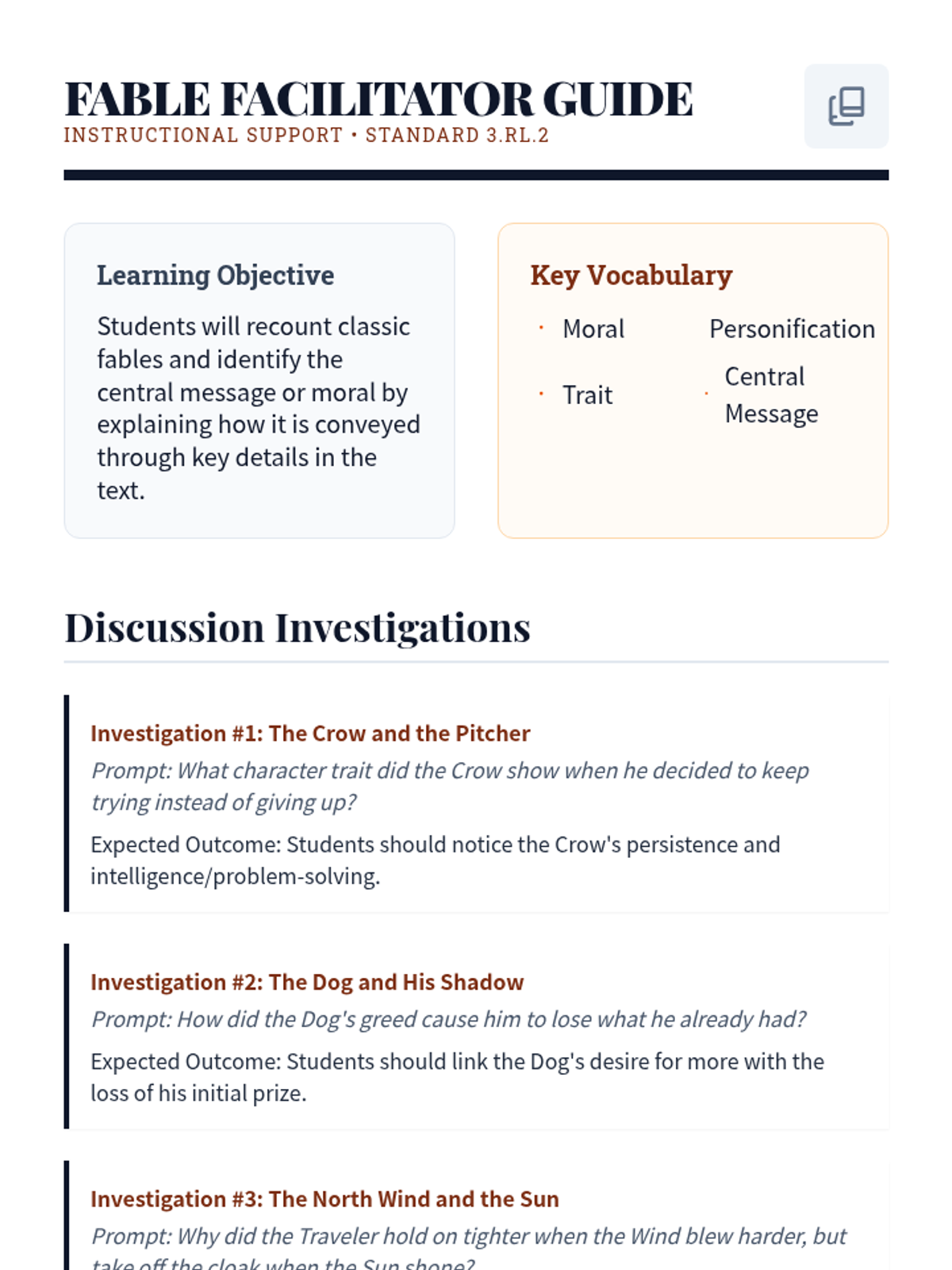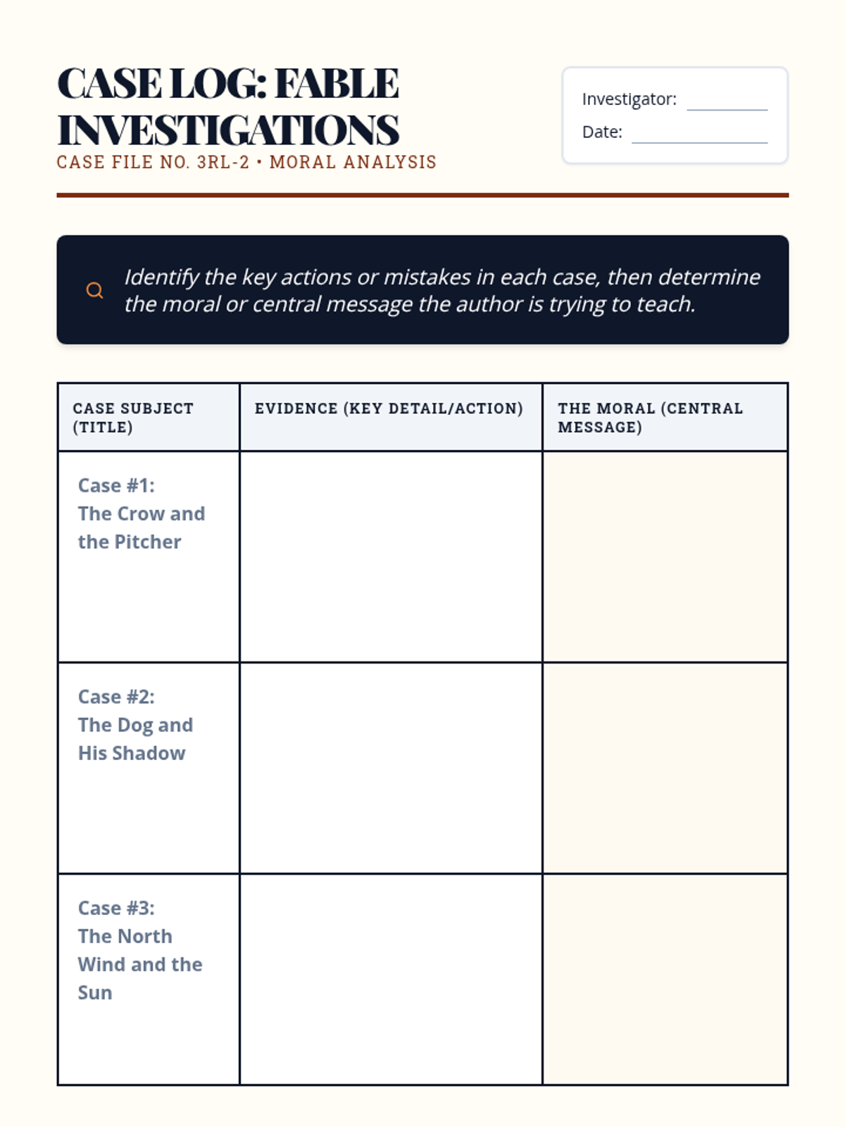 A small group lesson focused on identifying the central message or moral in fables, using key details to support the theme. Students will explore traditional fables and learn to extract life lessons from animal characters.