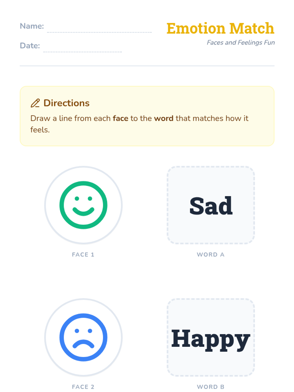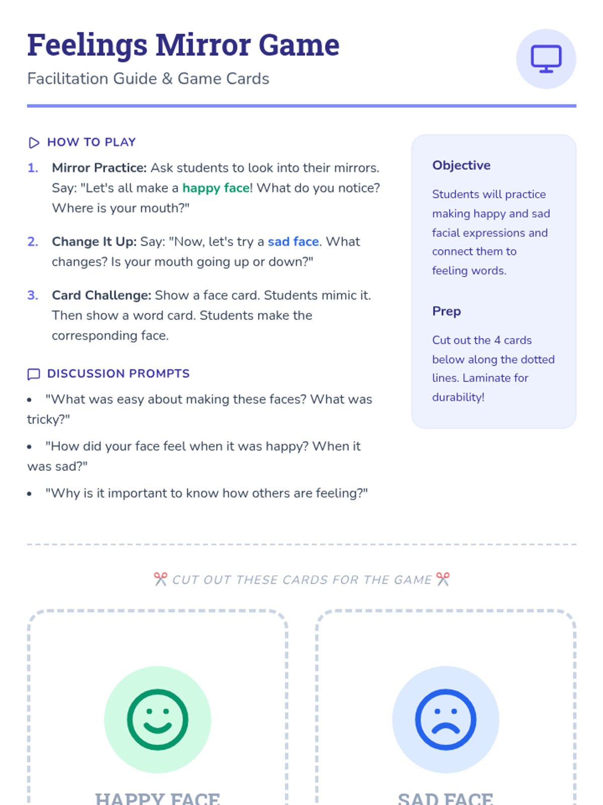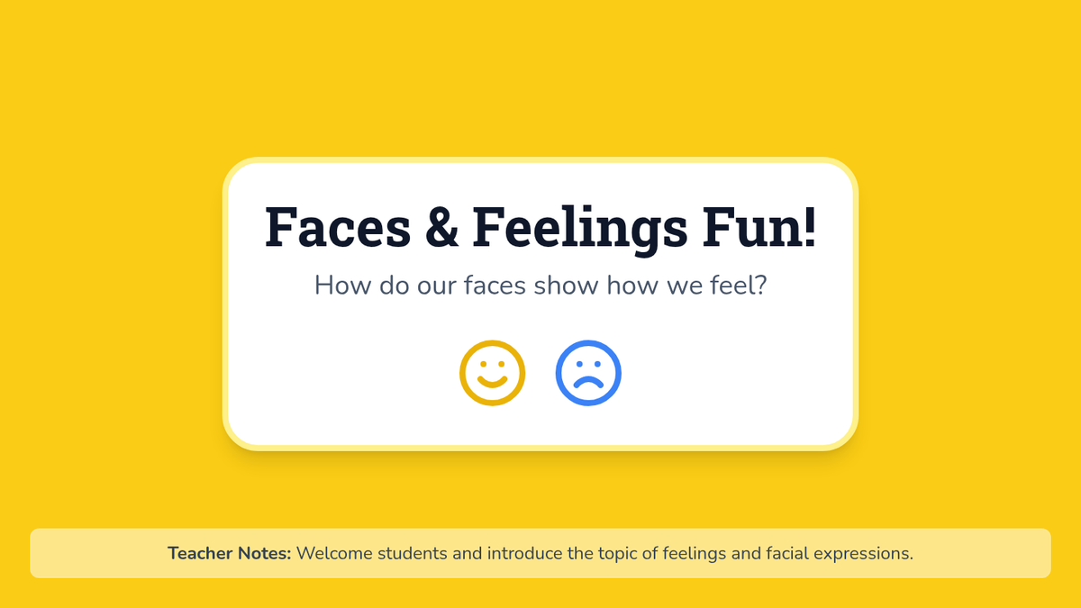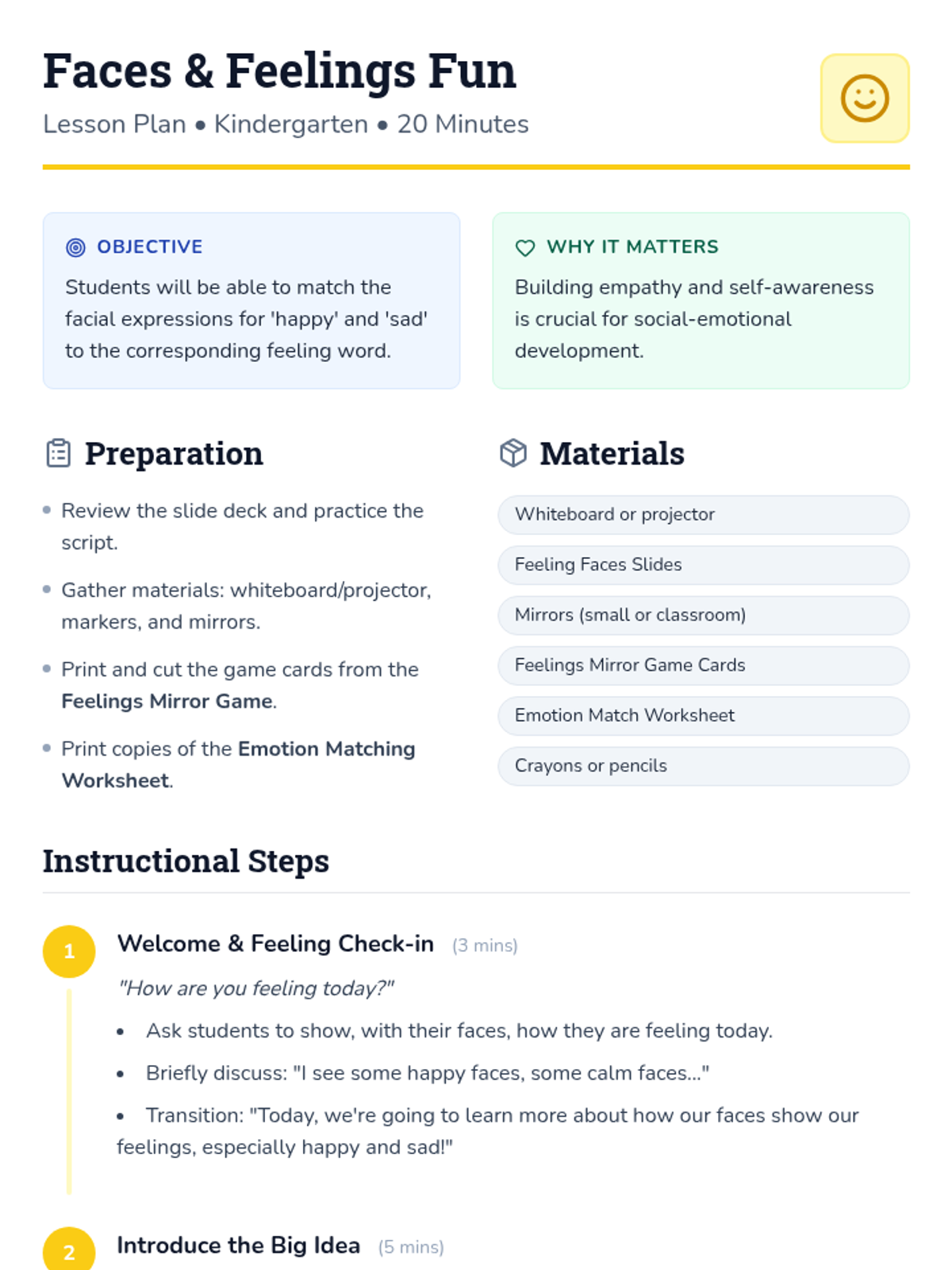 A 20-minute Kindergarten lesson that uses interactive slides, a mirror game, and a matching worksheet to help students identify and express happy and sad emotions.