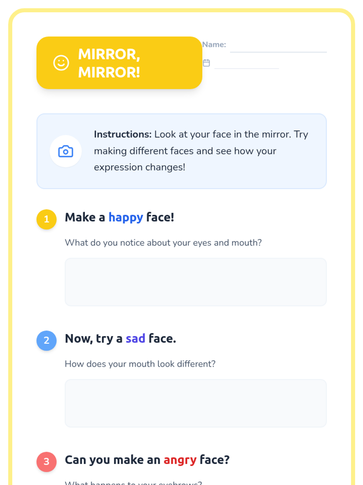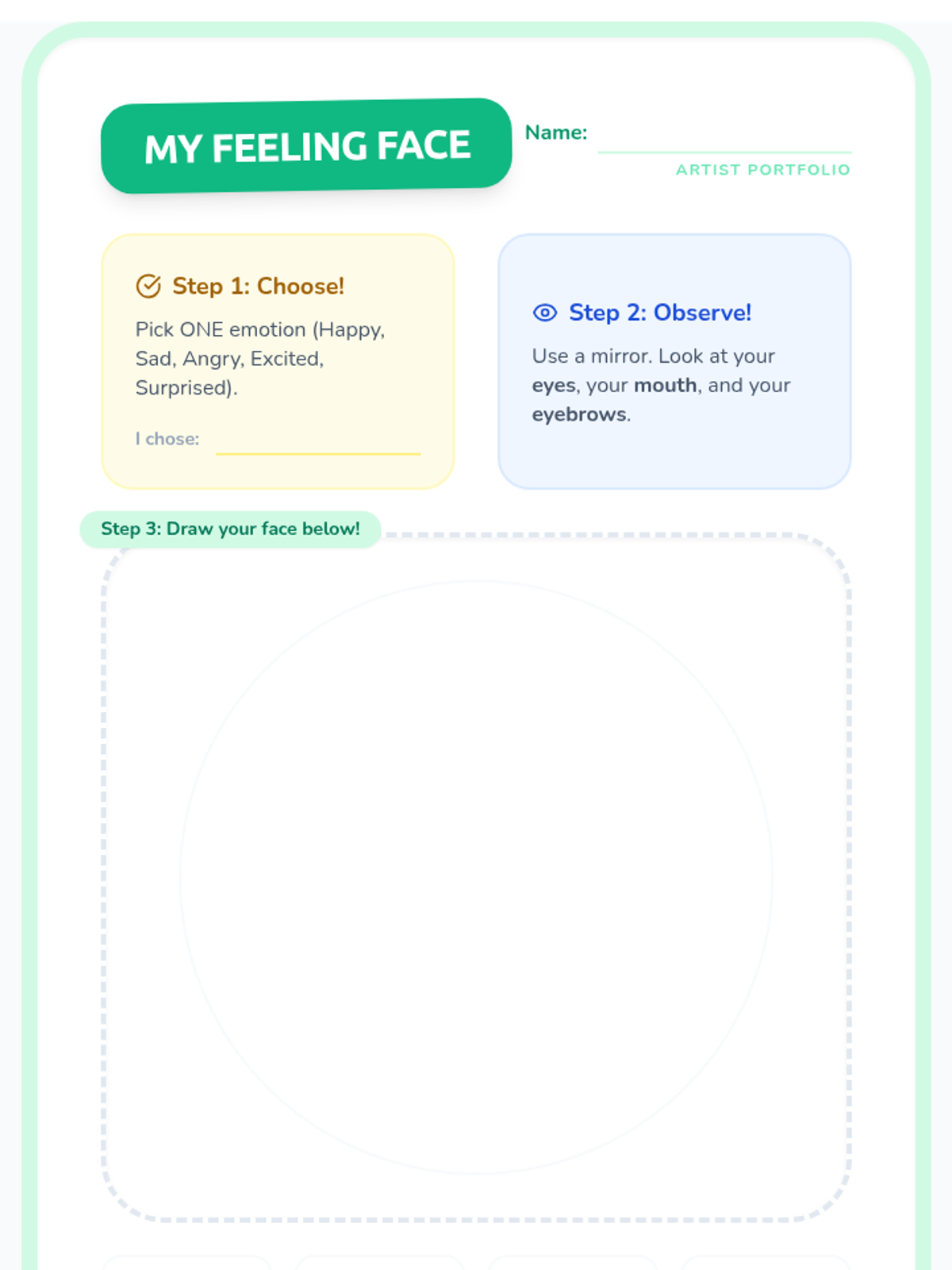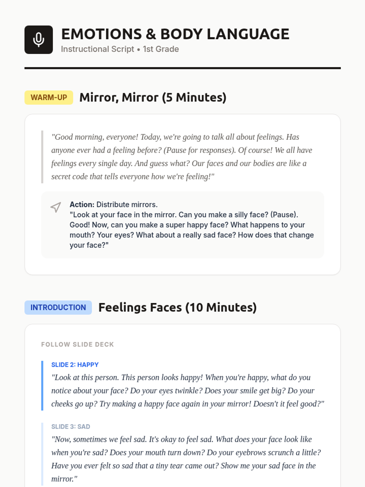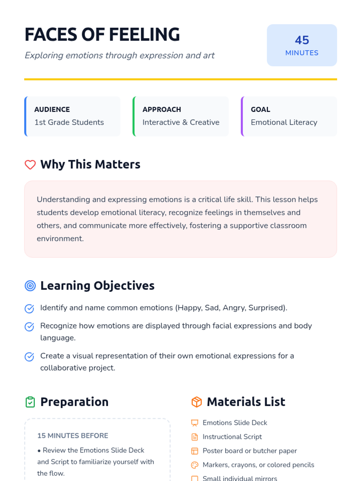 A 45-minute lesson for 1st graders to explore emotional expression through facial expressions and body language, culminating in a collaborative classroom mural.