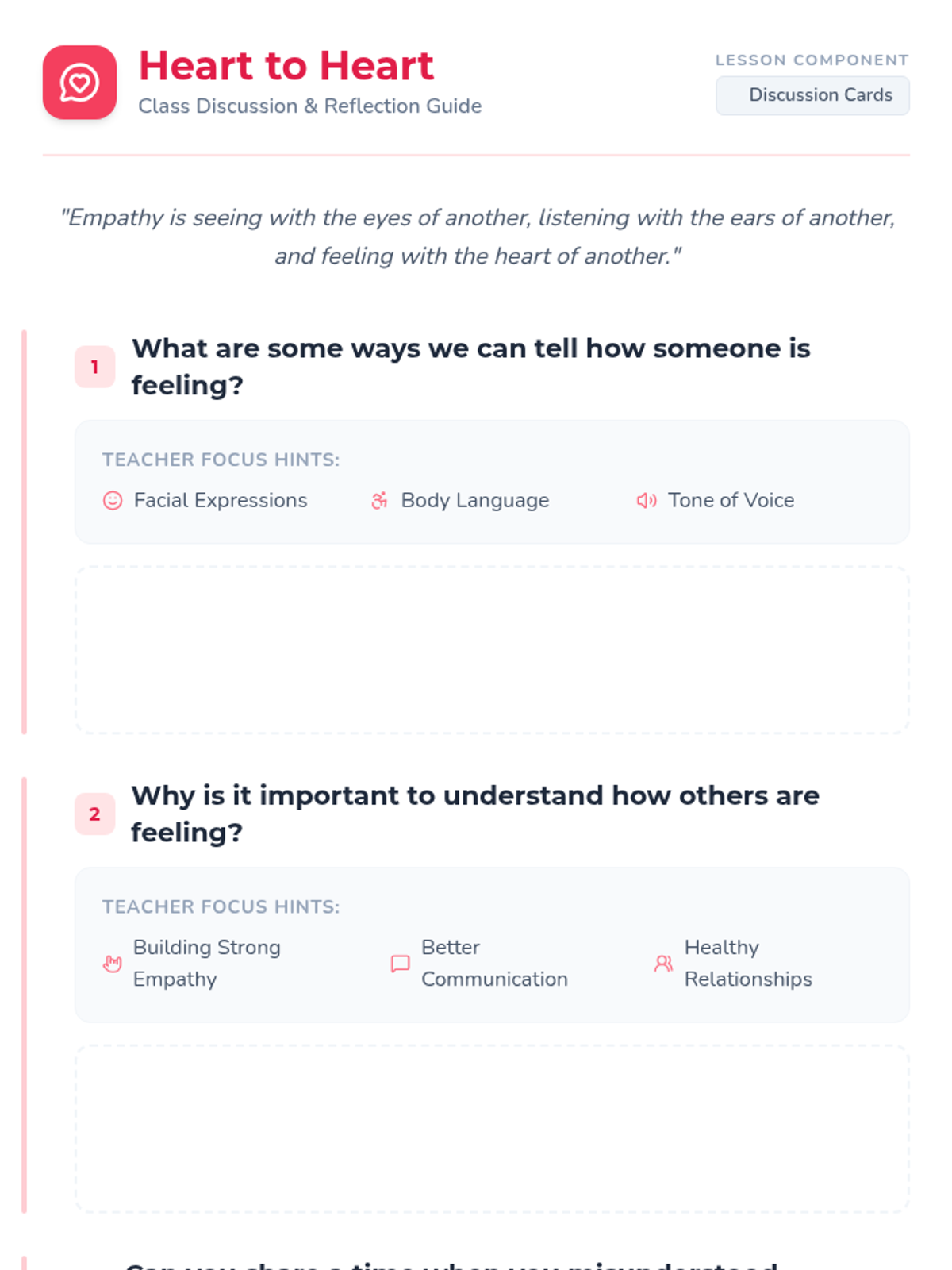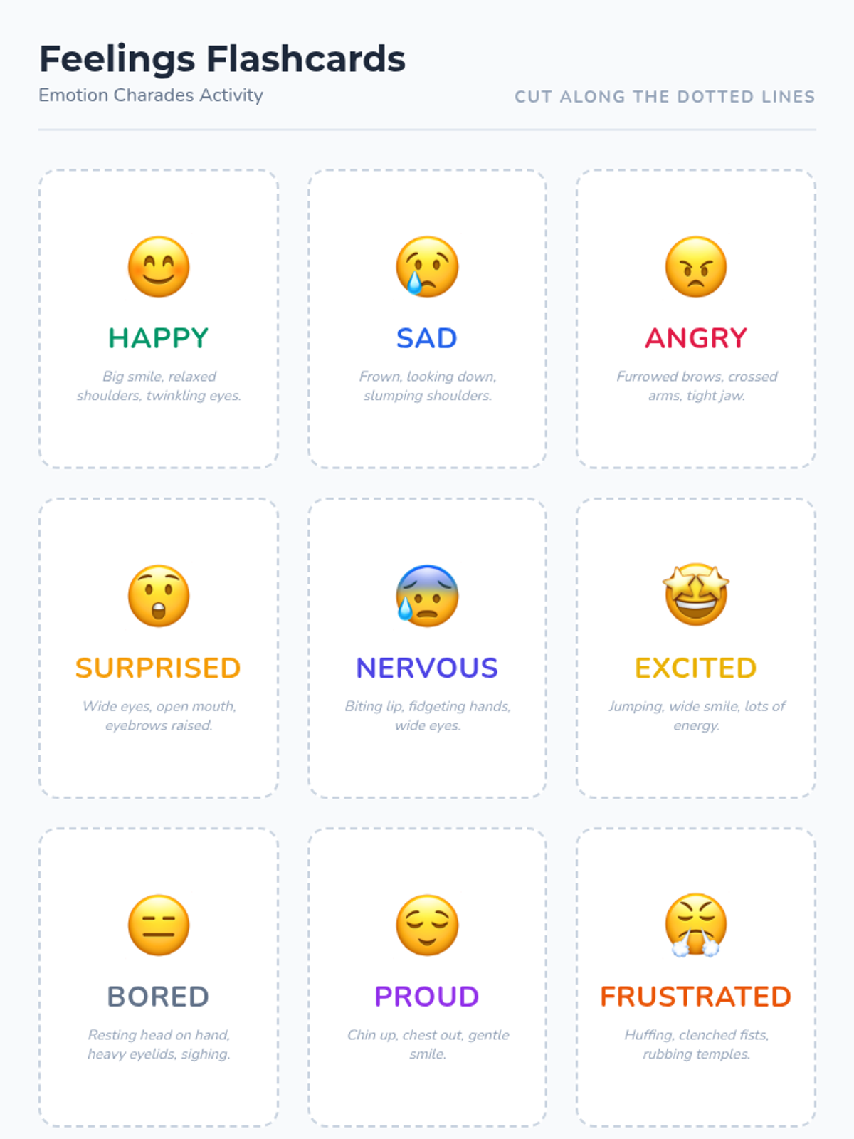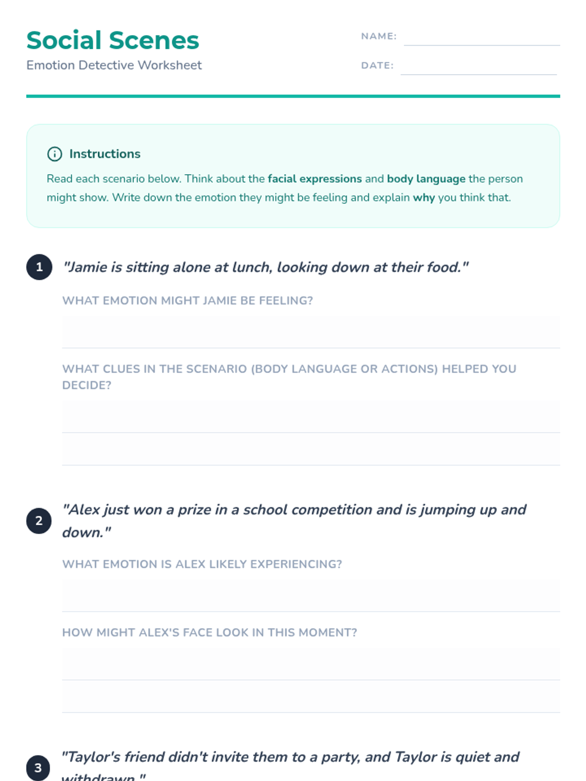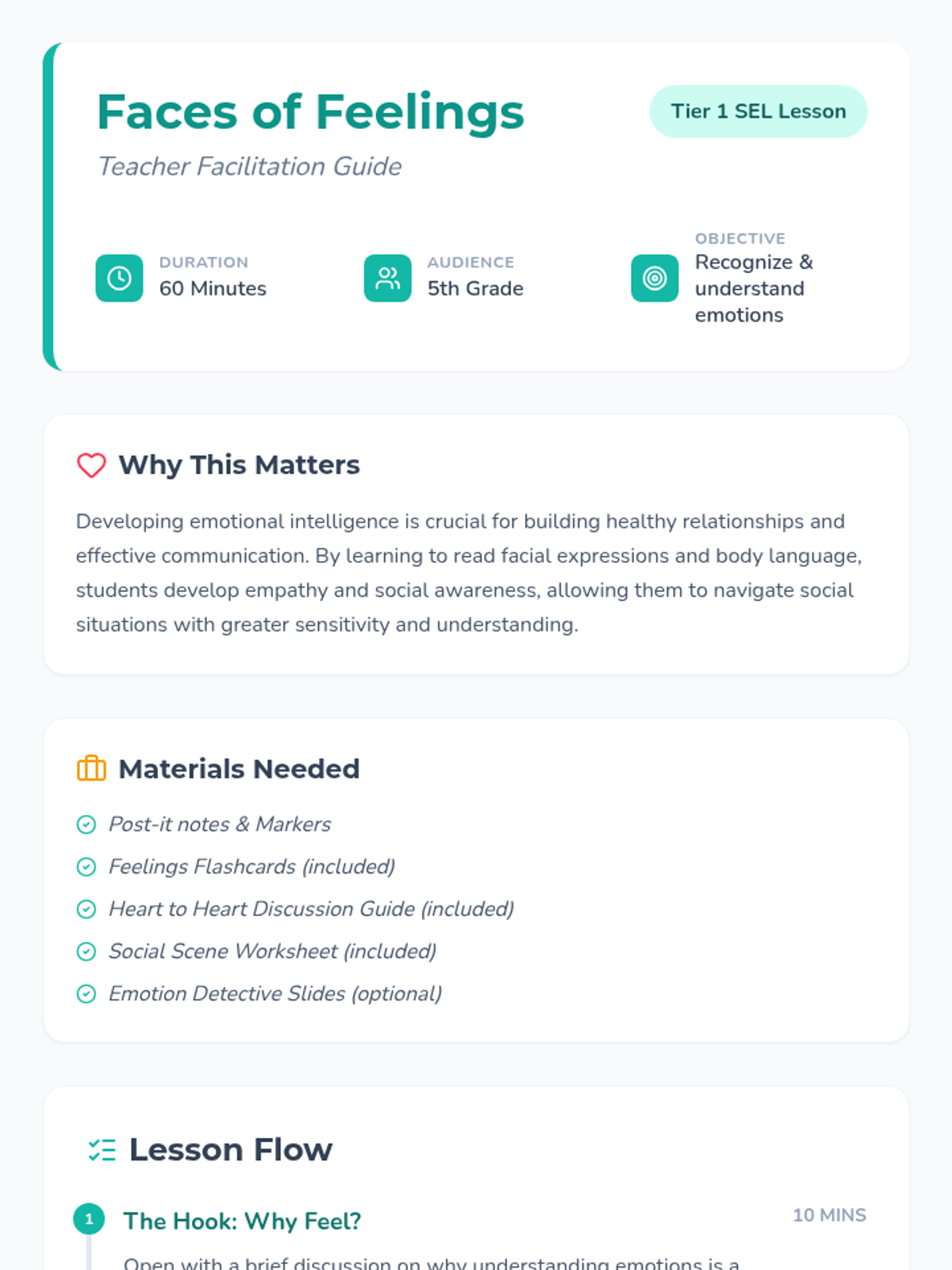 A comprehensive lesson designed to help 5th-grade students recognize and understand emotions through facial expressions, body language, and situational context. Students will practice empathy and social awareness through interactive charades and scenario analysis.