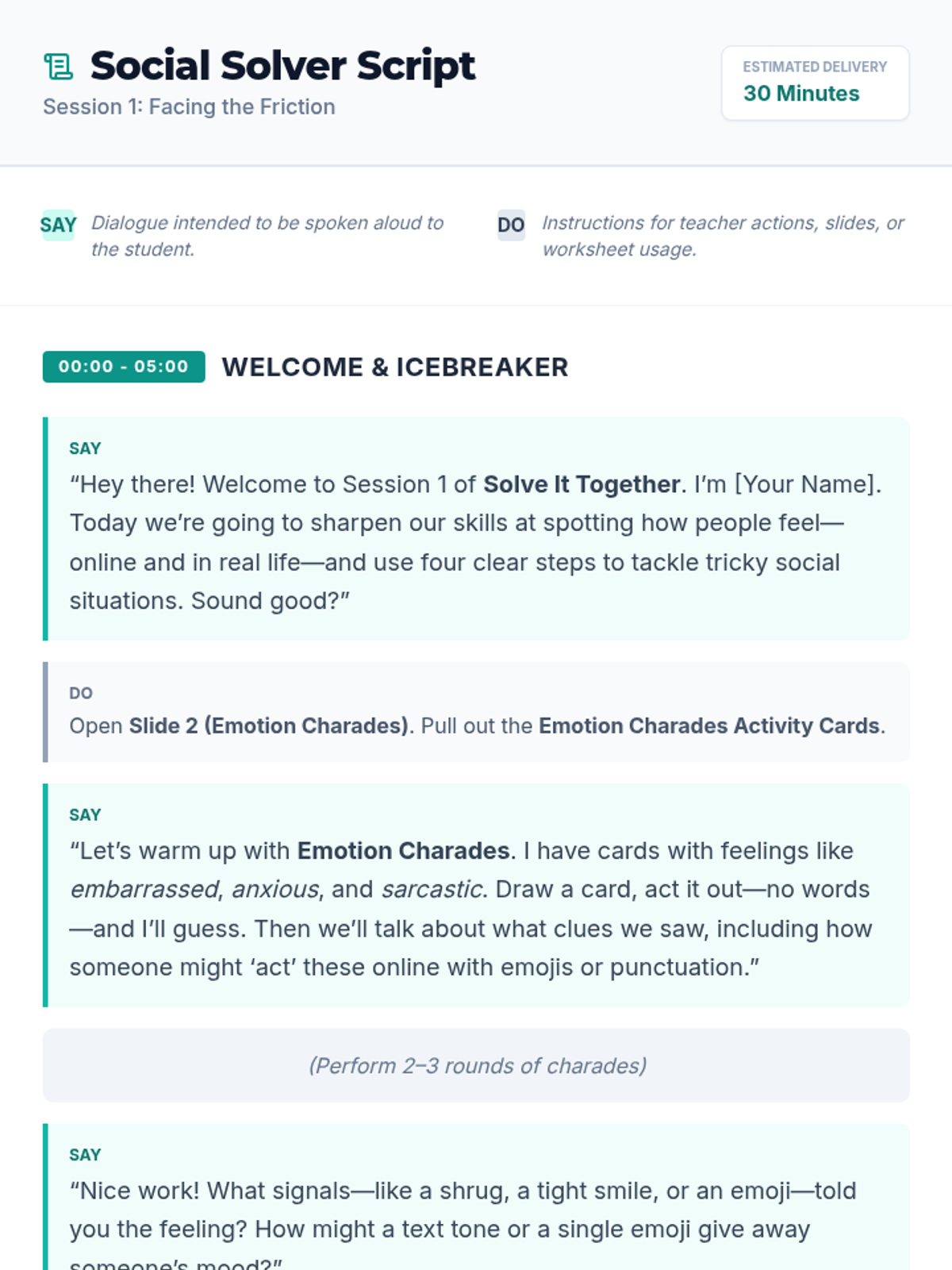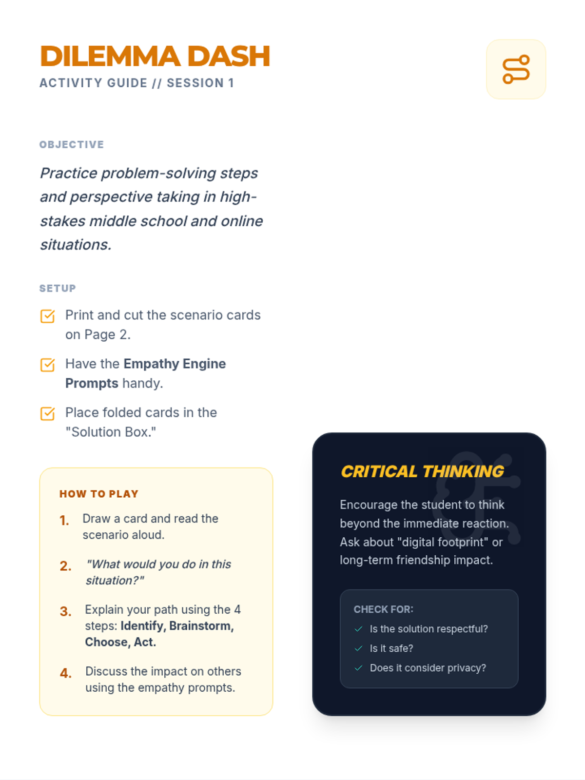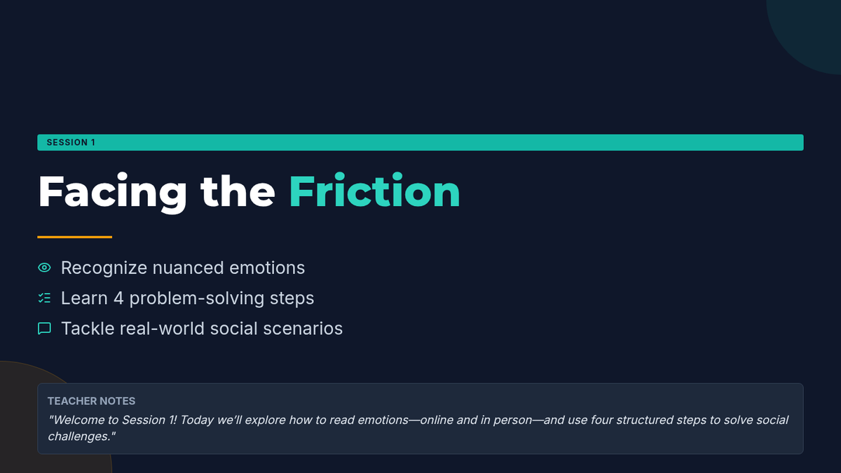 An introductory session focused on identifying social problems and learning a four-step framework for resolving conflicts, with a specific emphasis on digital communication and nuanced emotions.
