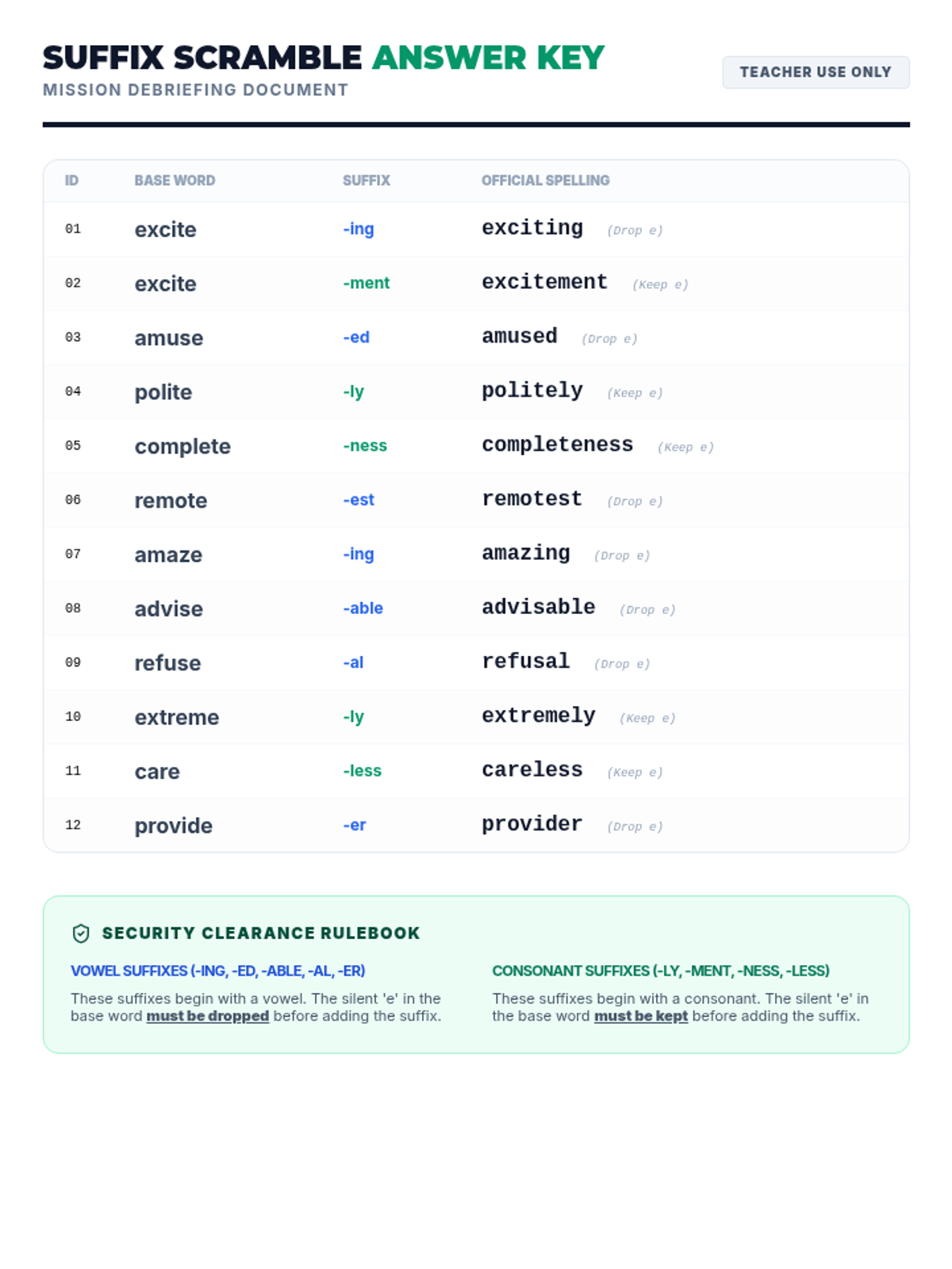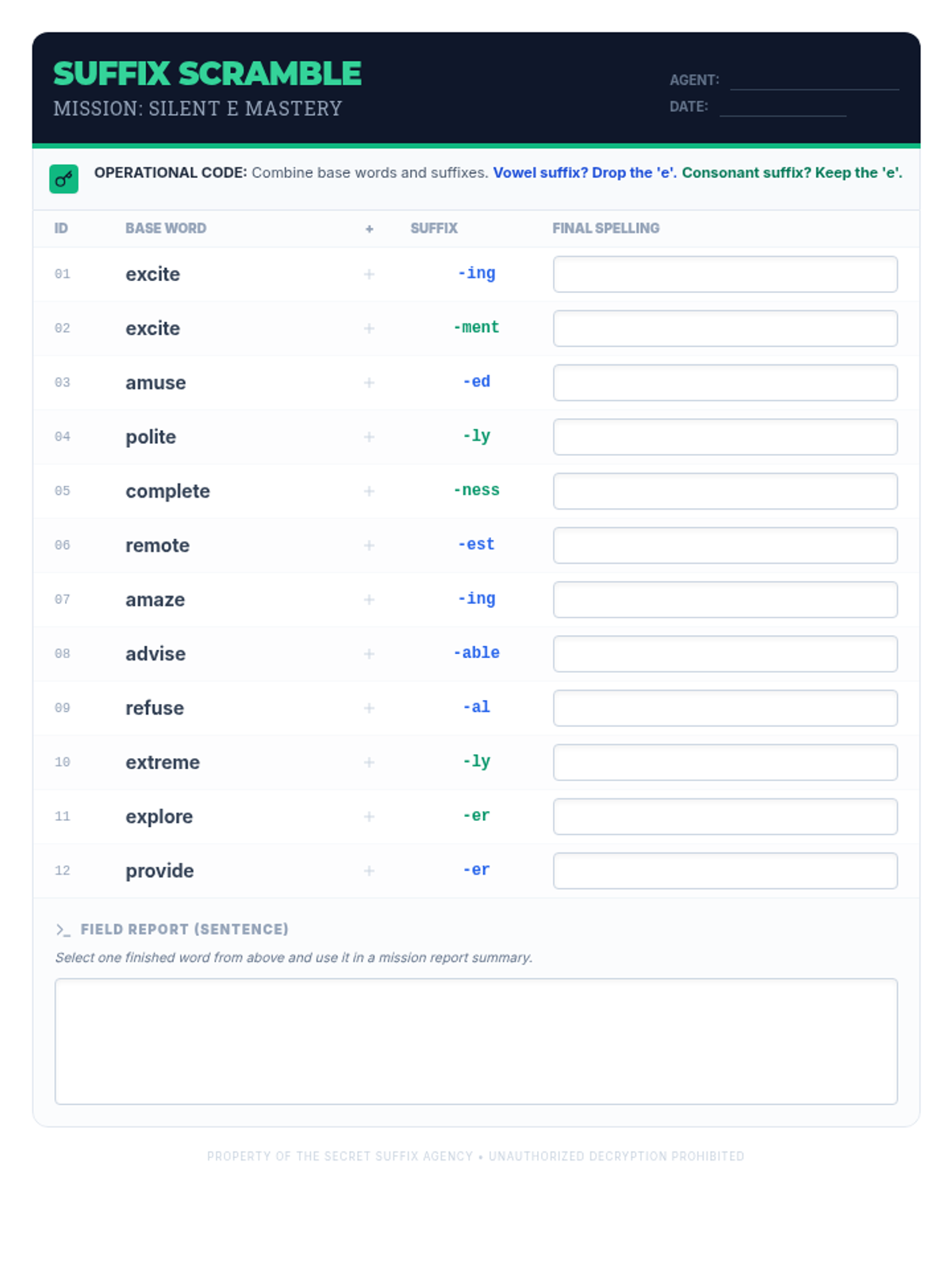 A comprehensive lesson on adding suffixes to multi-syllabic words ending in a silent 'e', focusing on the rules for dropping or keeping the 'e' based on the suffix type.
