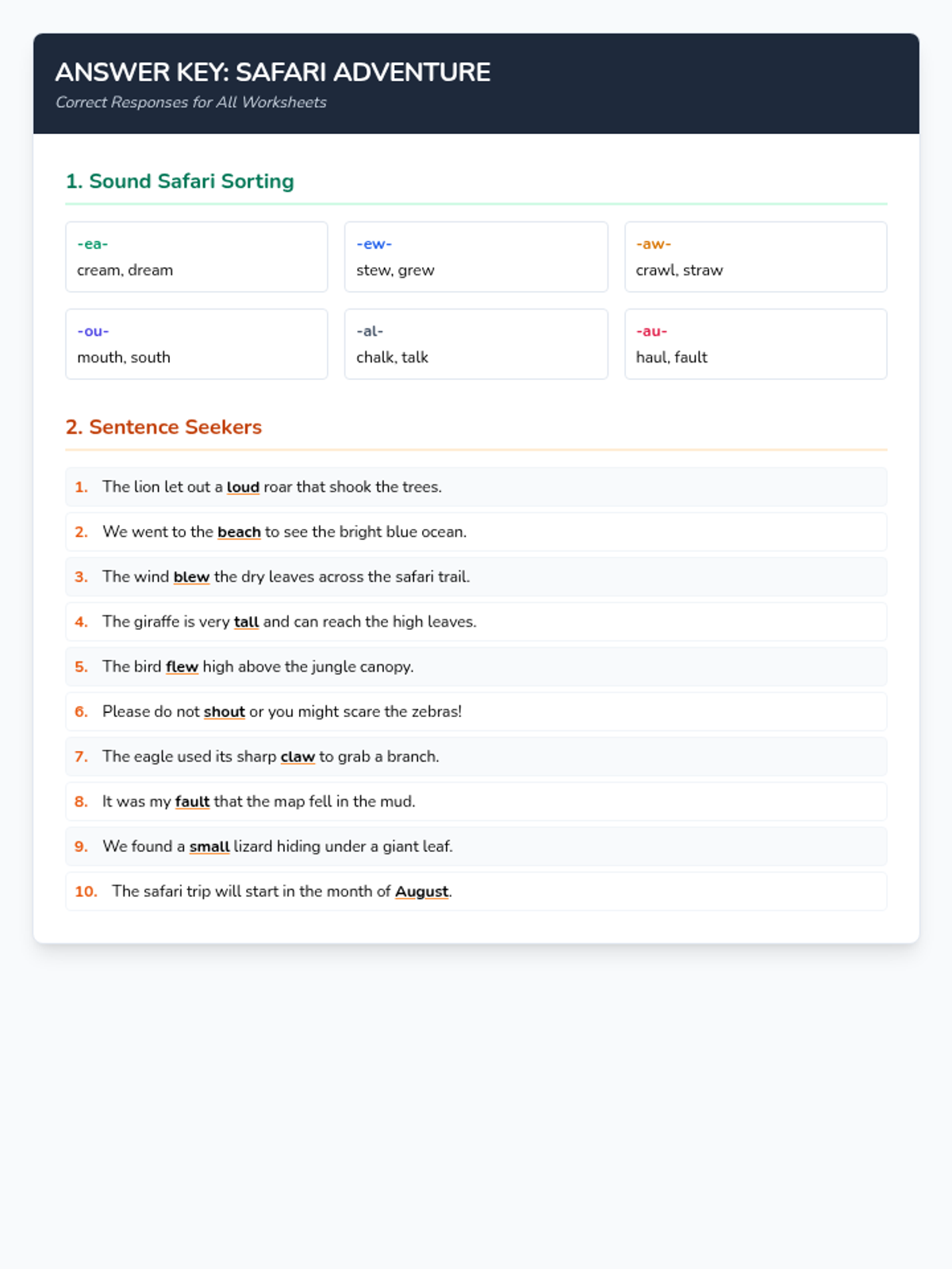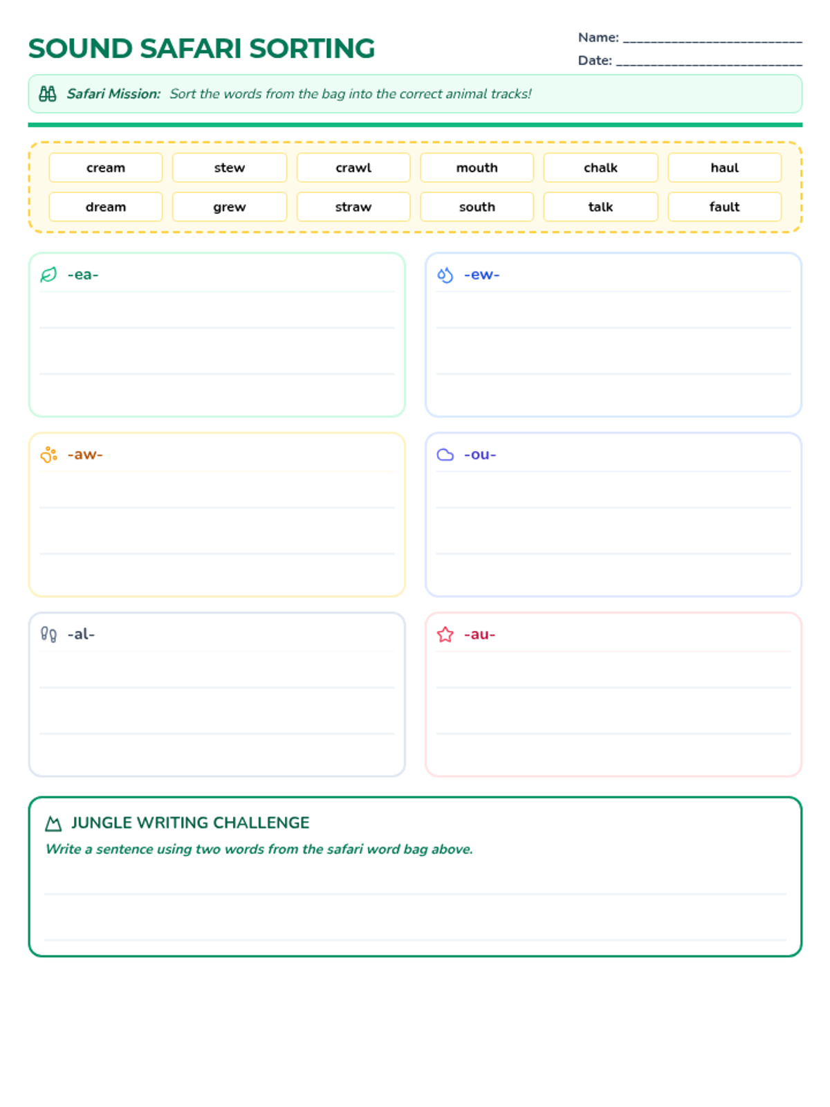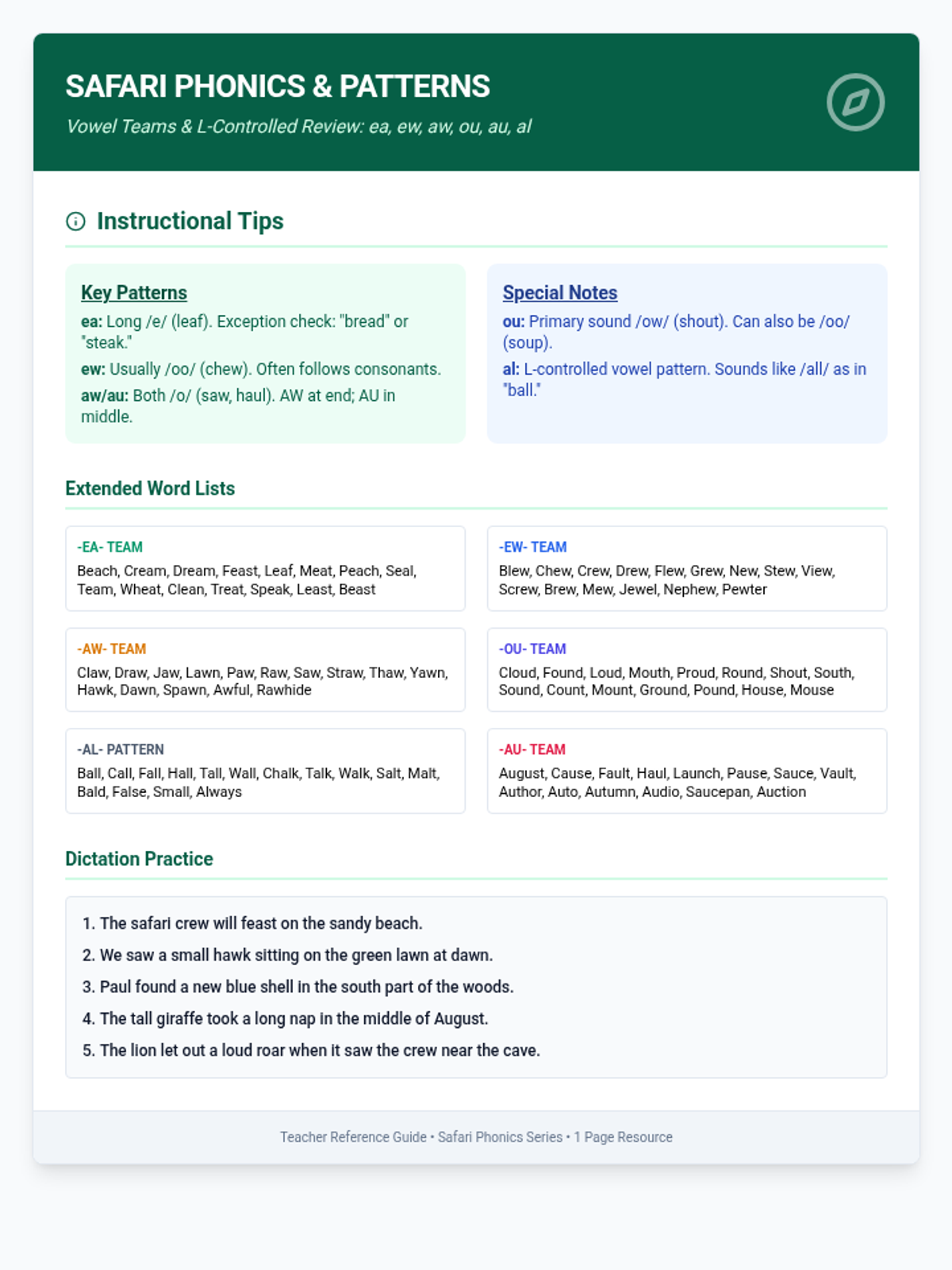 A phonics-focused lesson reviewing the vowel teams ea, ew, aw, ou, al, and au through an engaging safari-themed adventure. Students will practice identifying, sorting, and using these sounds in context.