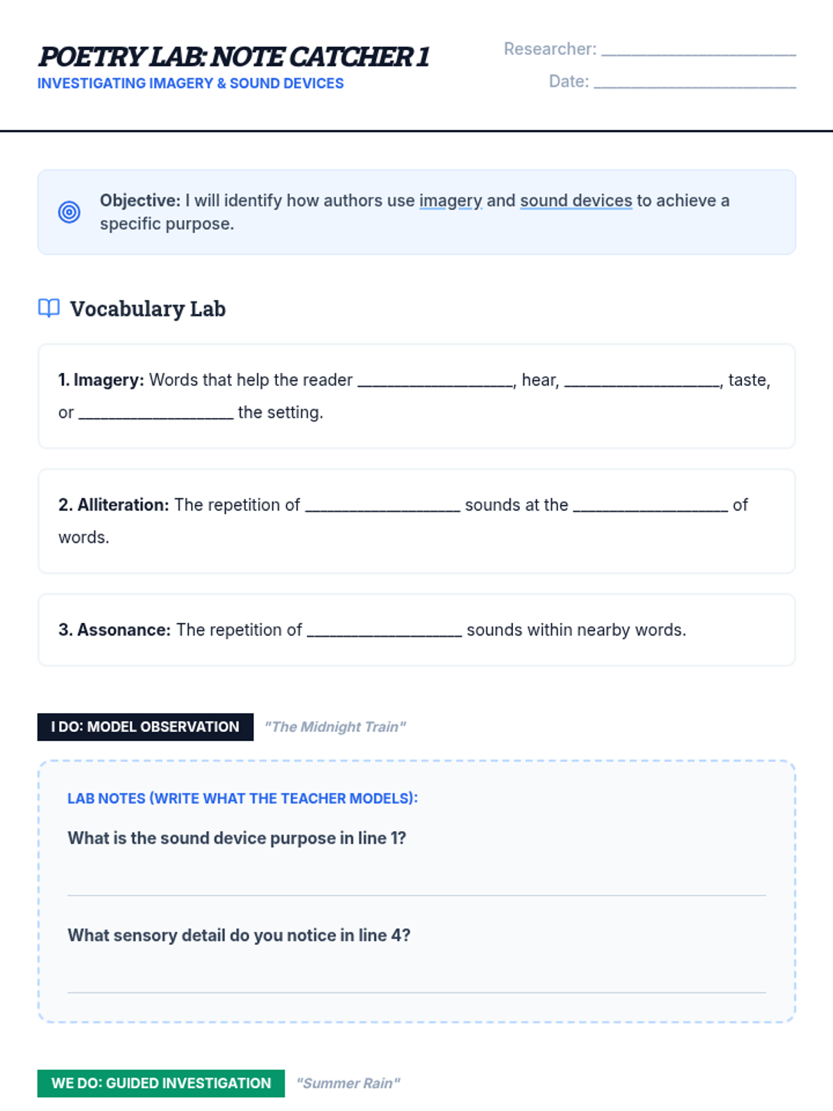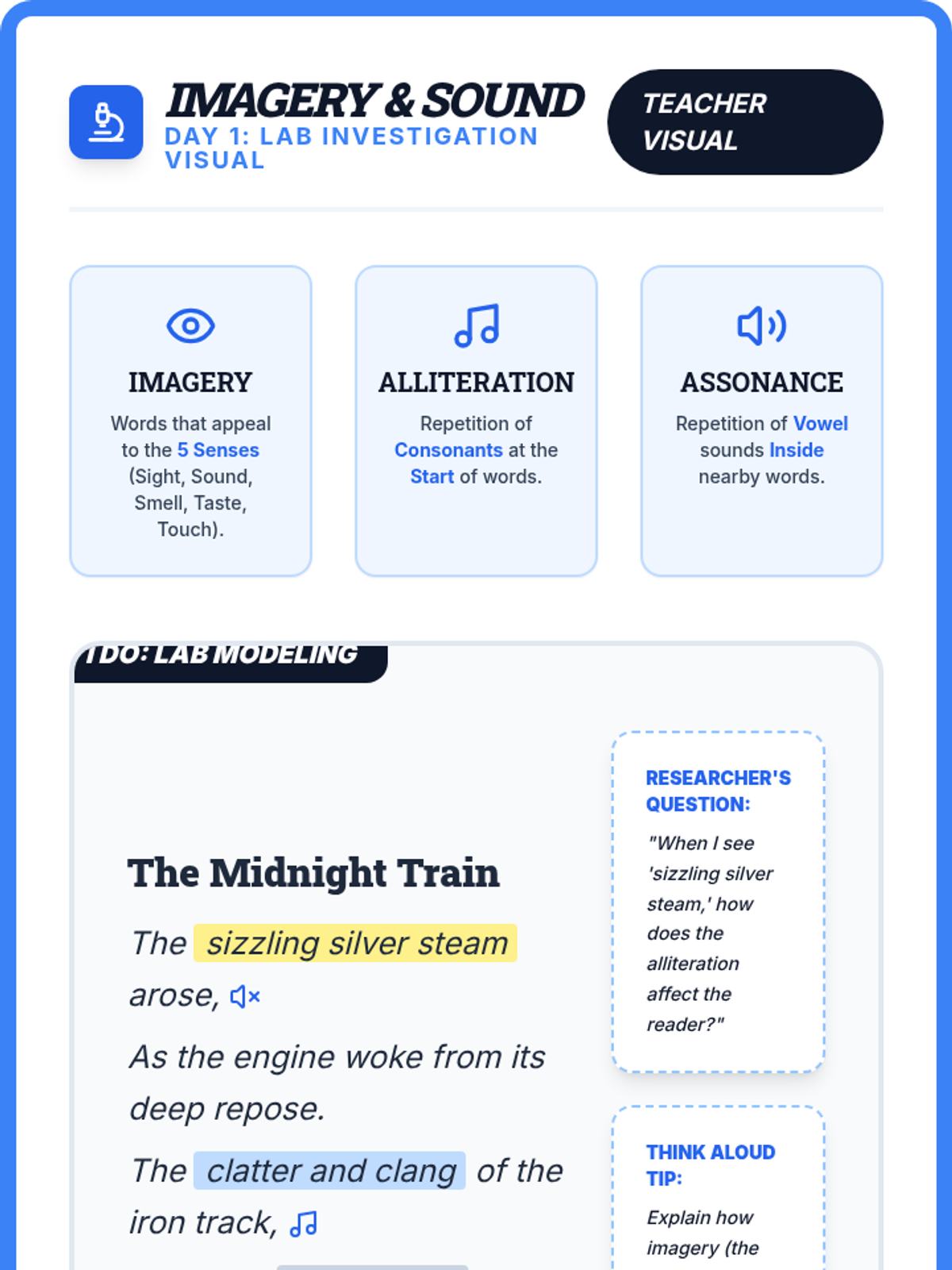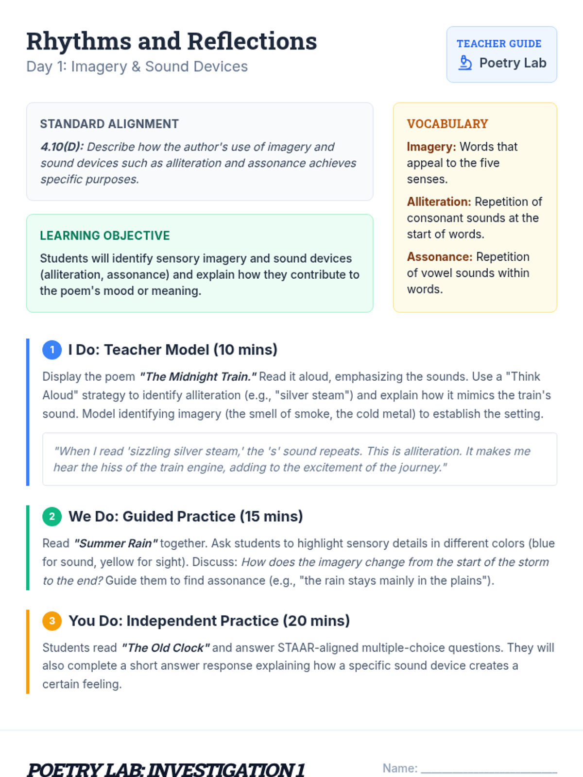A focused reteach lesson on sensory imagery and sound devices like alliteration and assonance in poetry, featuring teacher-led modeling and collaborative practice.