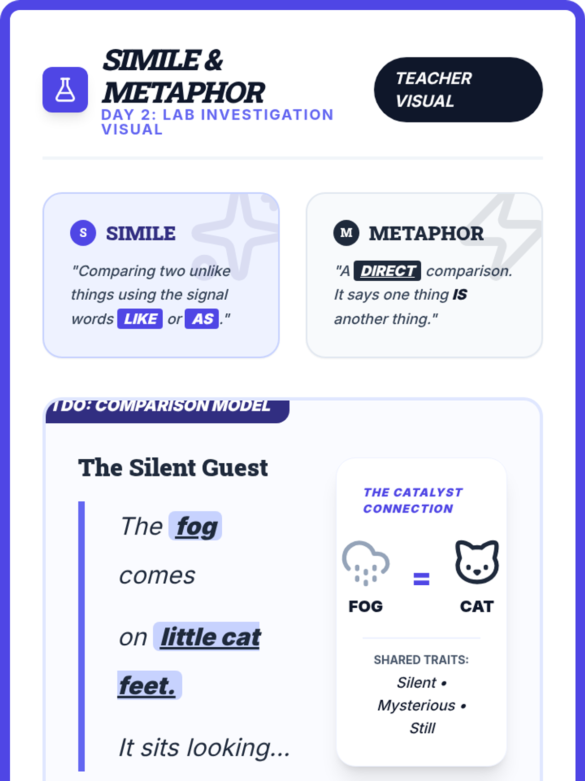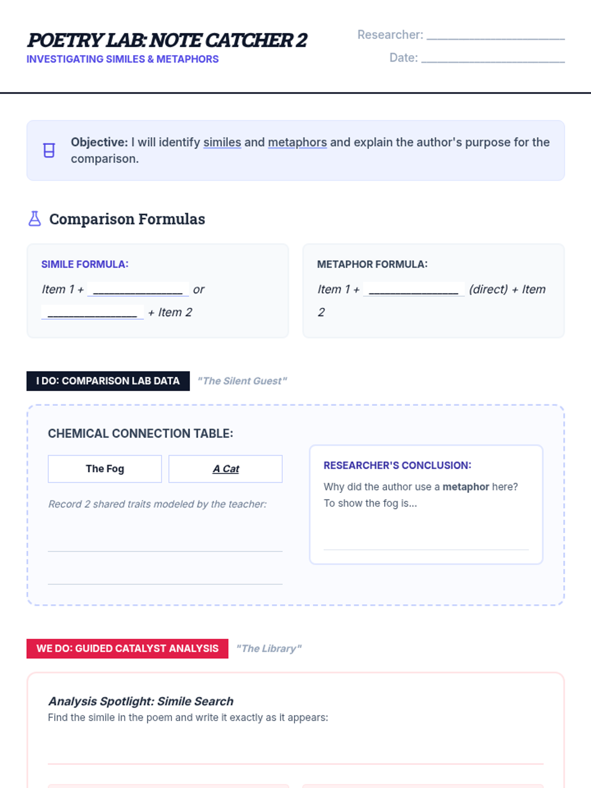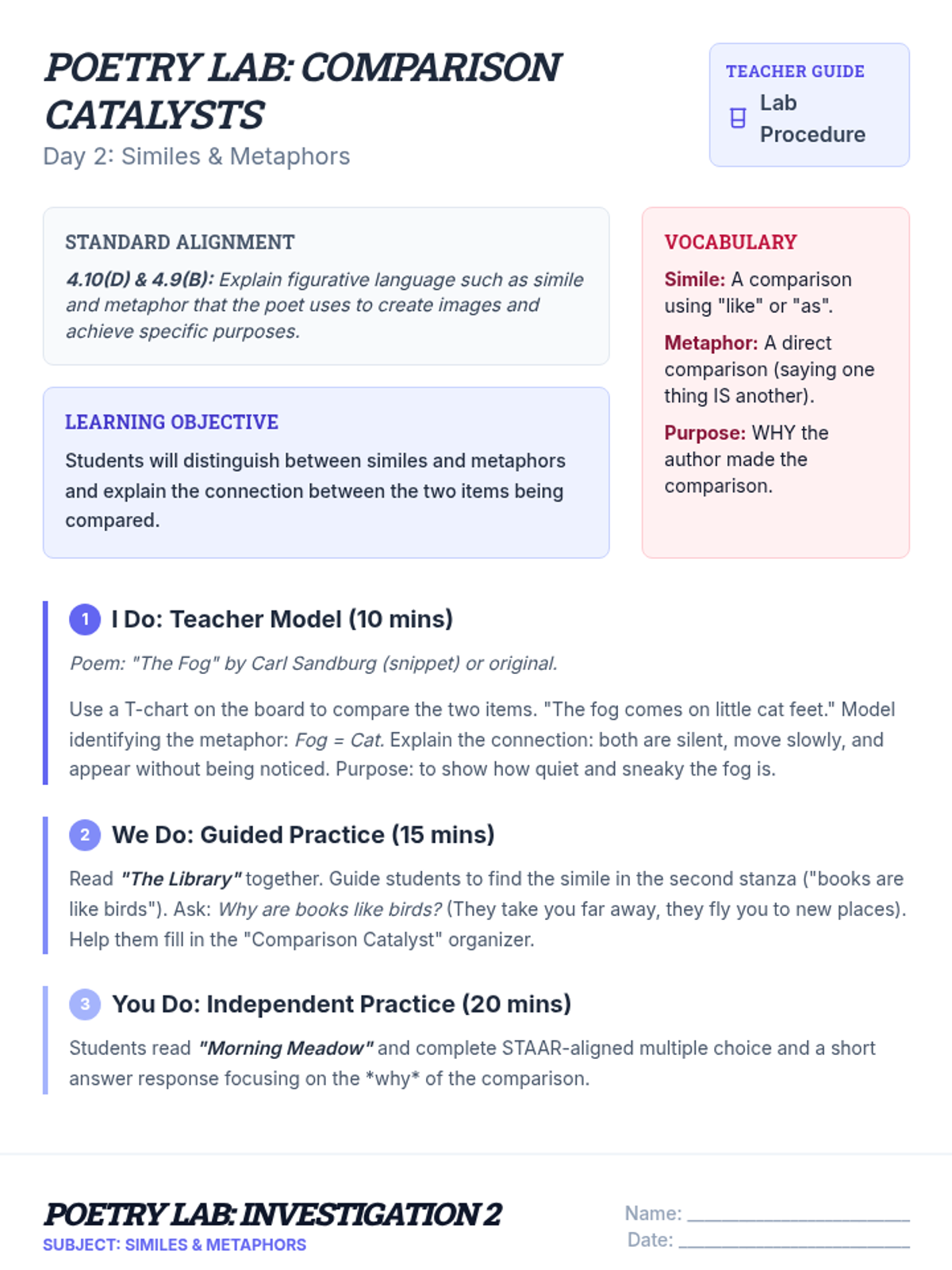 Explores the use of comparisons in poetry, specifically focusing on similes and metaphors to help students understand how authors create meaning.