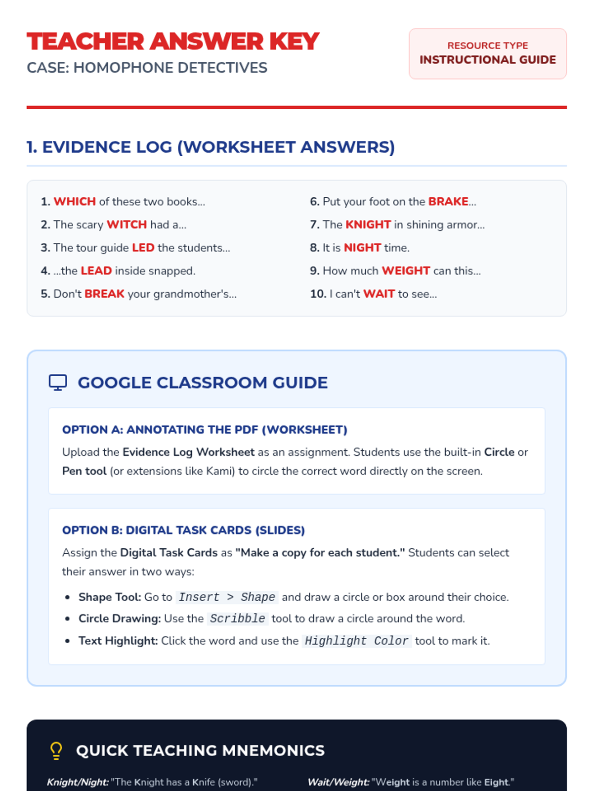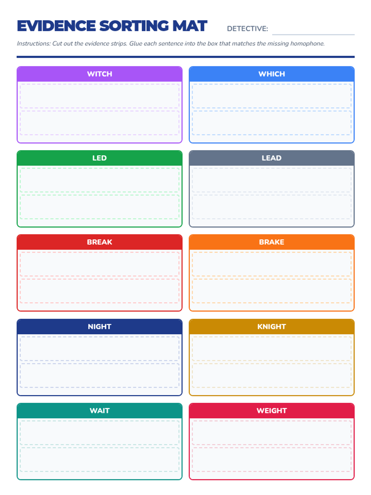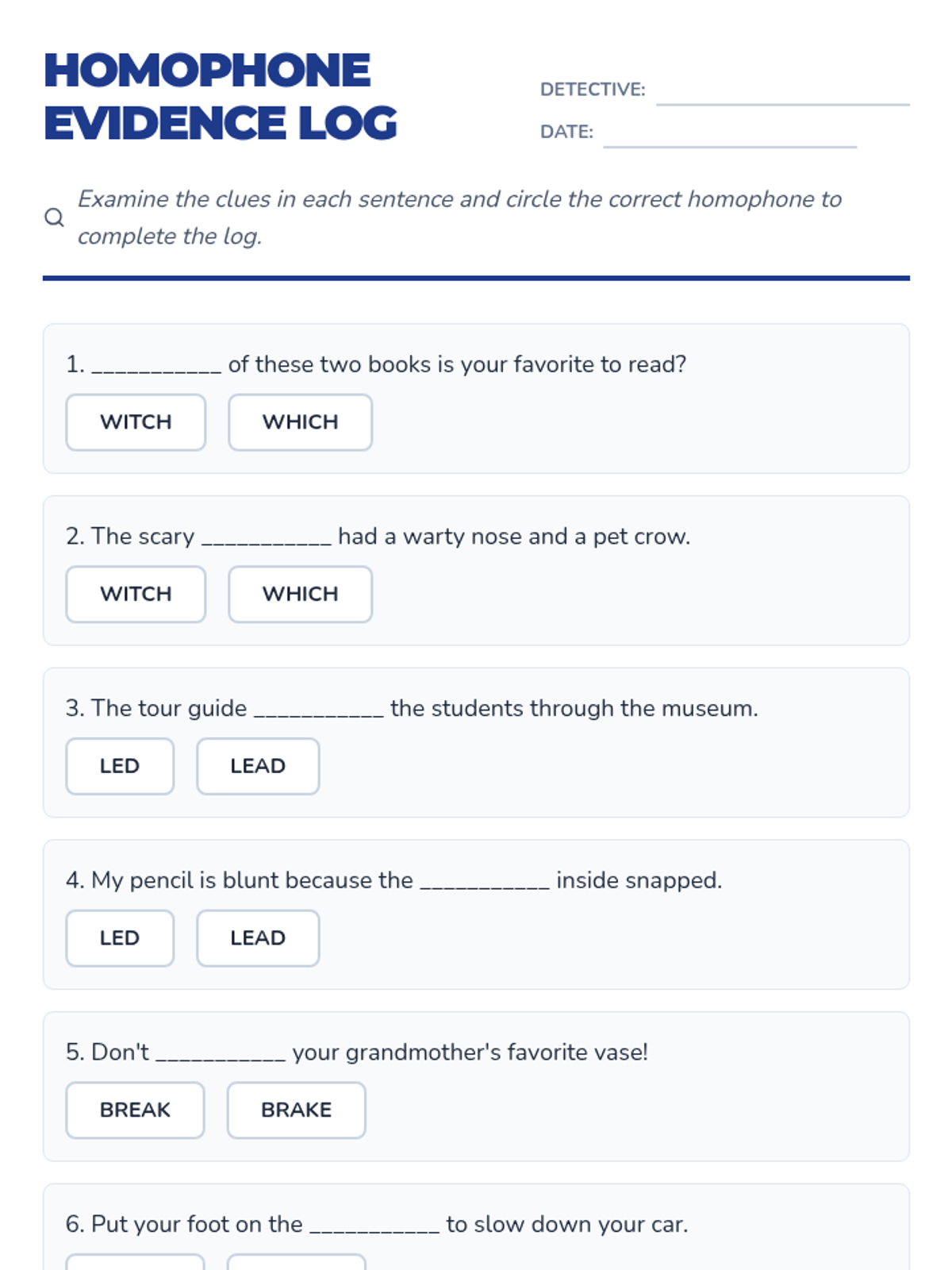 A detective-themed lesson focusing on three tricky homophone pairs: witch/which, led/lead, and break/brake. Students will identify meanings through context and practice using them correctly in sentences.
