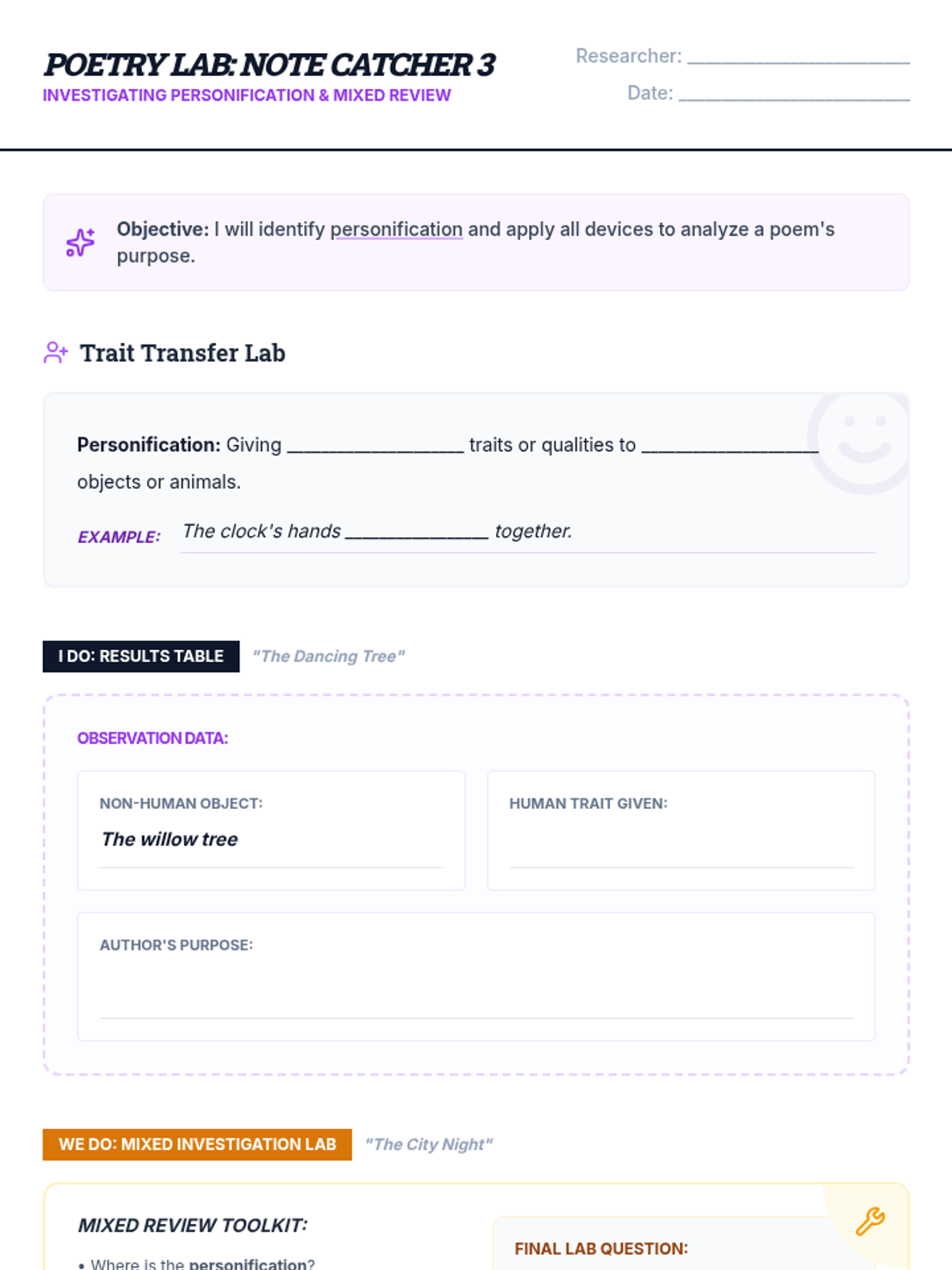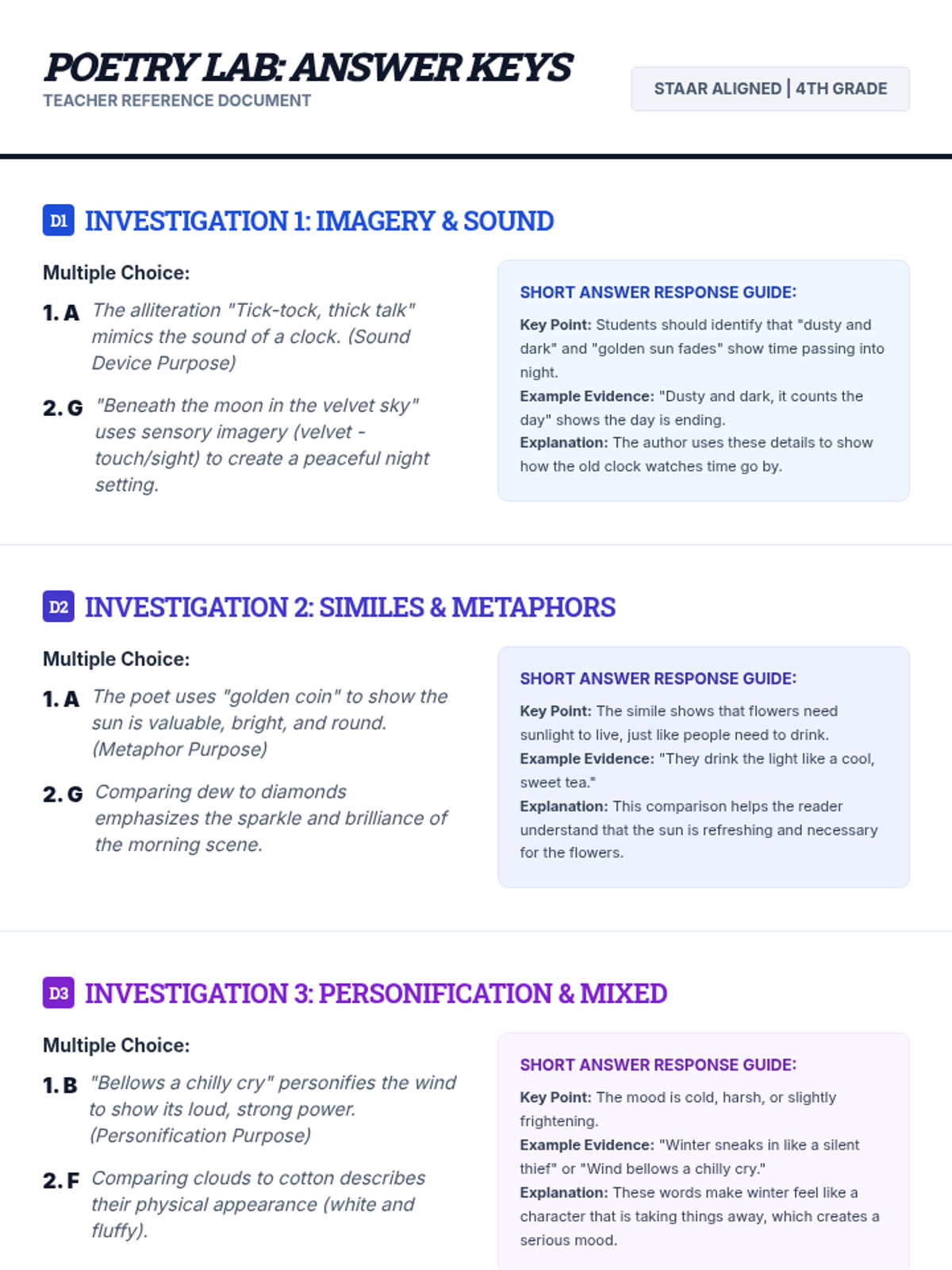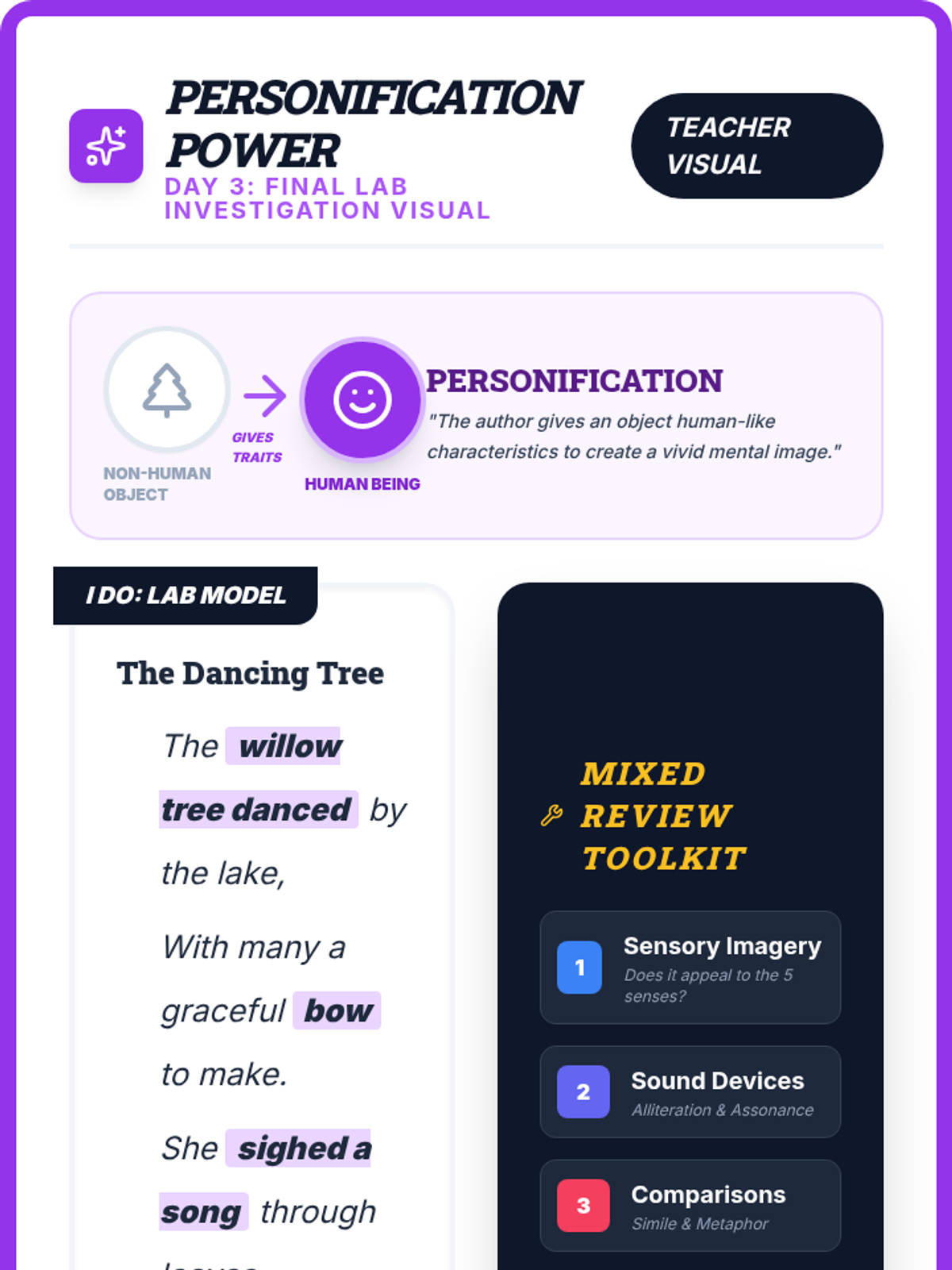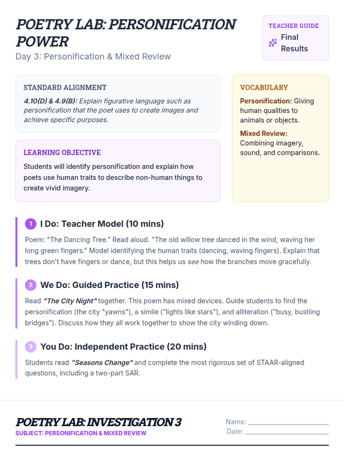 A summative review focusing on personification and mixed practice of all previously learned figurative language and sound devices to prepare for STAAR-style assessments.