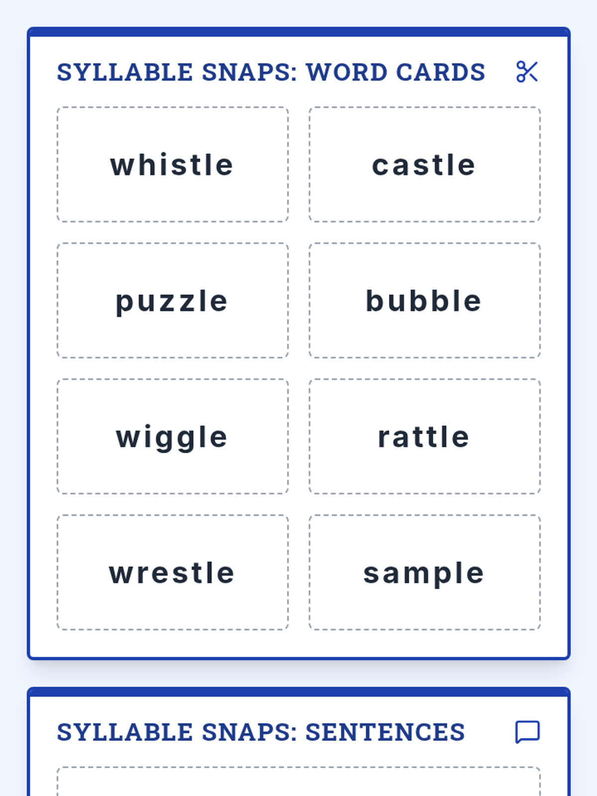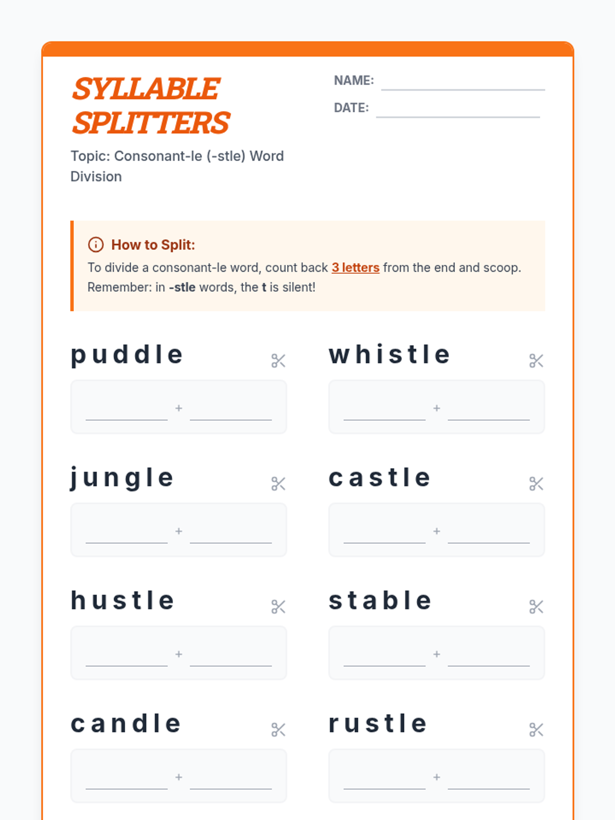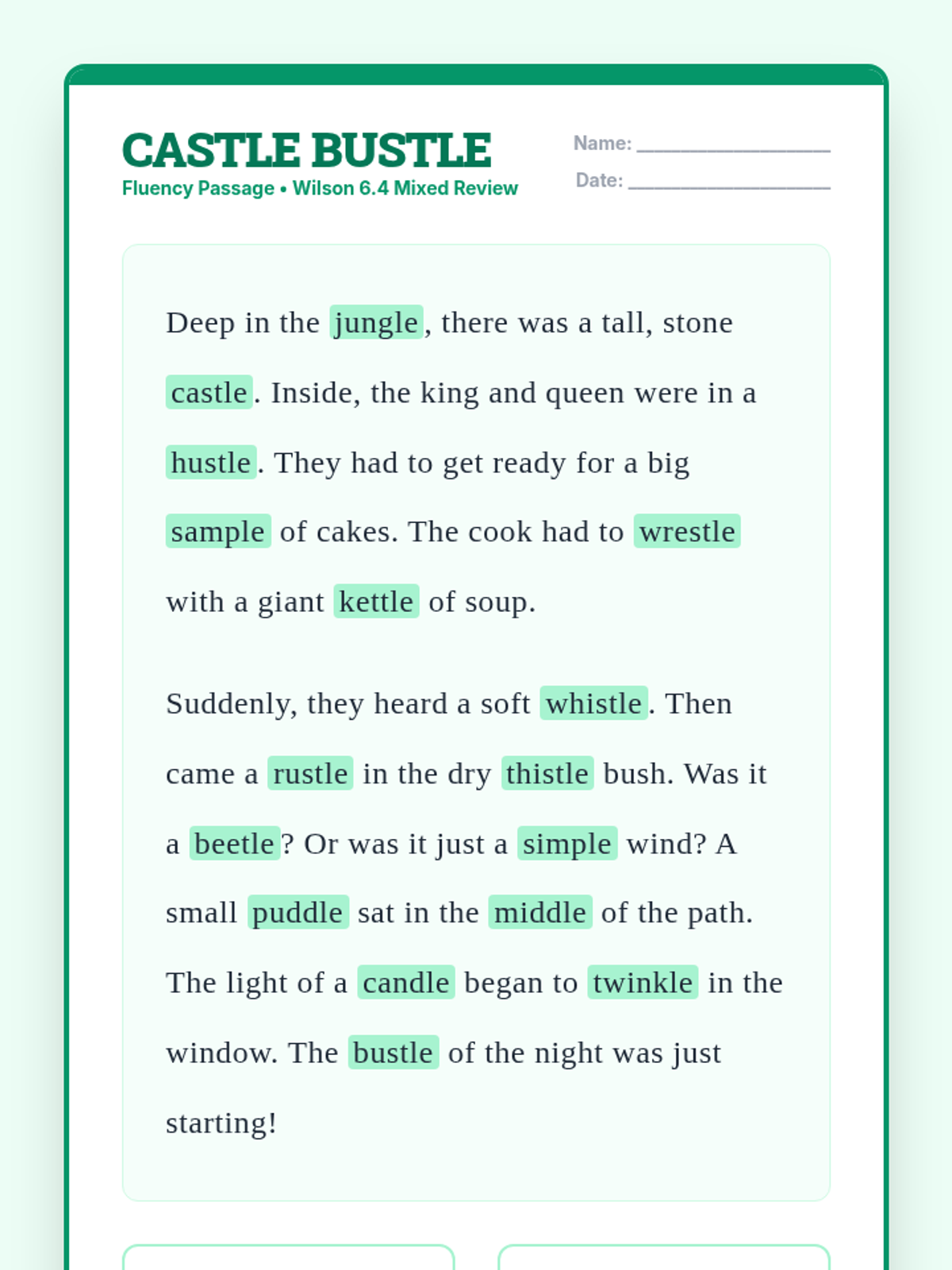 A lesson focusing on consonant-le syllables (Wilson 6.4), including mixed review and the silent-t -stle pattern. Students will practice syllable division and reading fluency.
