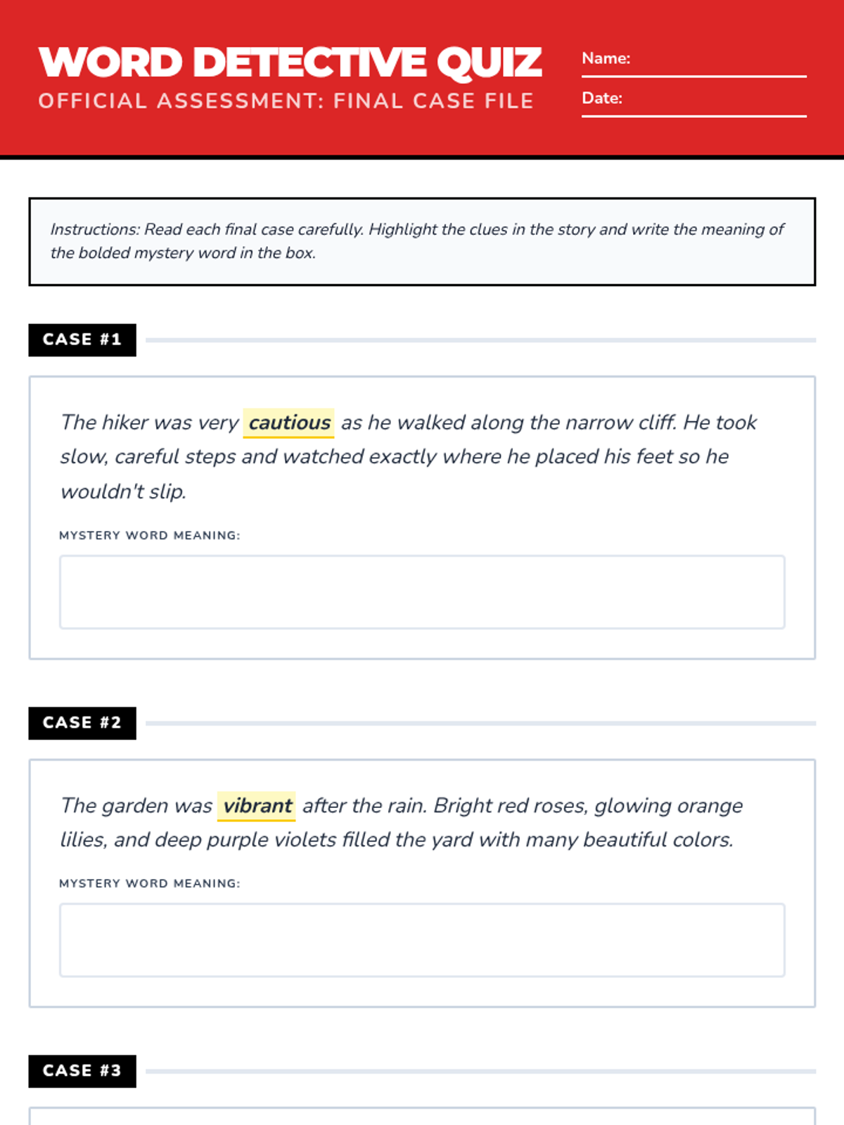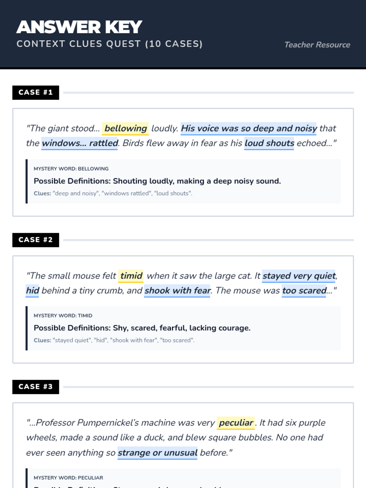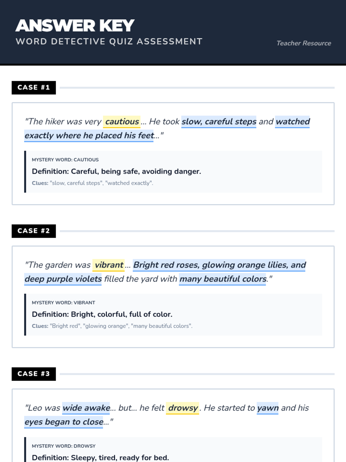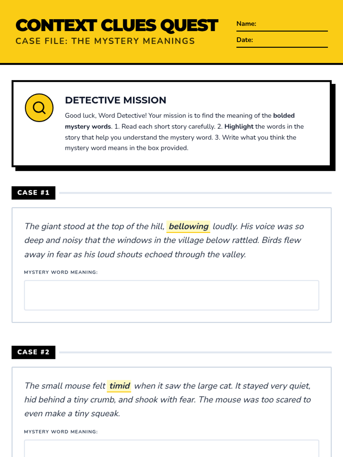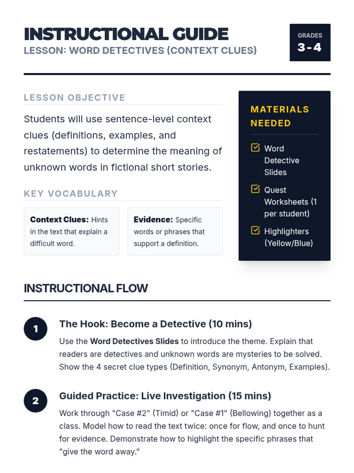 A lesson focused on helping third graders identify the meaning of unknown words using context clues in fictional short stories. Students act as 'Word Detectives' to highlight evidence and define mystery words.