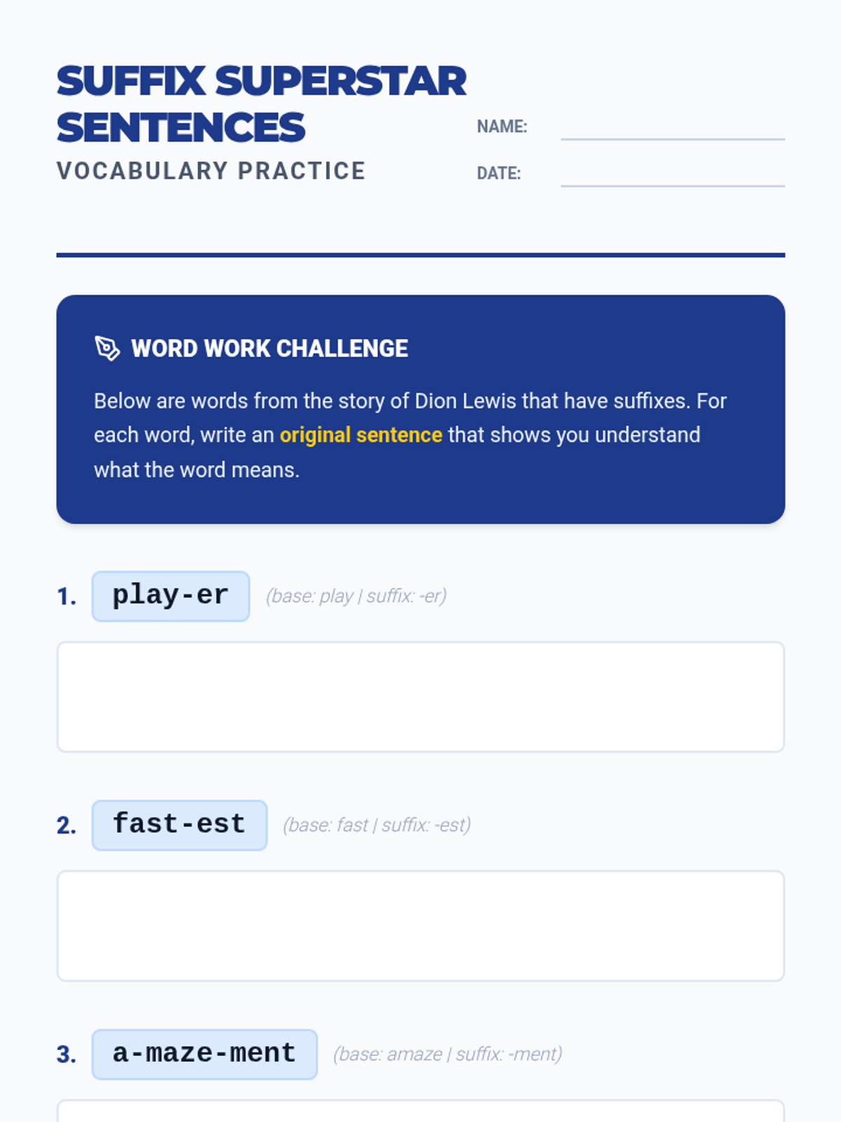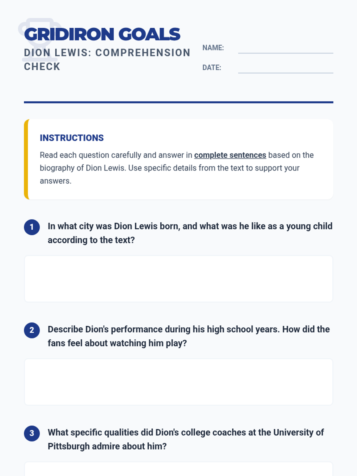A lesson exploring the biography of NFL player Dion Lewis, focusing on character traits, resilience, and identifying words with suffixes.