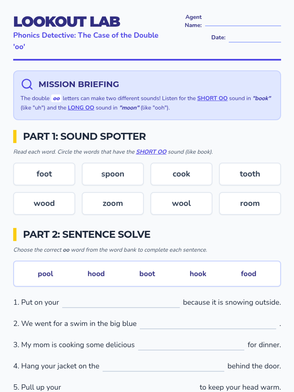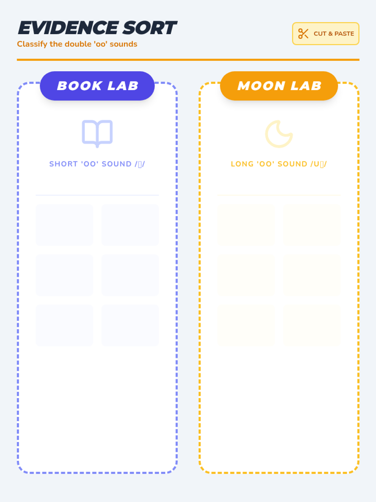 A focused phonics lesson exploring the two sounds of the 'oo' digraph through guided practice and hands-on sorting. Students will distinguish between the short 'oo' (as in book) and the long 'oo' (as in moon).