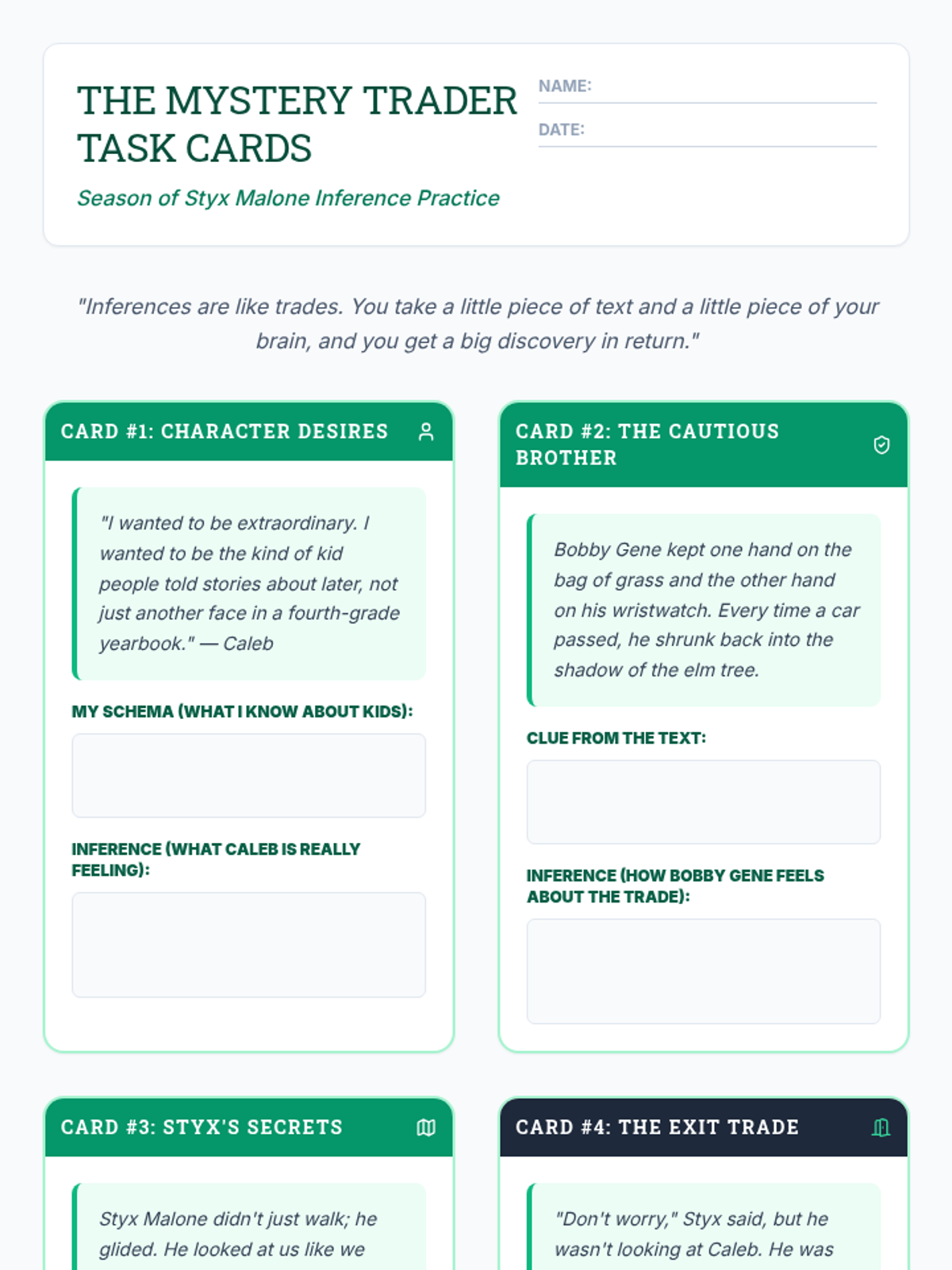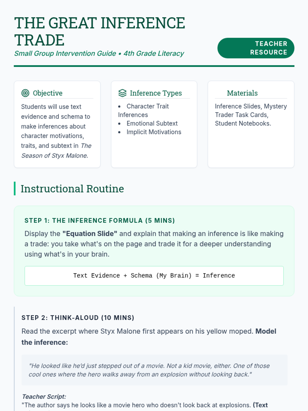 A targeted small-group intervention focusing on making inferences using key moments and character dynamics from 'The Season of Styx Malone'. Students will practice combining text evidence with background knowledge to uncover deeper meanings.
