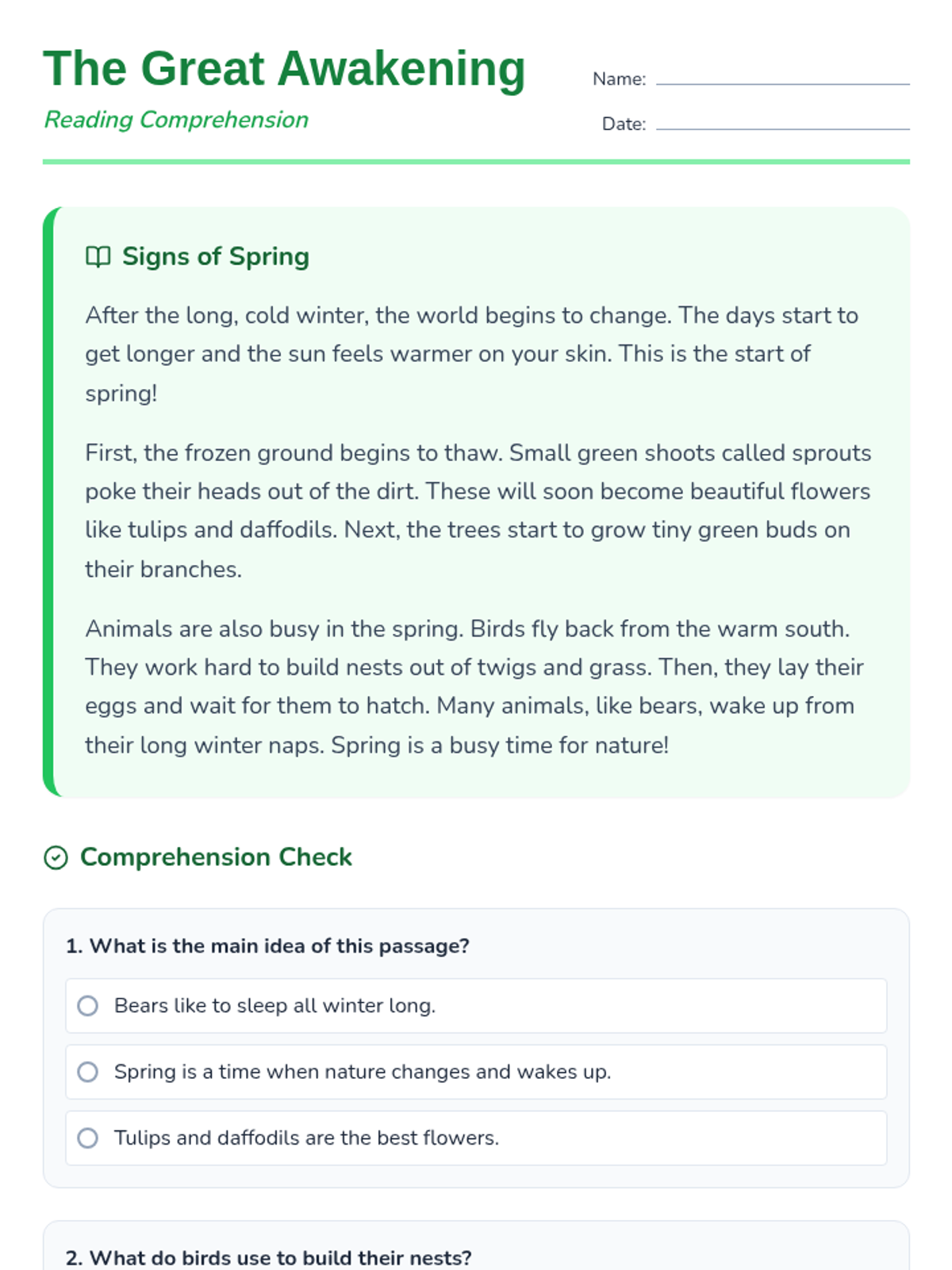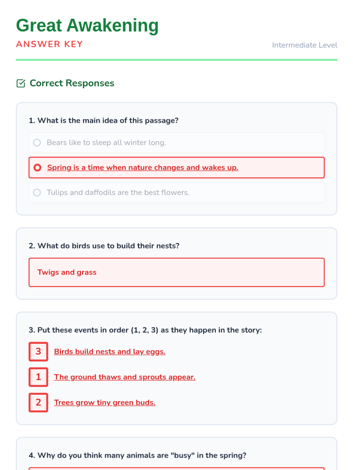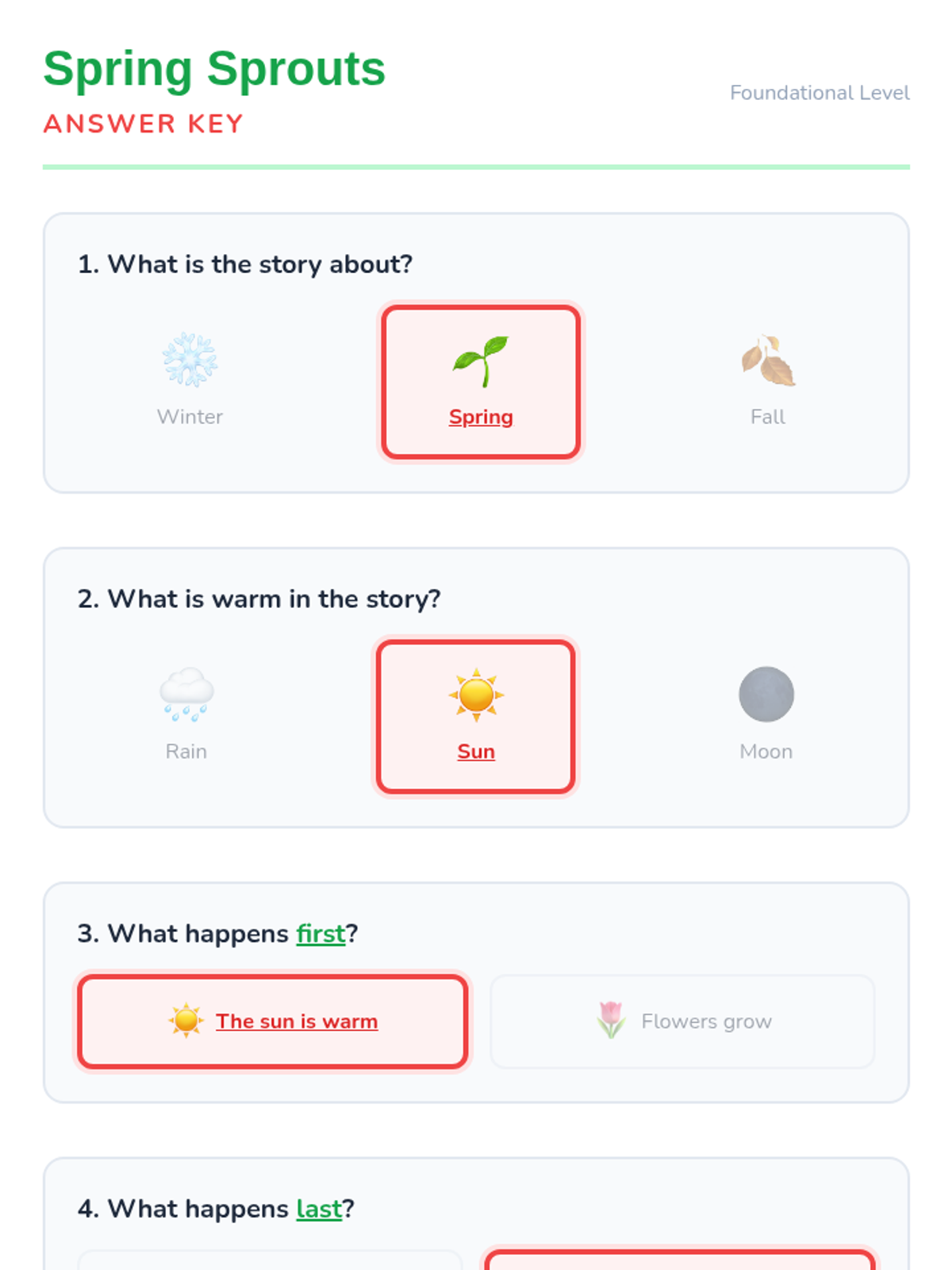 A tiered reading lesson exploring the signs and science of spring across three grade levels (K, 2, and 4), focusing on main ideas and sequencing.