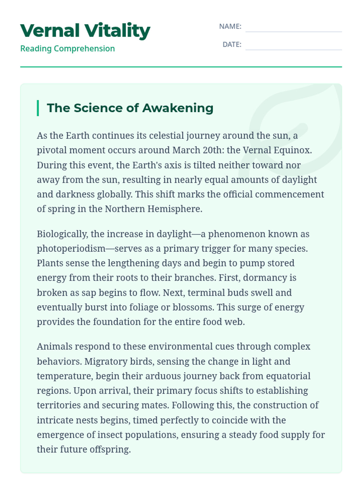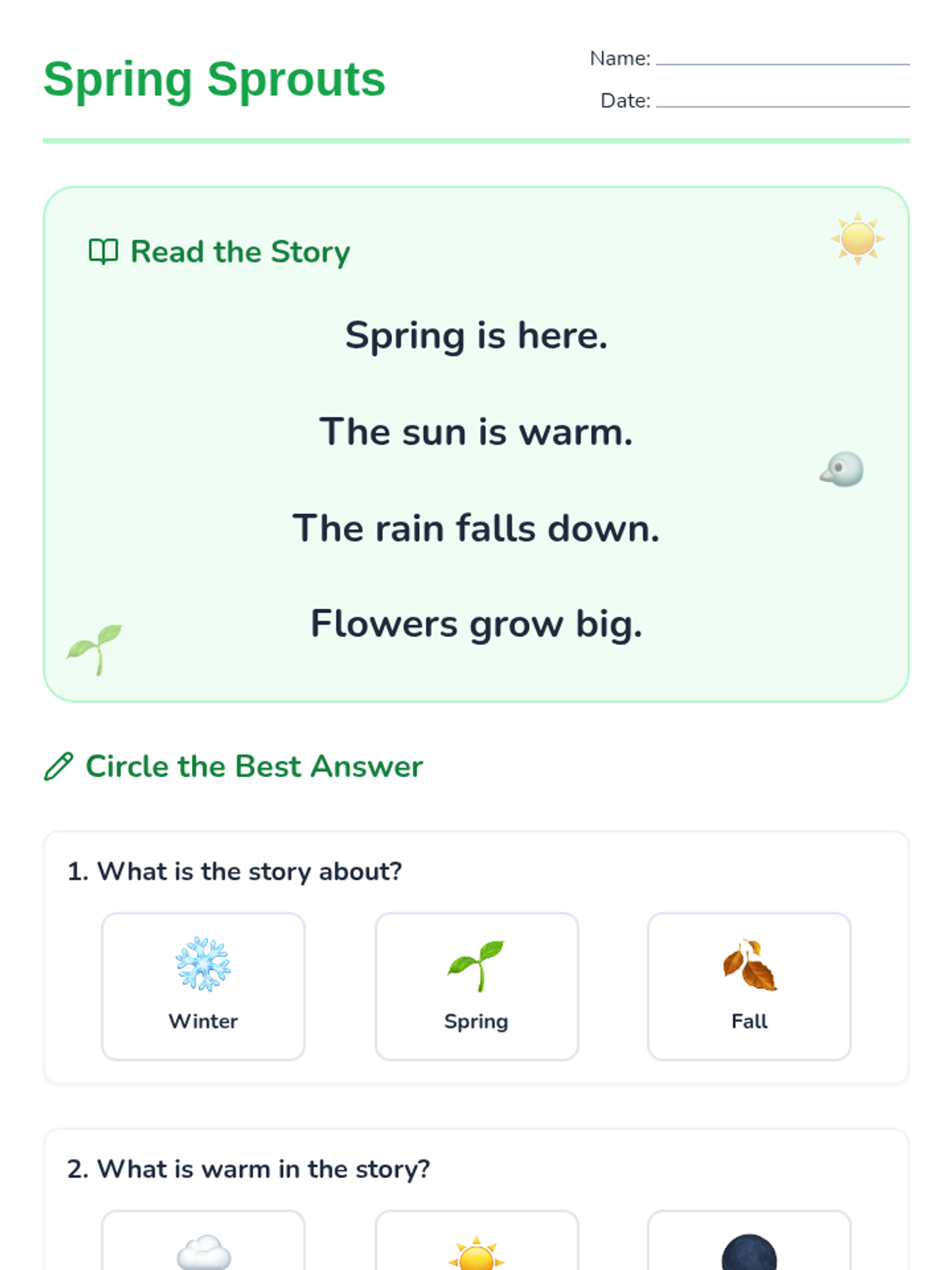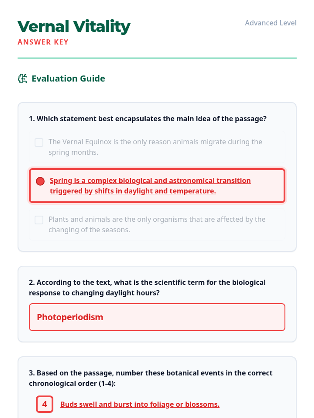 A tiered reading lesson exploring the signs and science of spring across three grade levels (K, 2, and 4), focusing on main ideas and sequencing.