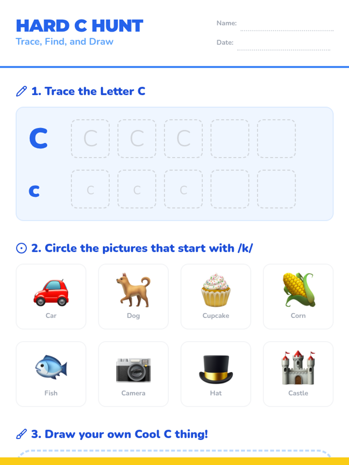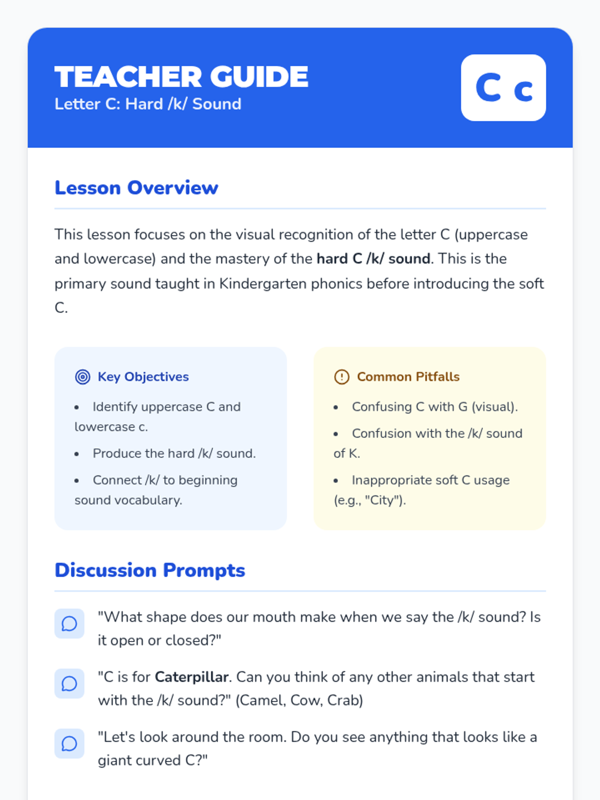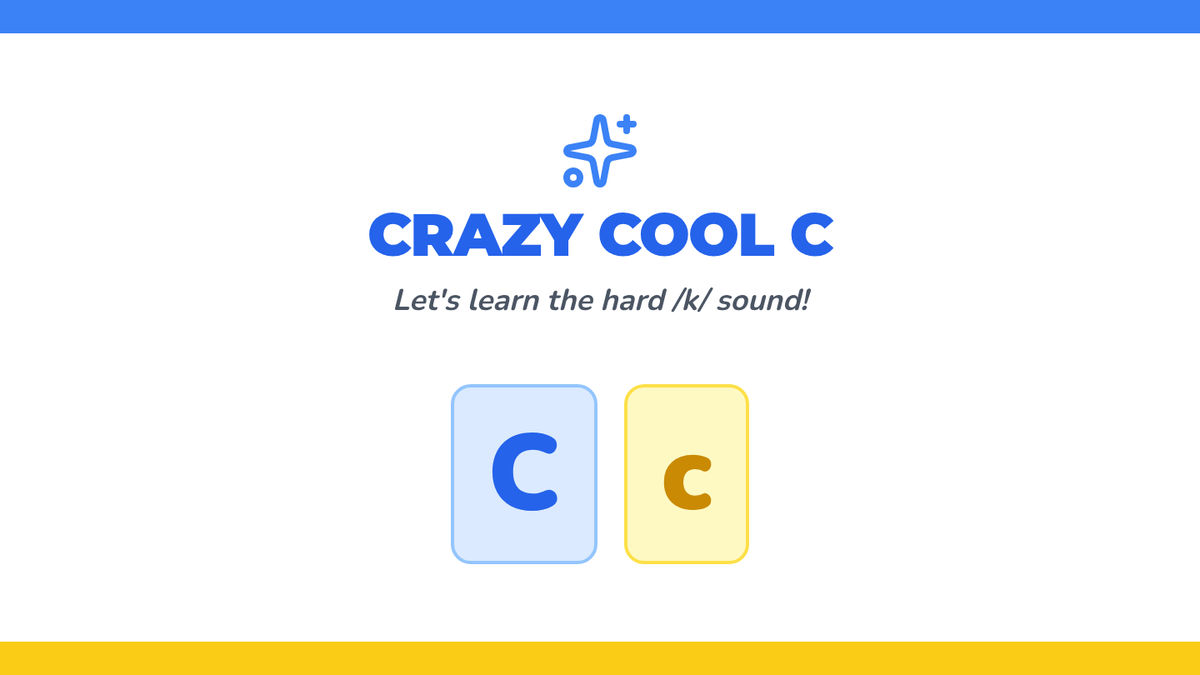 A comprehensive review of the letter C, focusing on the hard /k/ sound through visual recognition and high-interest vocabulary.