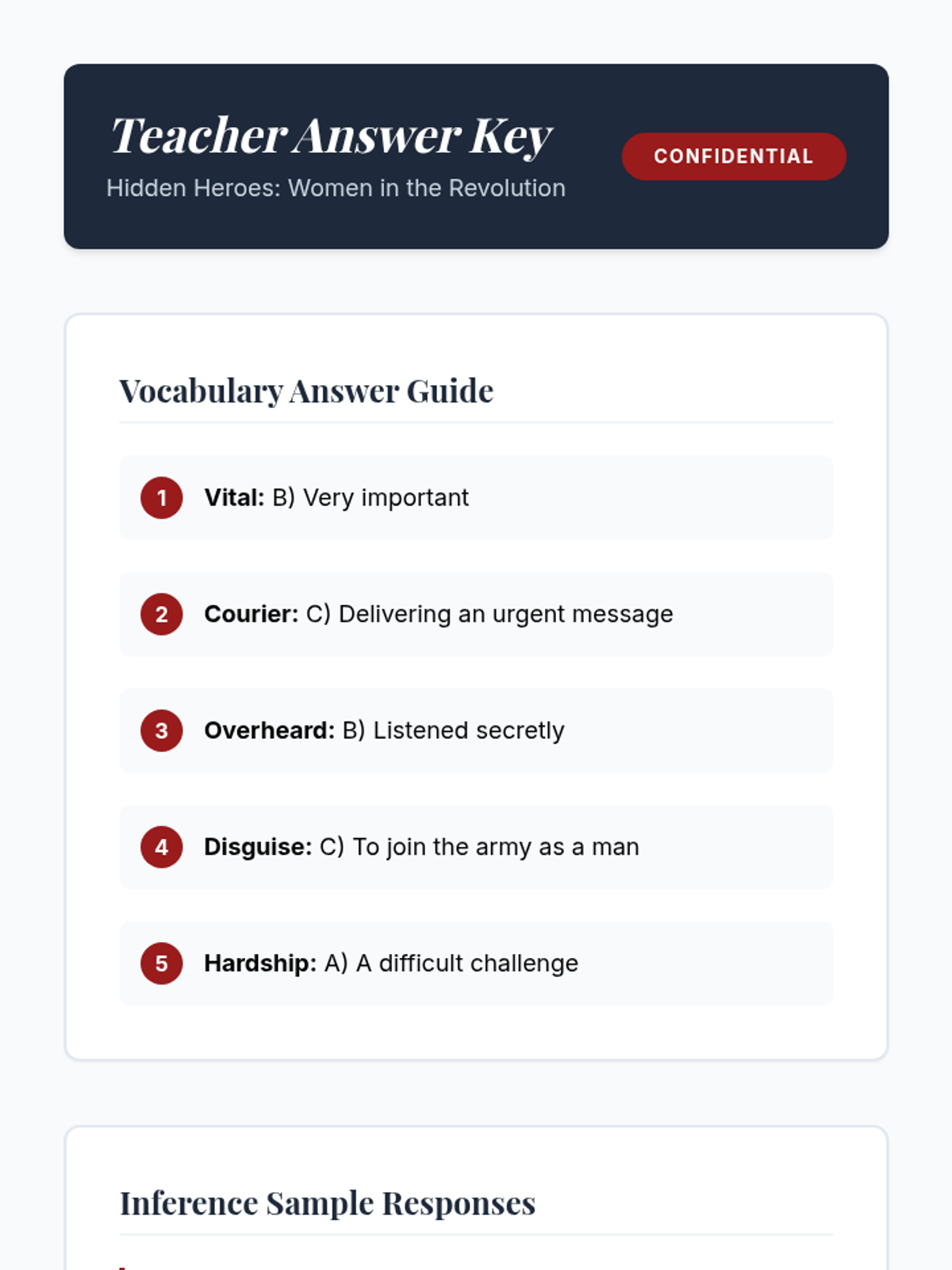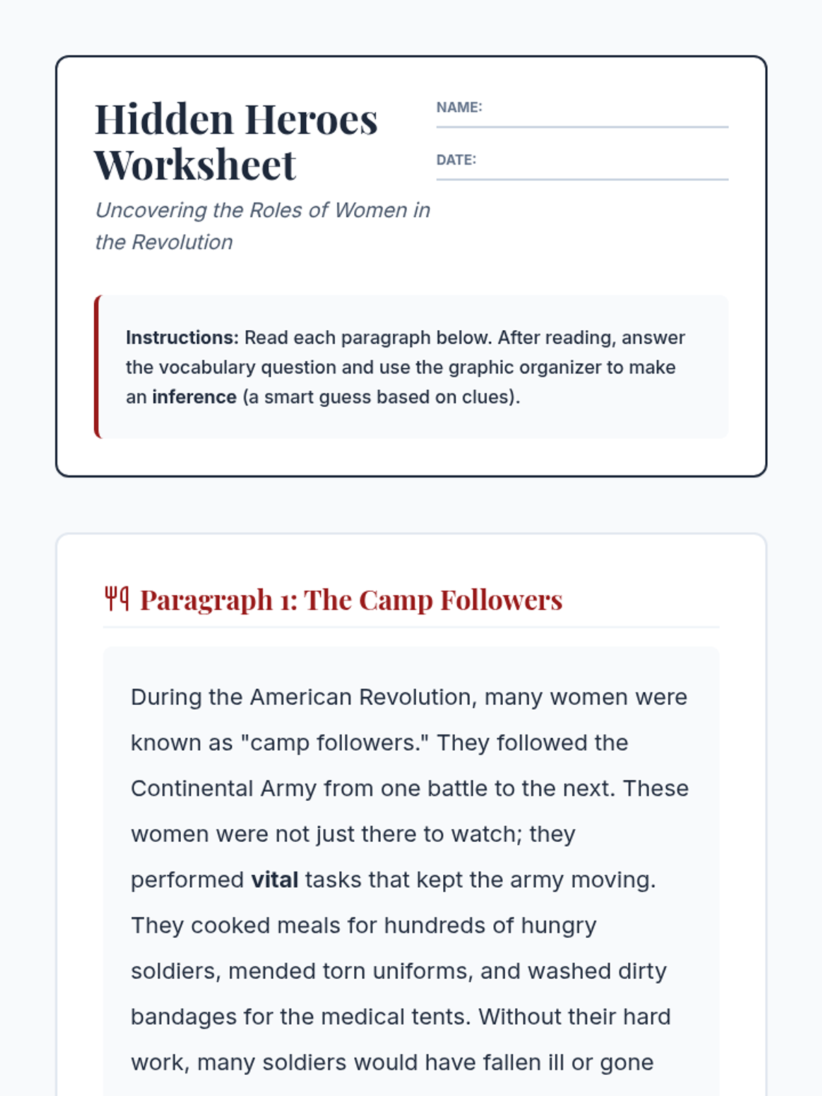 A reading comprehension lesson focused on the diverse roles women played during the American Revolution, targeting inference skills and vocabulary development for 4th-grade students.