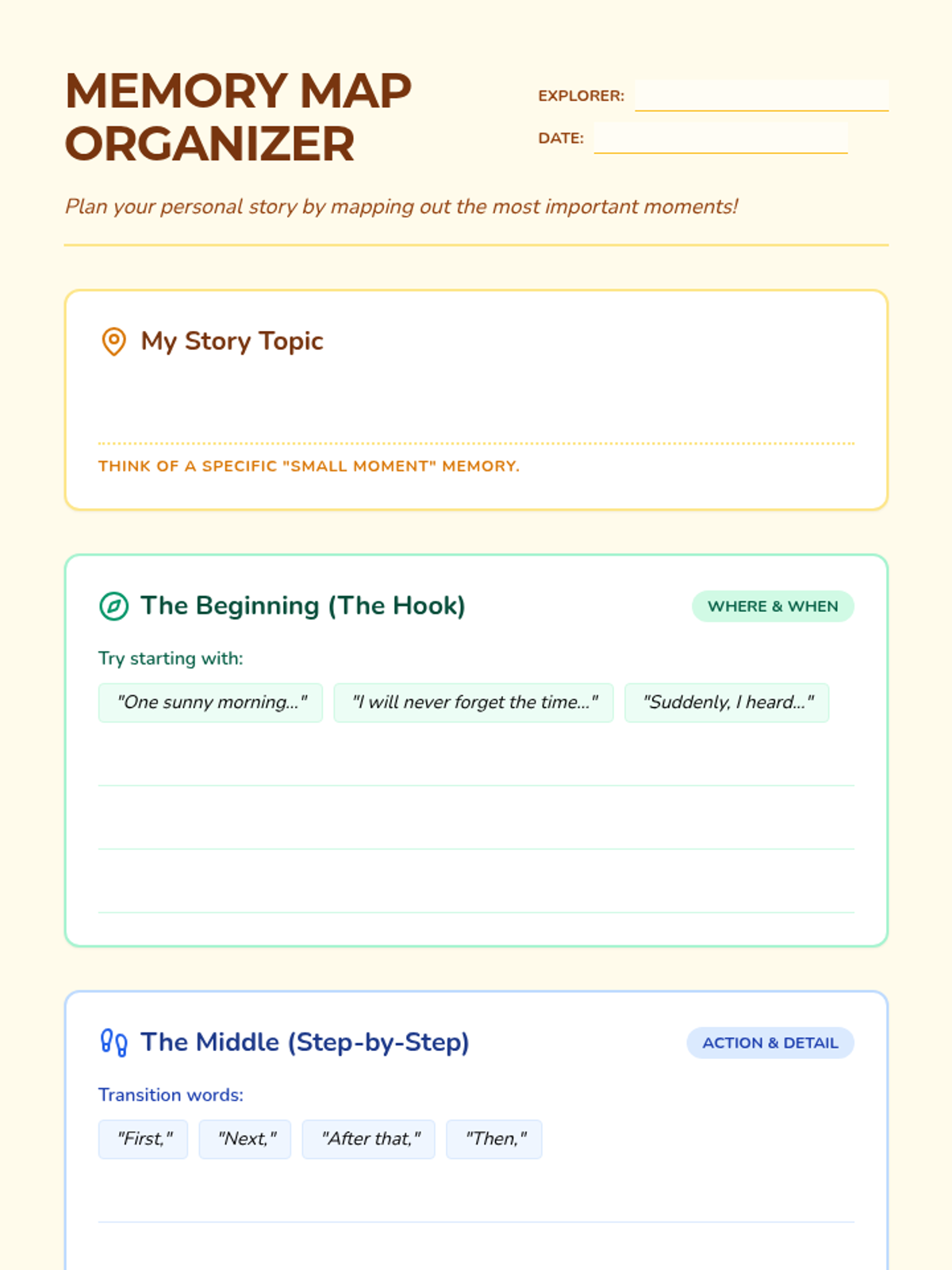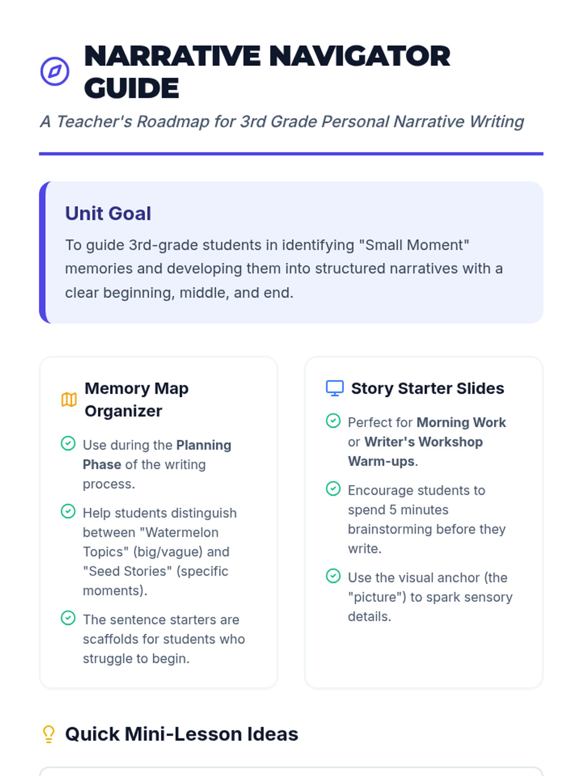 A collection of resources to help 3rd graders craft personal narratives, including a structured graphic organizer, visual writing prompts, and instructional support for teachers.