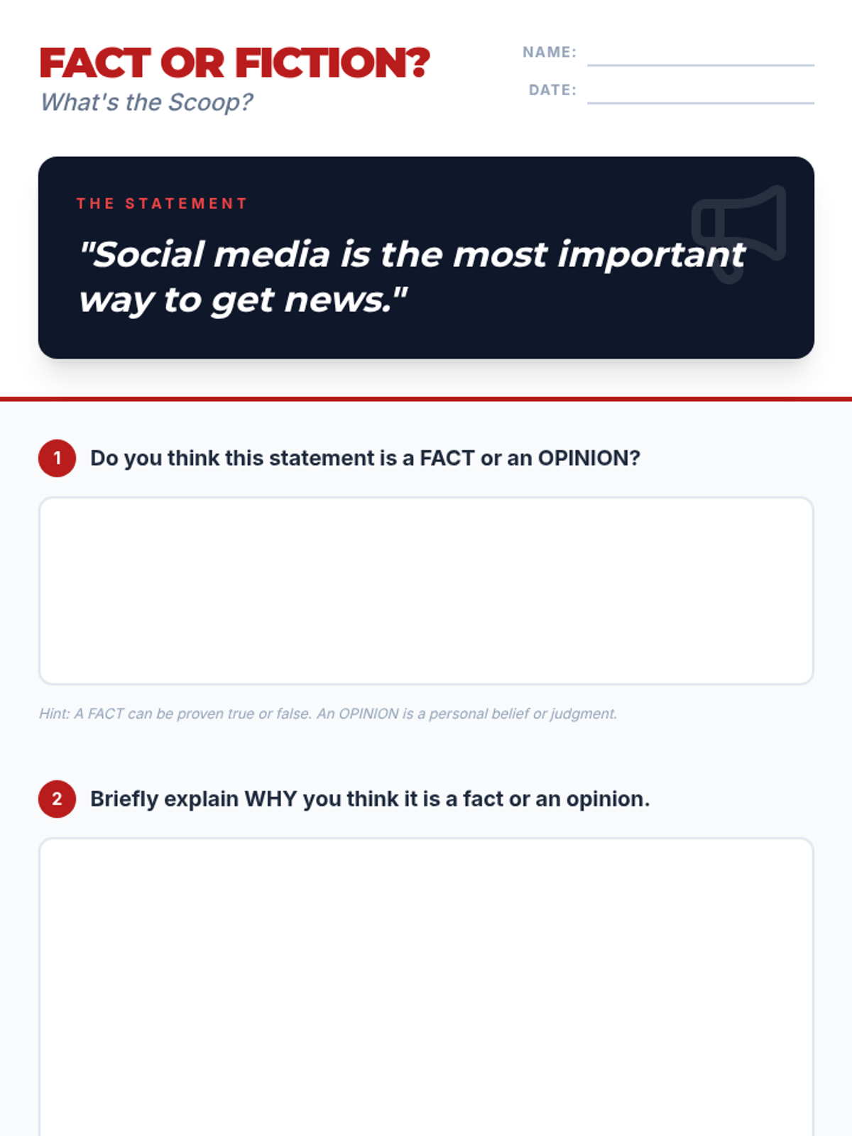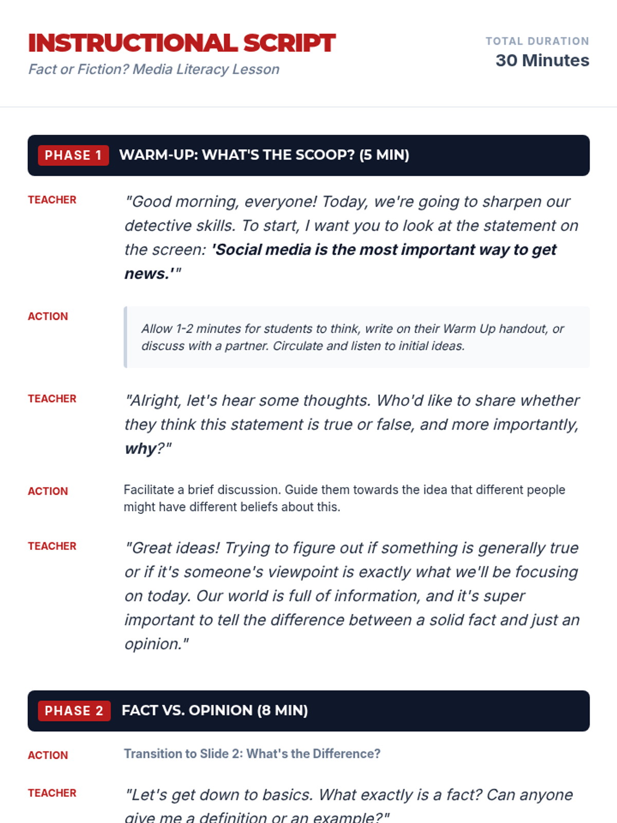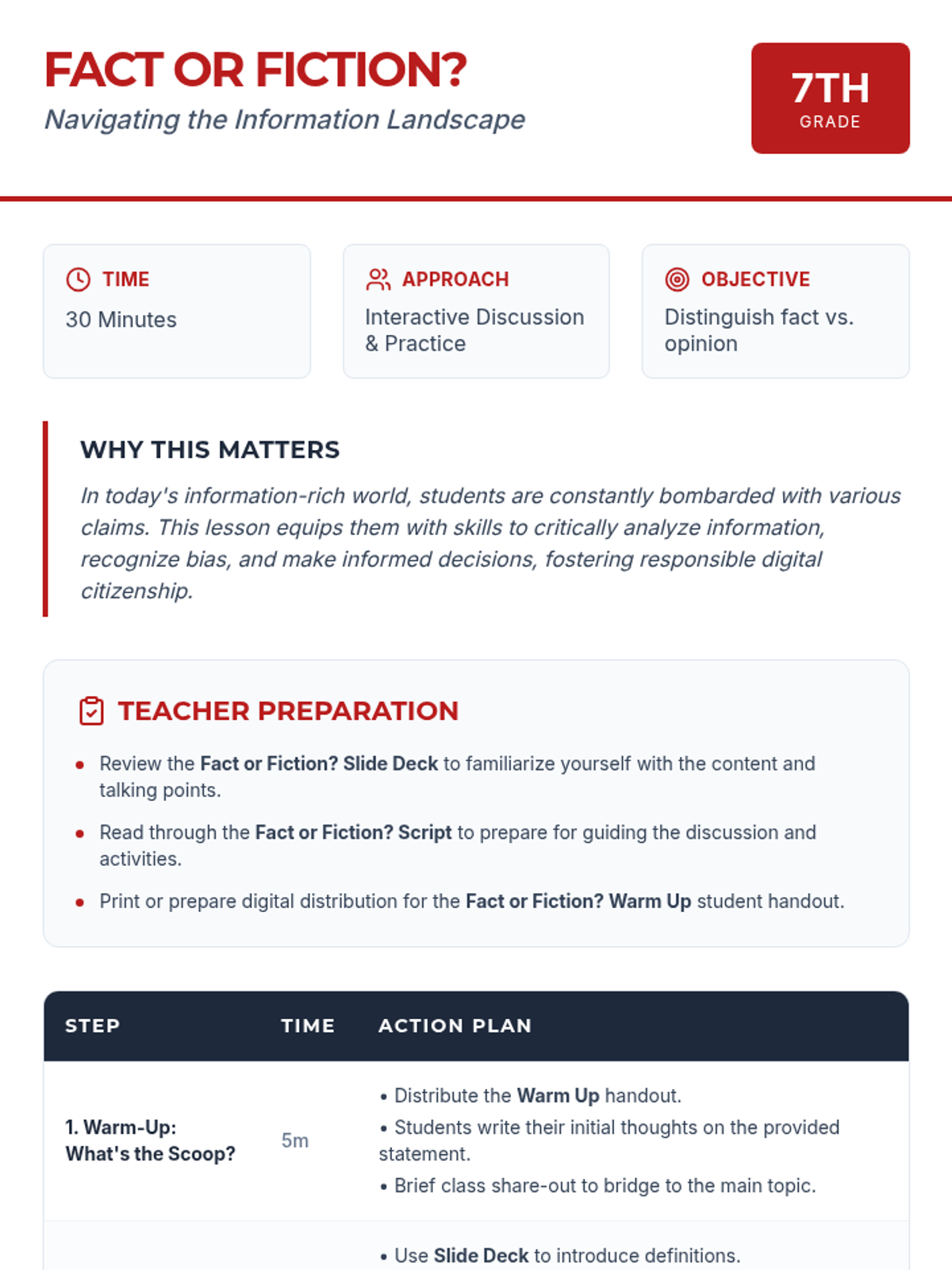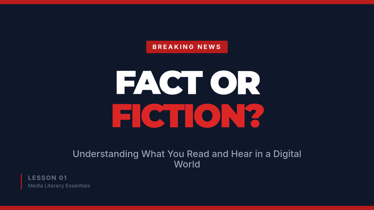 A 30-minute media literacy lesson for 7th-grade students focused on distinguishing between facts and opinions in everyday media. Students will practice critical evaluation skills through interactive examples and discussion.