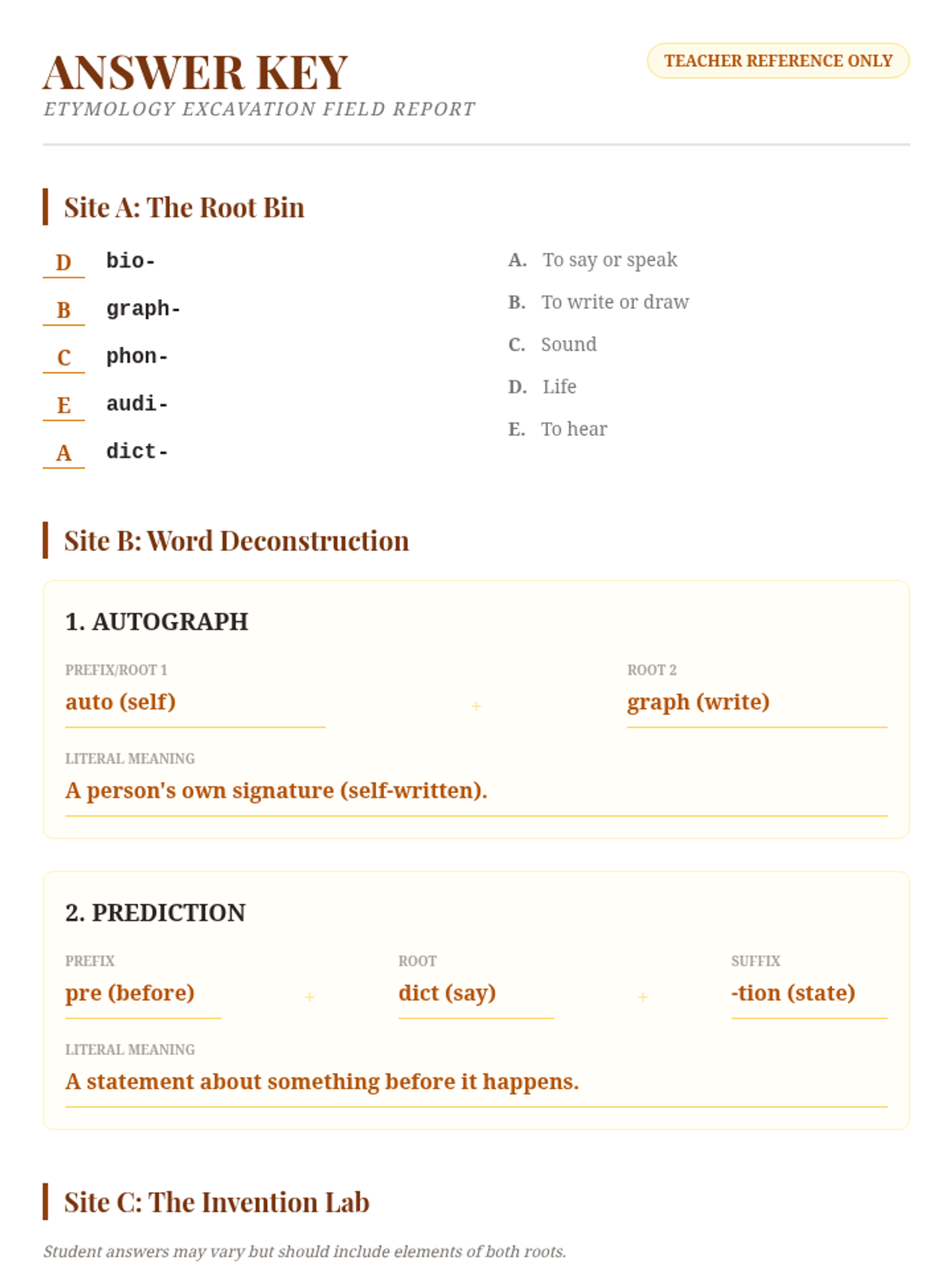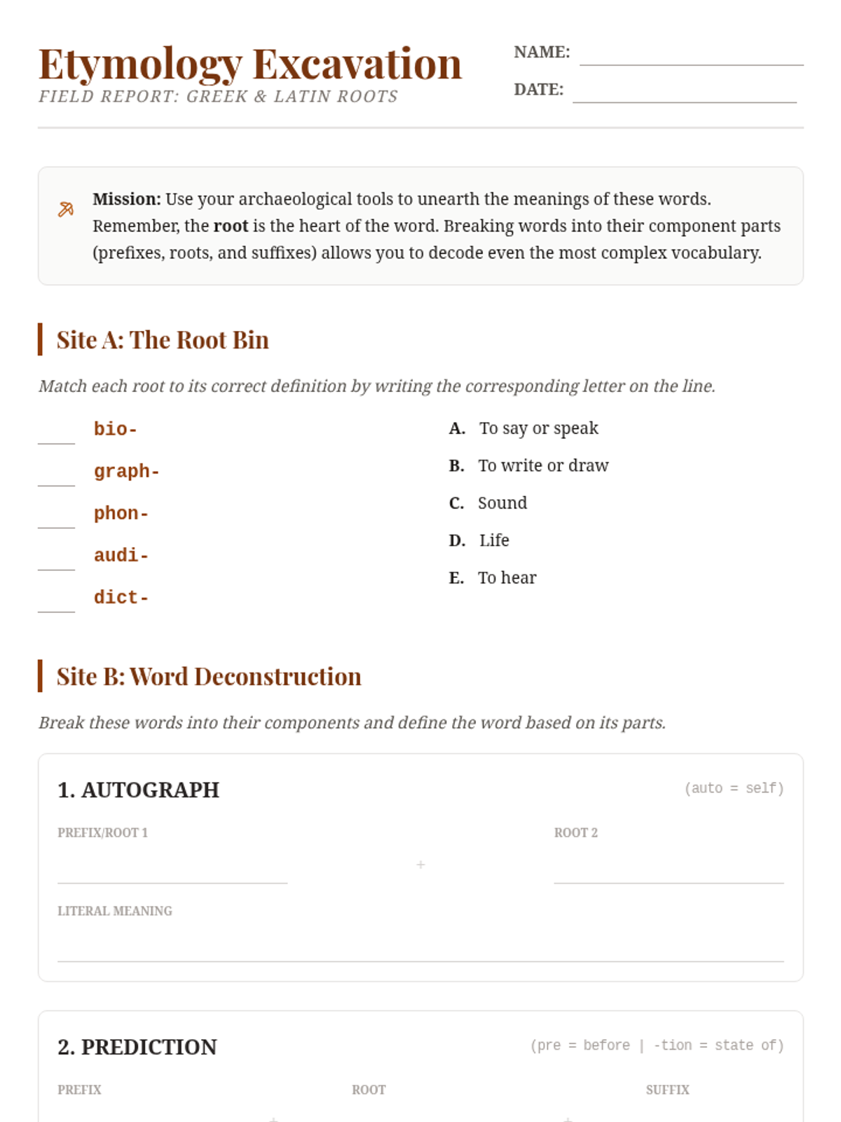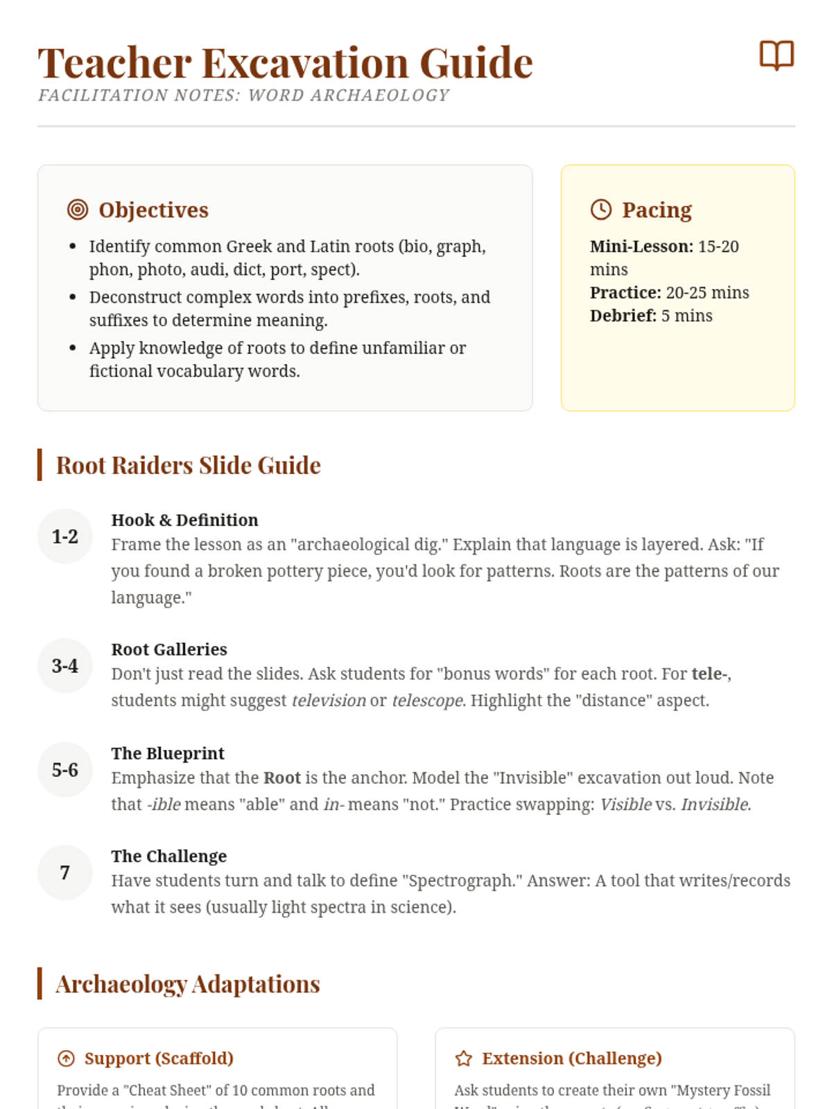 A deep dive into common Greek and Latin roots for 7th graders, using a word archaeology theme to explore how language is built and understood.