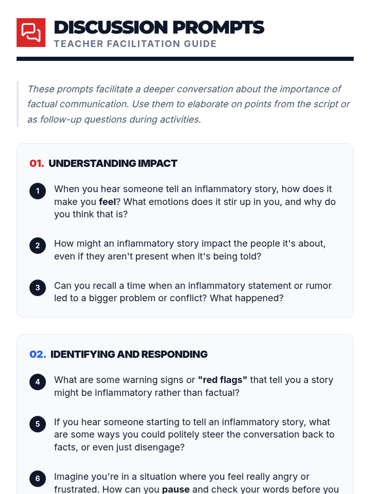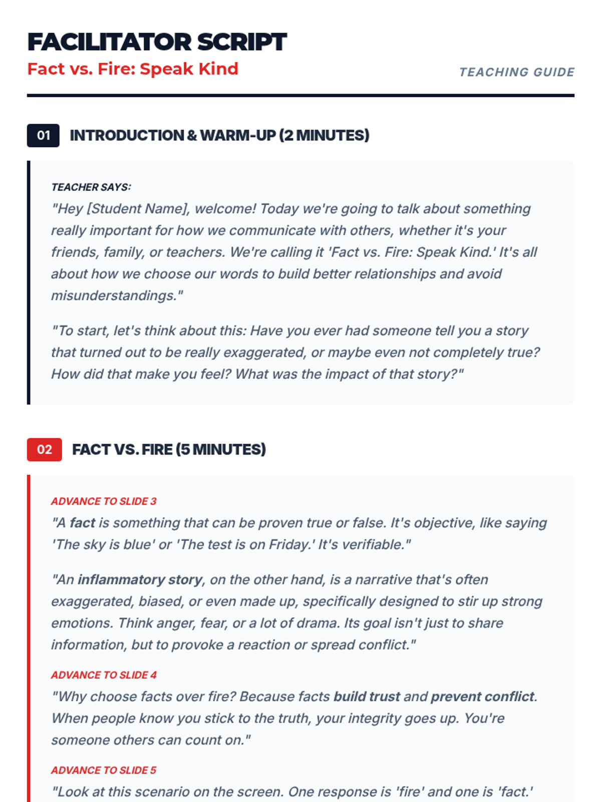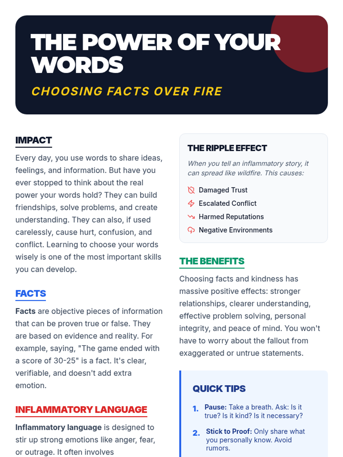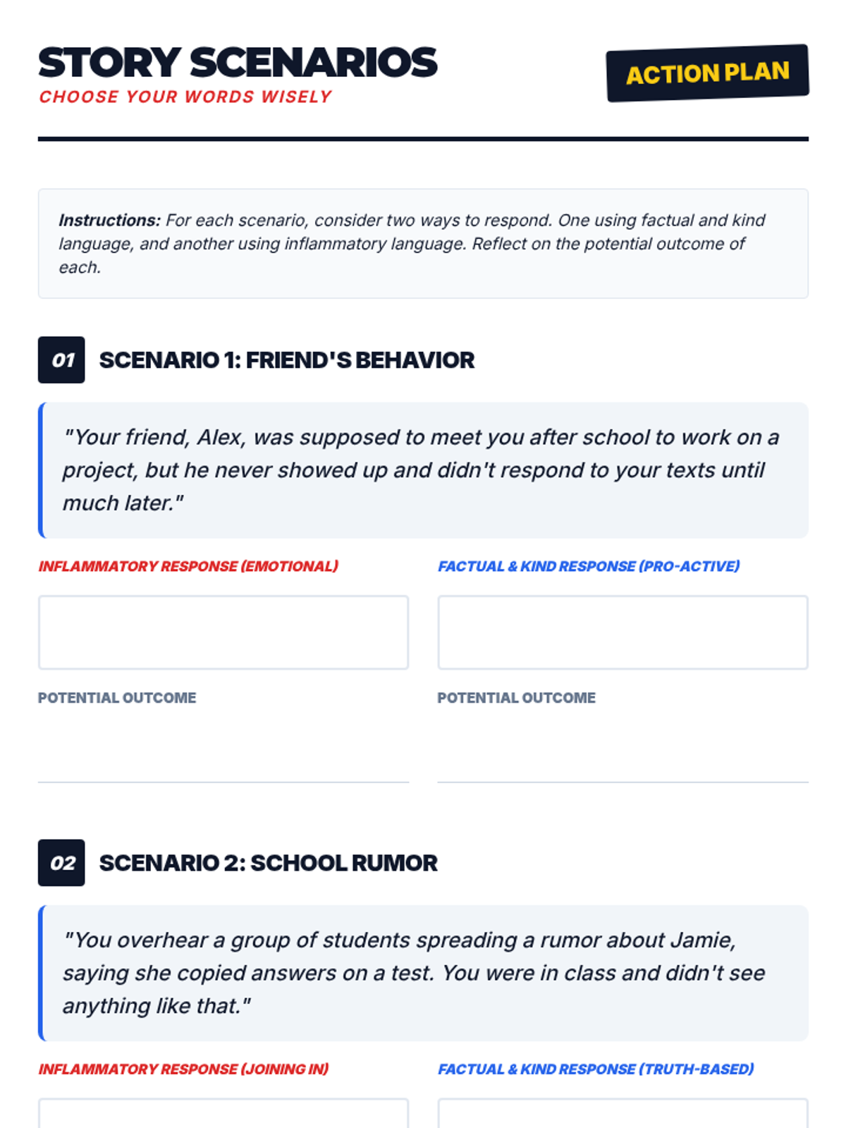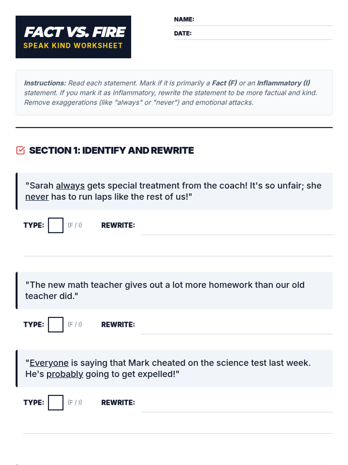 A 15-minute Tier 3 intervention for a 15-year-old male student, focusing on distinguishing factual information from inflammatory language to improve communication and relationships.
